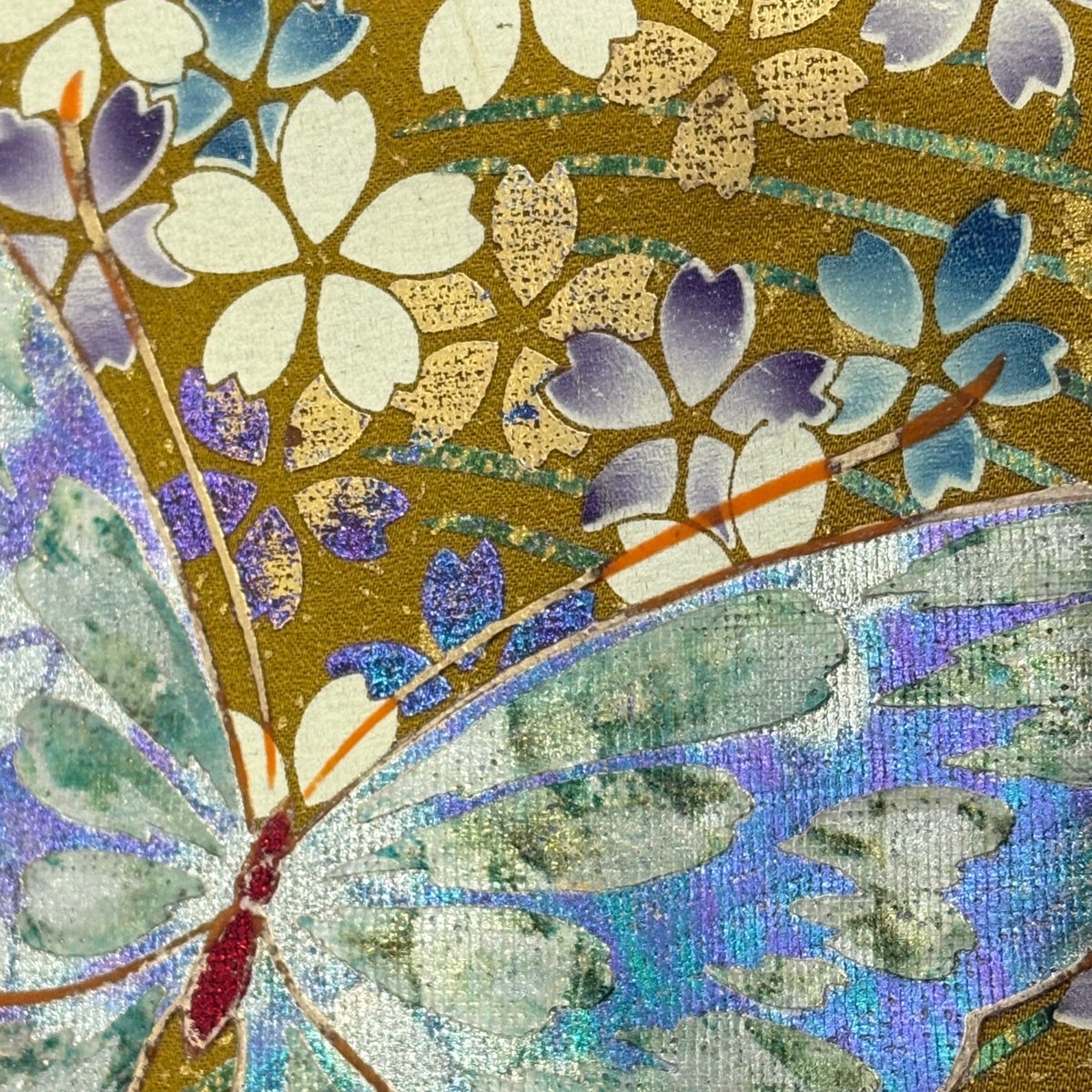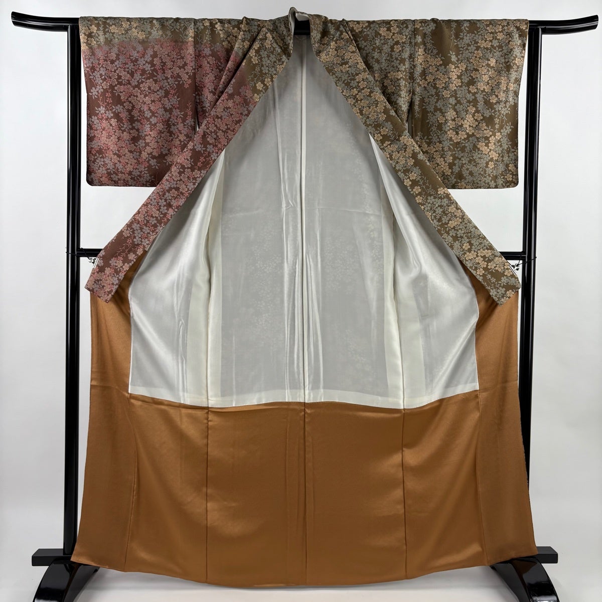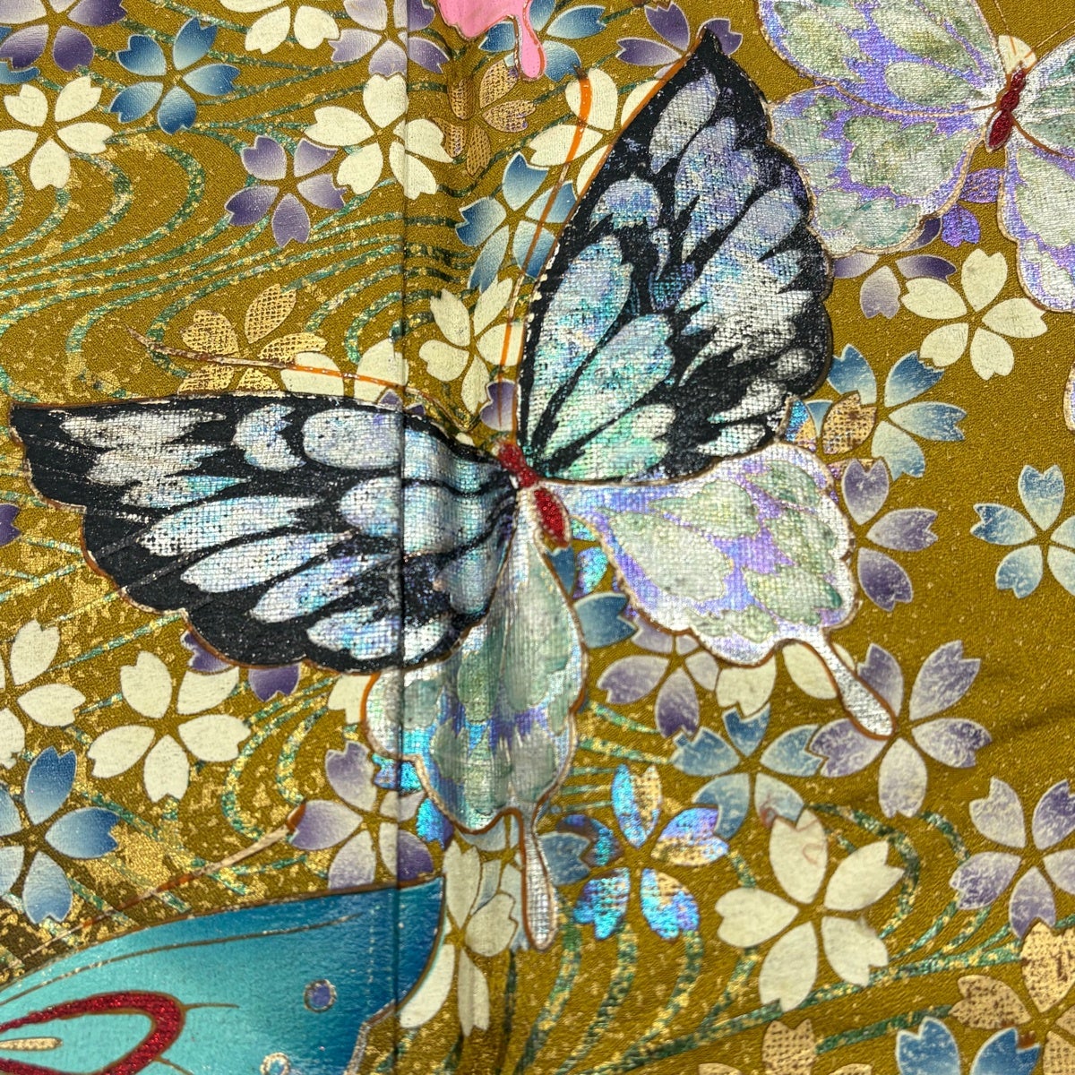 振袖 身丈163cm 裄丈67cm M 袷 蝶 桜 金銀彩 染め分け 黄土色 正絹 秀品