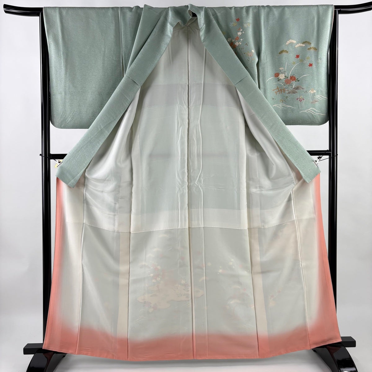 付下げ 身丈158cm 裄丈64.5cm M 袷 桐 草花 絞り 刺繍 薄緑 正絹 秀品