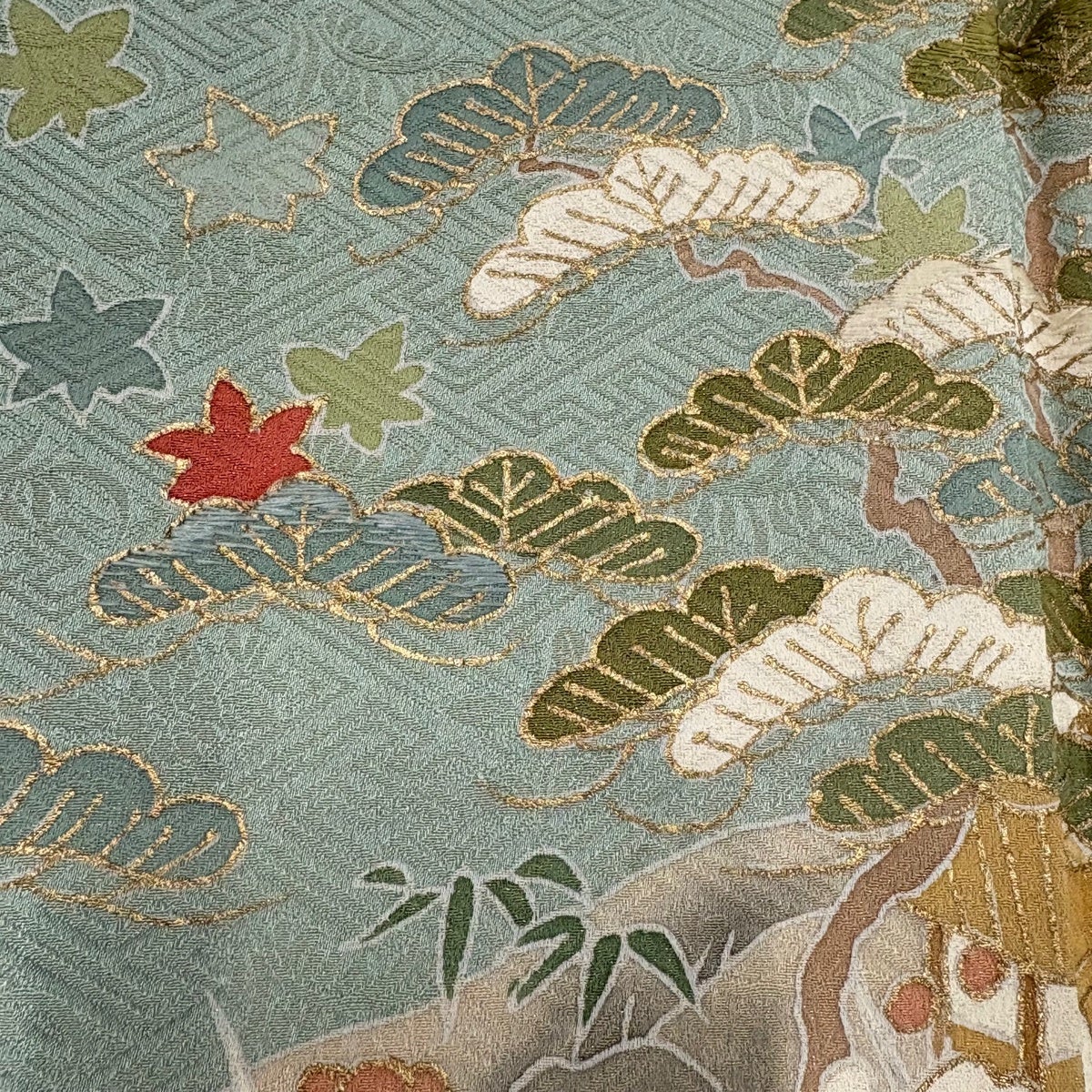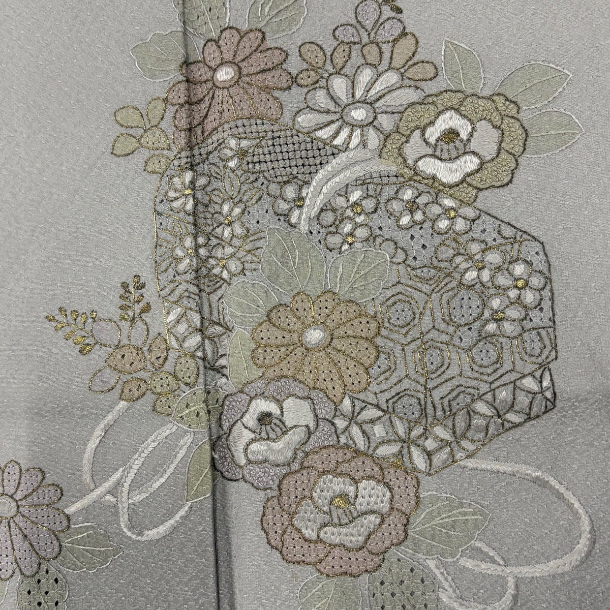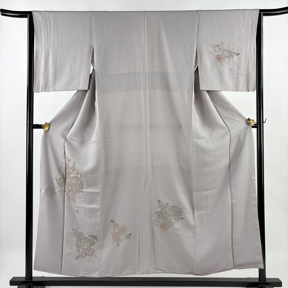 訪問着 身丈163cm 裄丈66cm M 袷 松竹梅 家屋 金彩 刺繍 灰緑 正絹 秀品