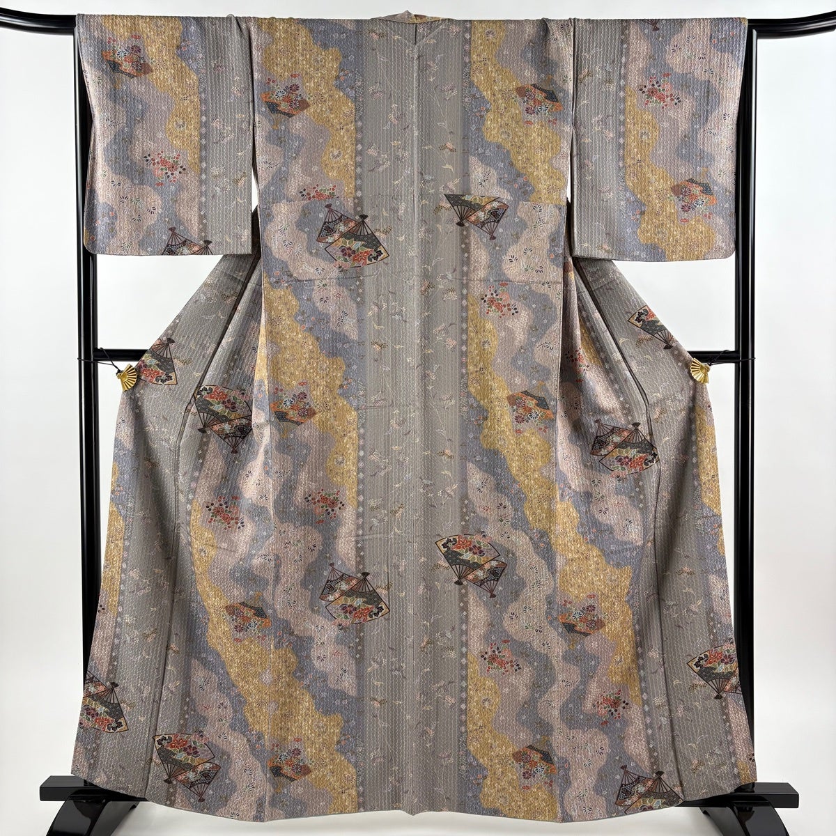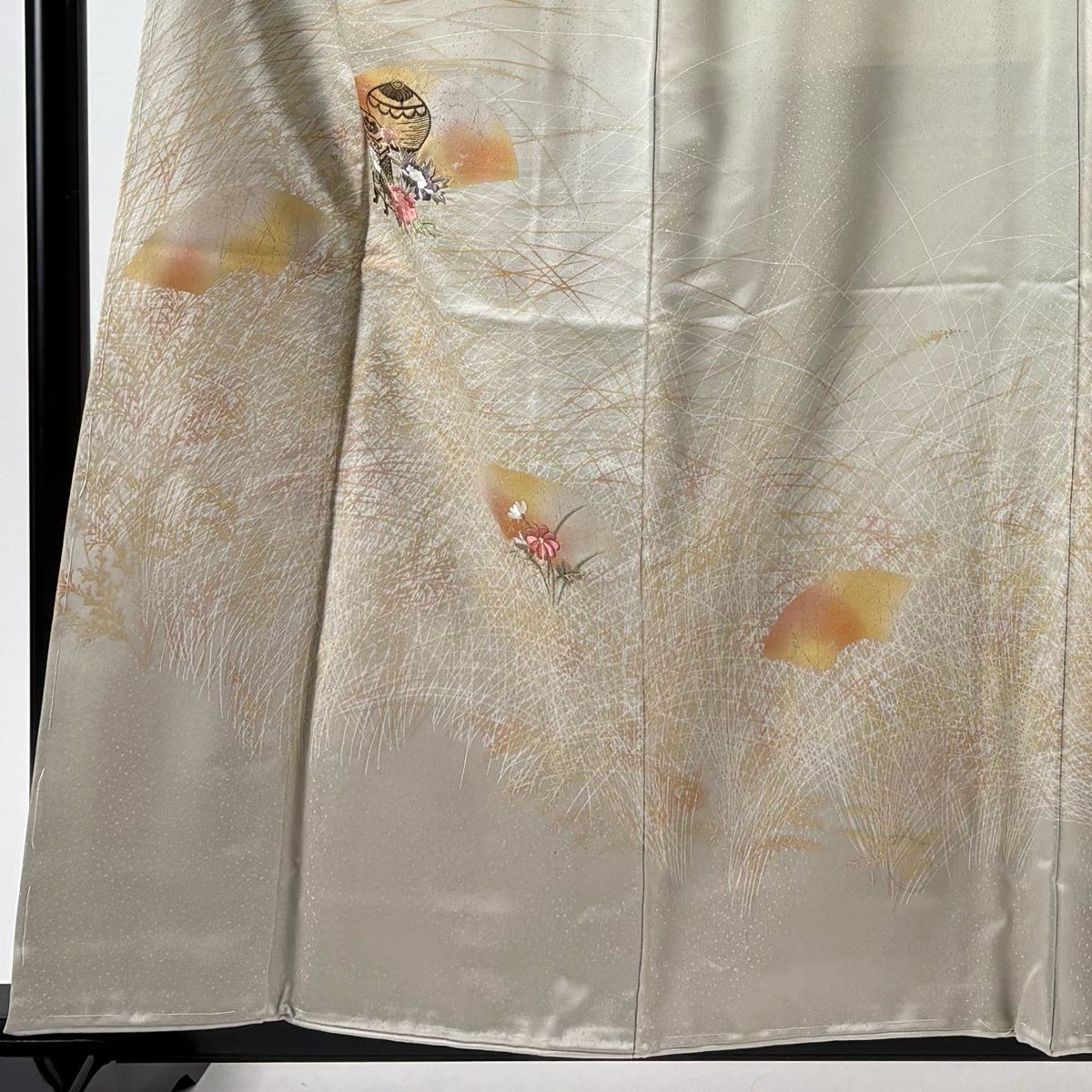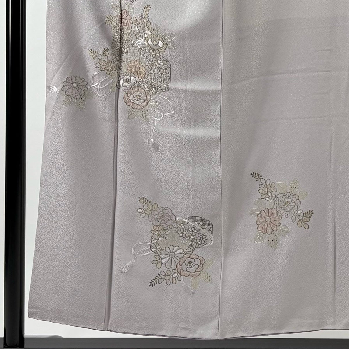 付下げ 身丈164cm 裄丈67.5cm L 袷 扇 草花 金糸 刺繍 薄紫 正絹 秀品