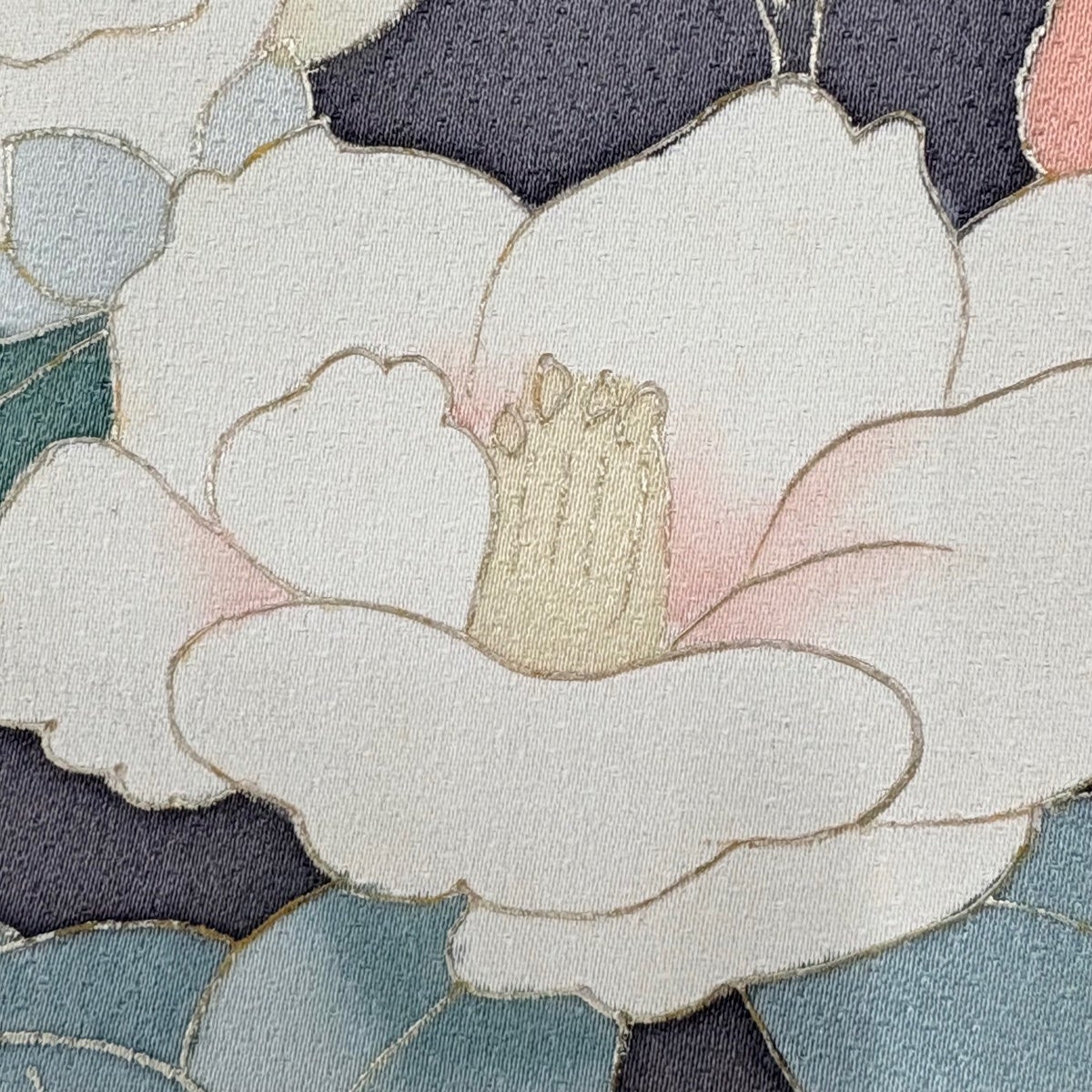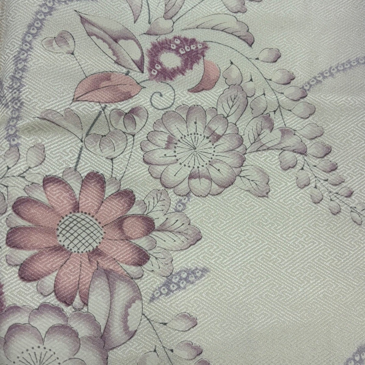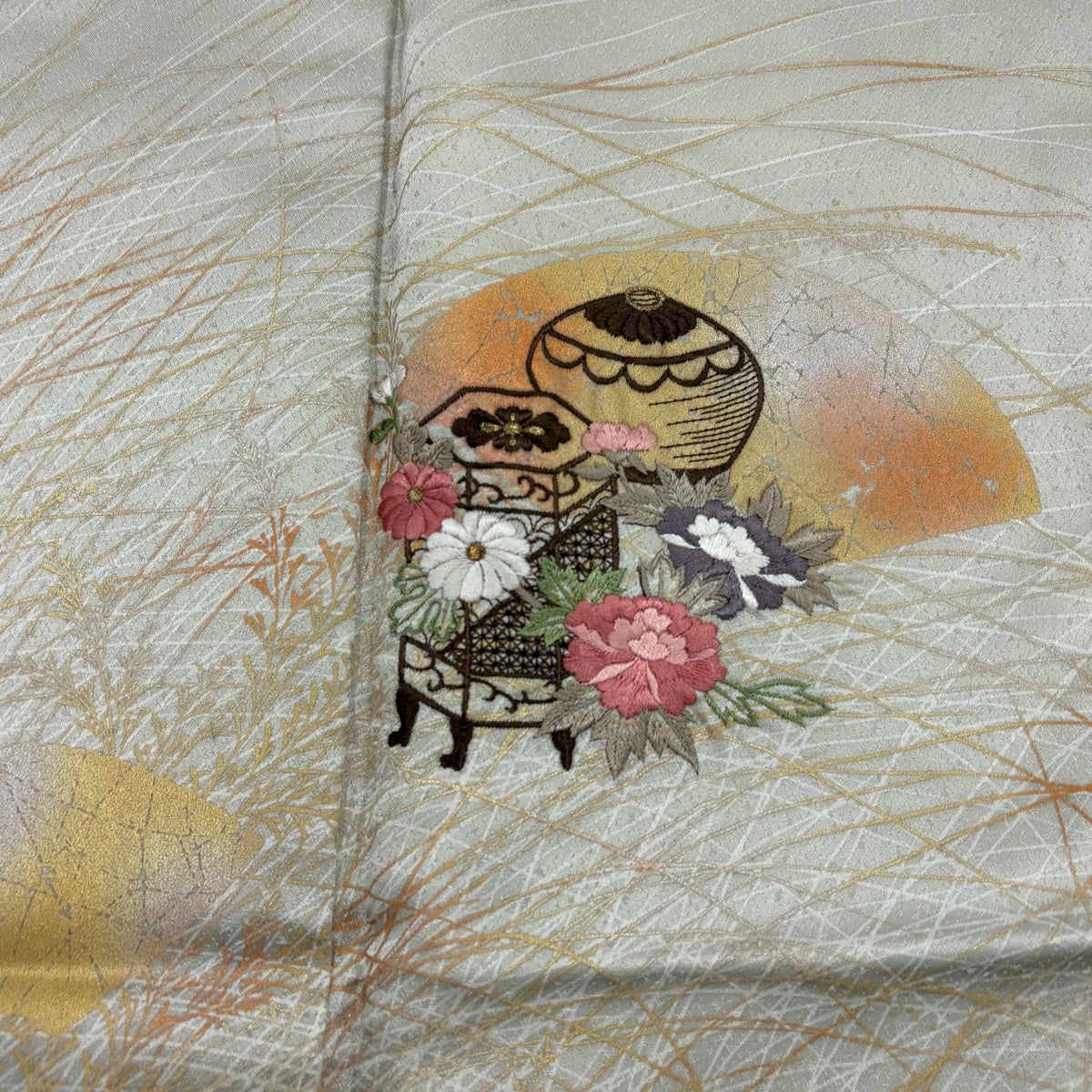 付下げ 身丈164cm 裄丈67.5cm L 袷 扇 草花 金糸 刺繍 薄紫 正絹 秀品