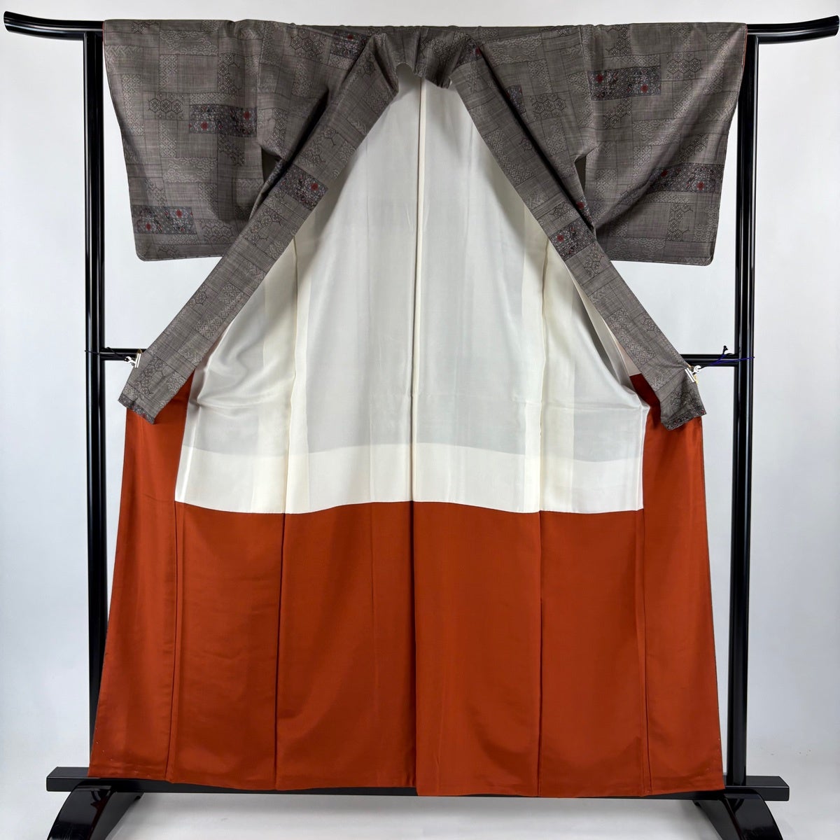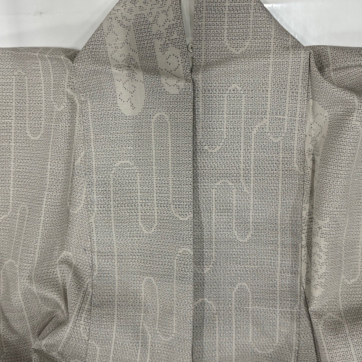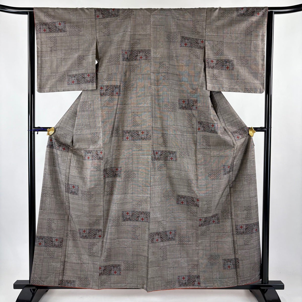 【美品】 紬 身丈160cm 裄丈65cm M 袷 幾何学模様 亀甲絣 灰茶 正絹 秀品