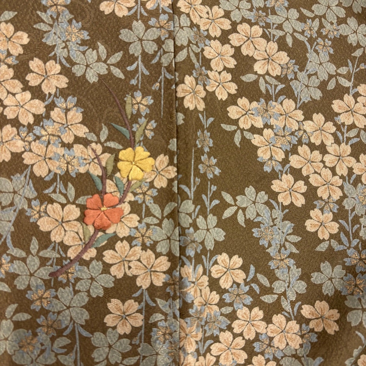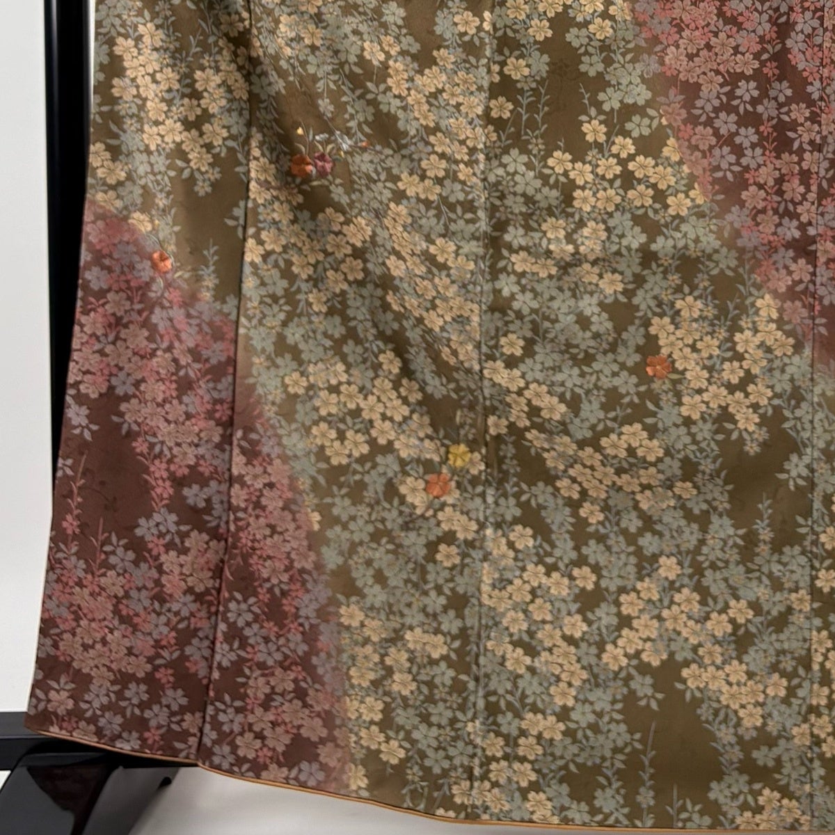 付下げ 身丈163.5cm 裄丈66.5cm M 袷 紬地 草花 宝尽くし 鶯色 正絹 秀品