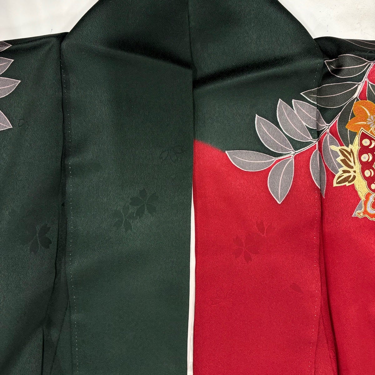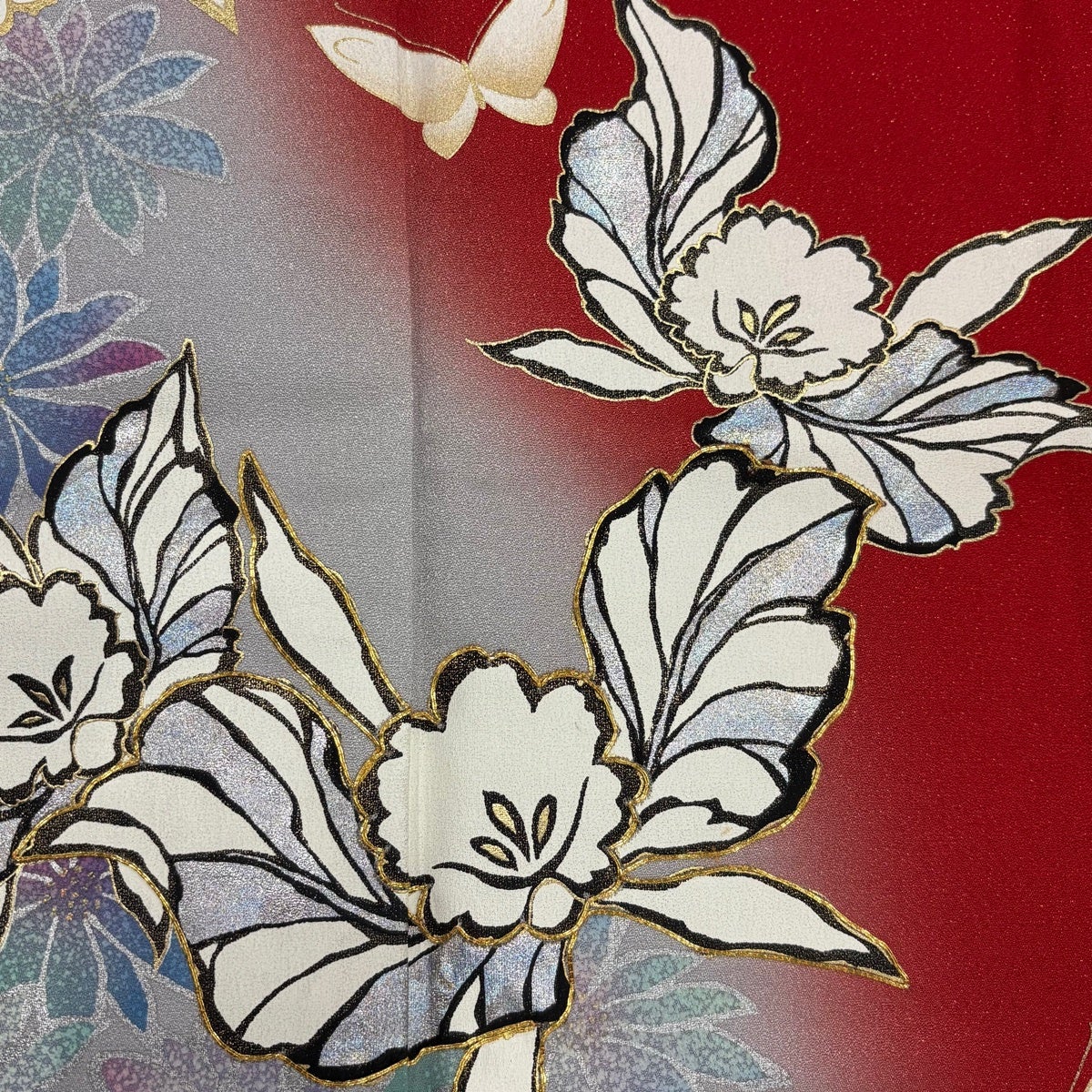 【美品】 振袖 身丈157cm 裄丈67cm M 袷 牡丹 桜 銀通し 箔 赤 正絹 秀品