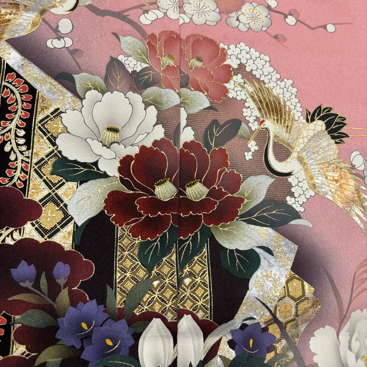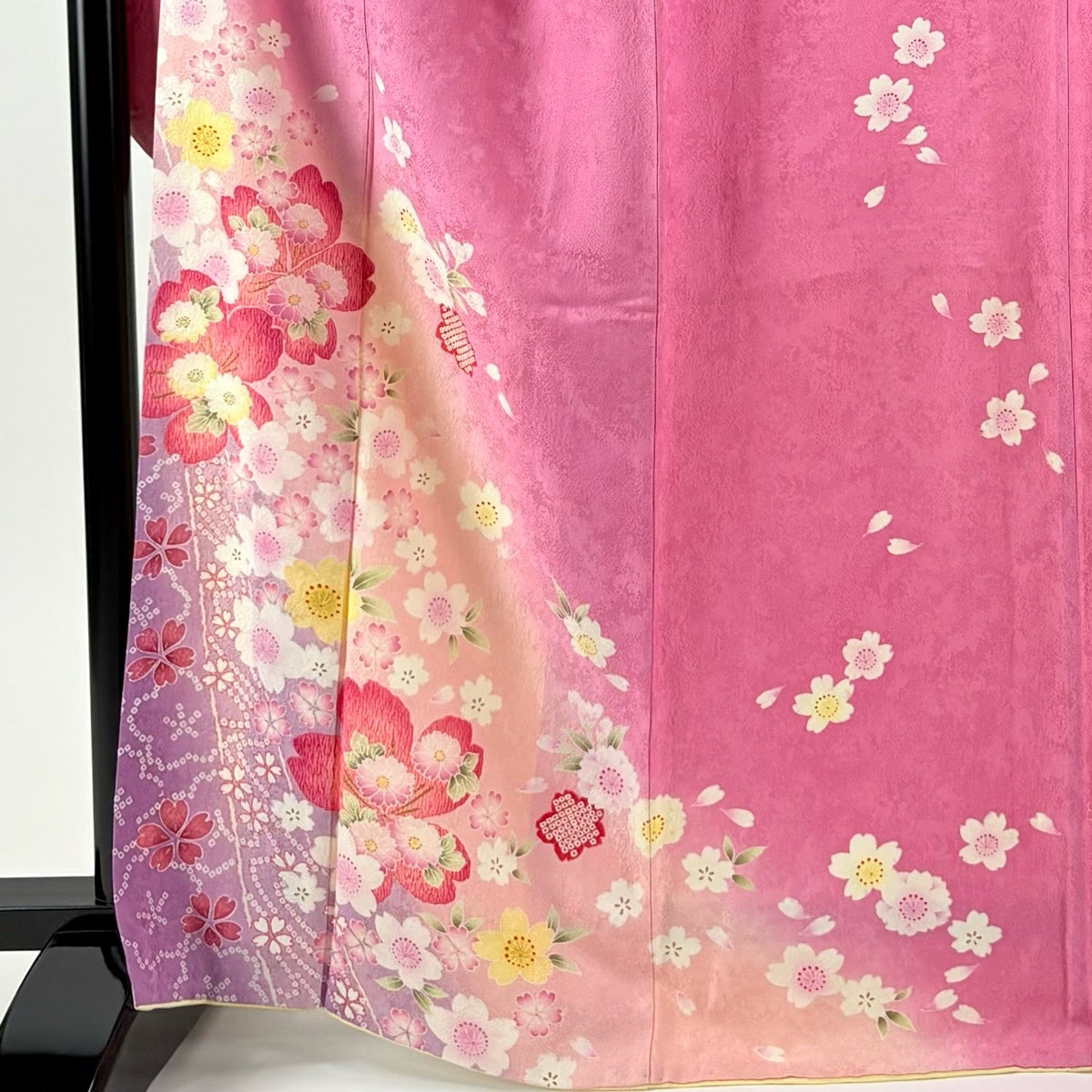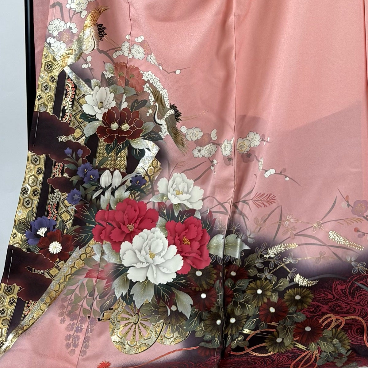 付下げ 身丈160cm 裄丈66.5cm M 袷 万寿菊 幾何学模様 金彩 ぼかし ピンク 正絹 秀品