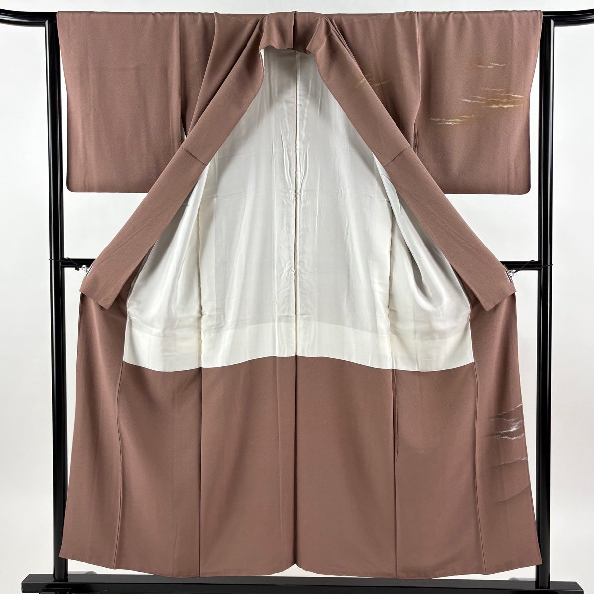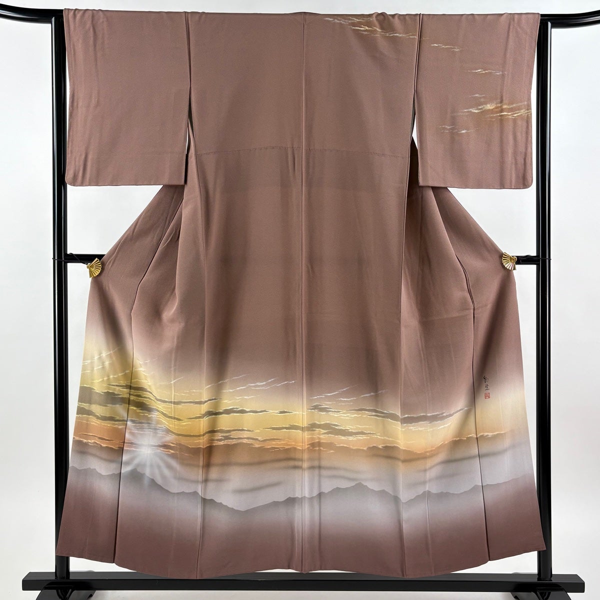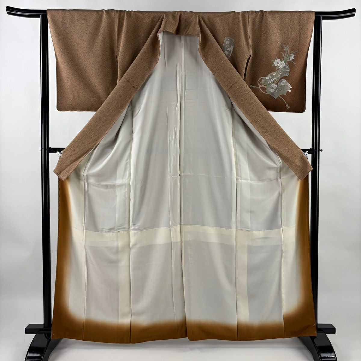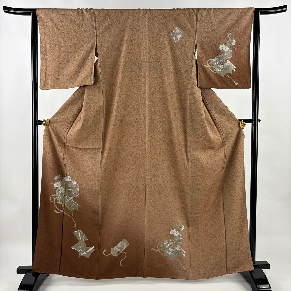 【美品】 付下げ 身丈165.5cm 裄丈67.5cm L 袷 短冊 ヱ霞 金銀彩 茶色 正絹 秀品 一つ紋