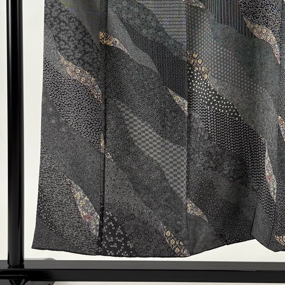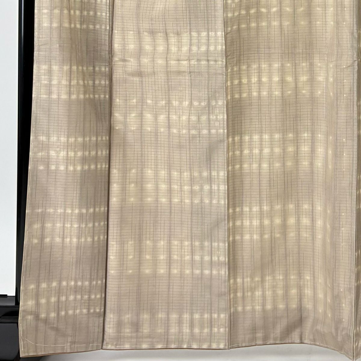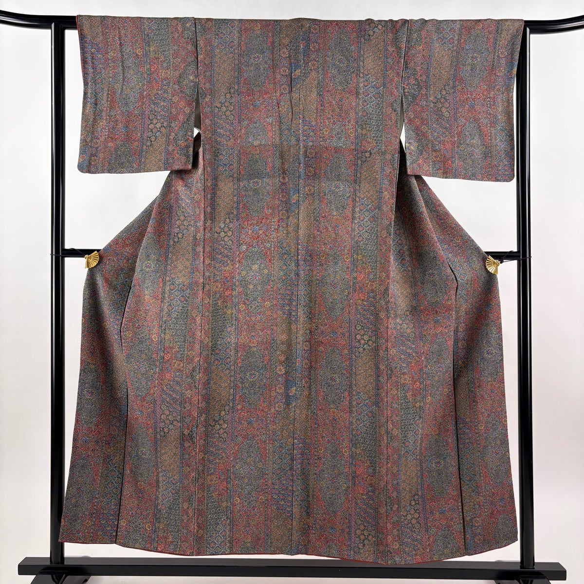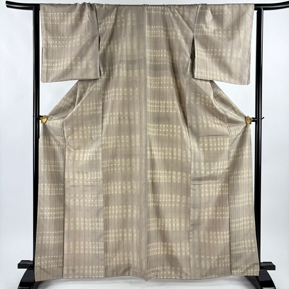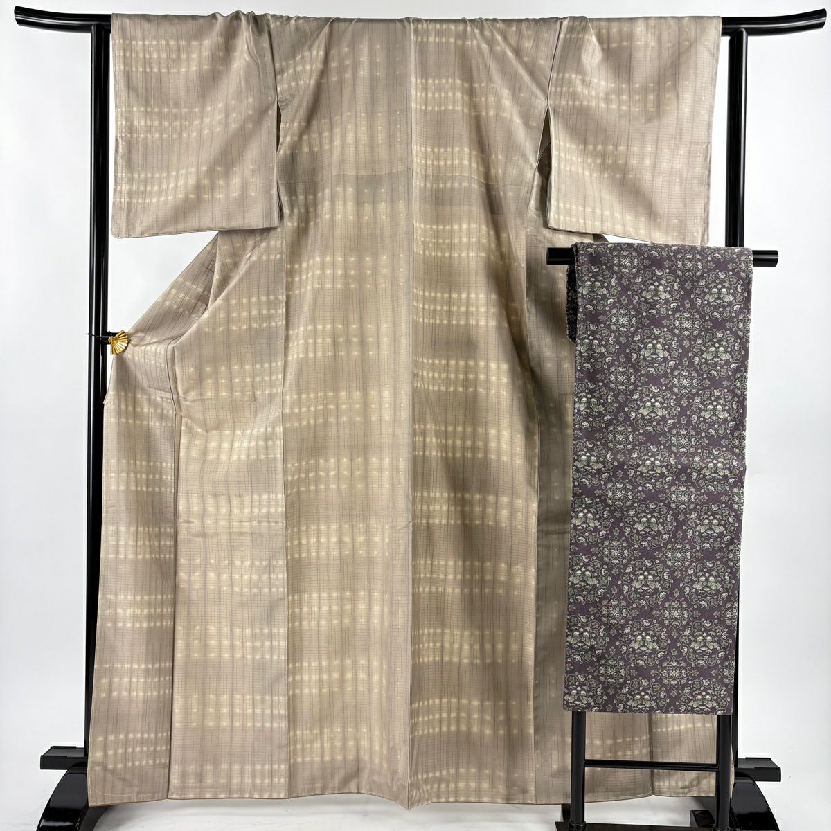 小紋 身丈167cm 裄丈66cm M 袷 名古屋帯セット 紬地 幾何学模様 縞 絞り 灰茶 正絹 秀品