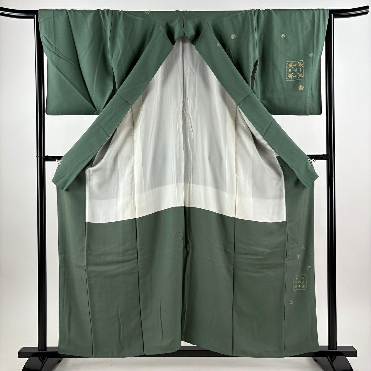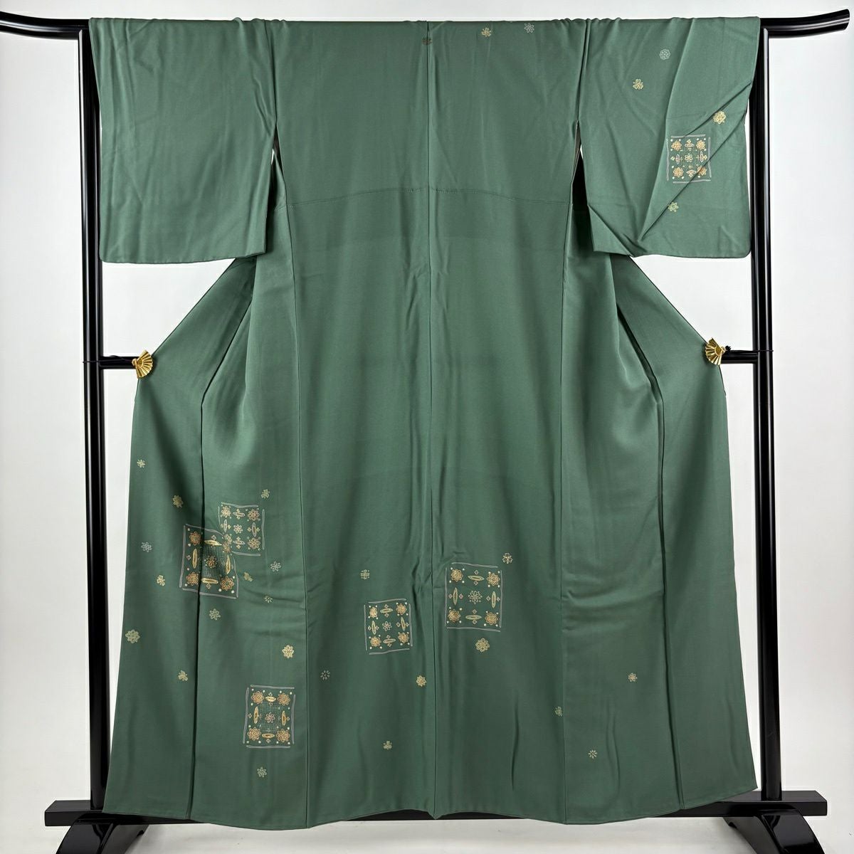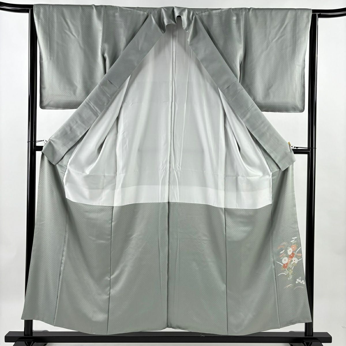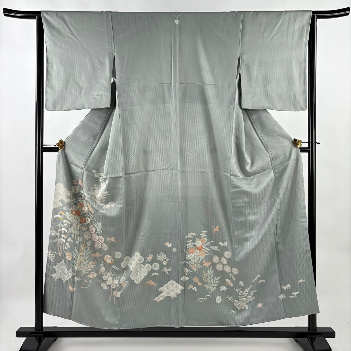 付下げ 身丈158cm 裄丈64.5cm M 袷 鈴乃屋 花 色紙 刺繍 金糸 灰緑 正絹 秀品 一つ紋