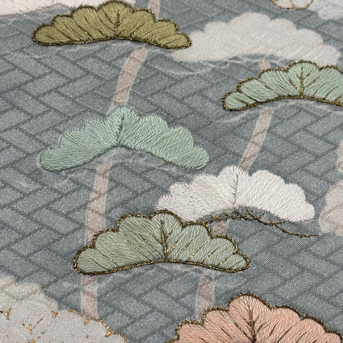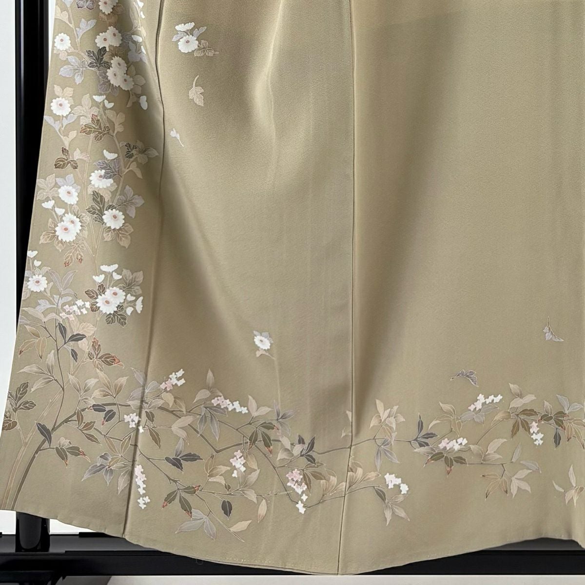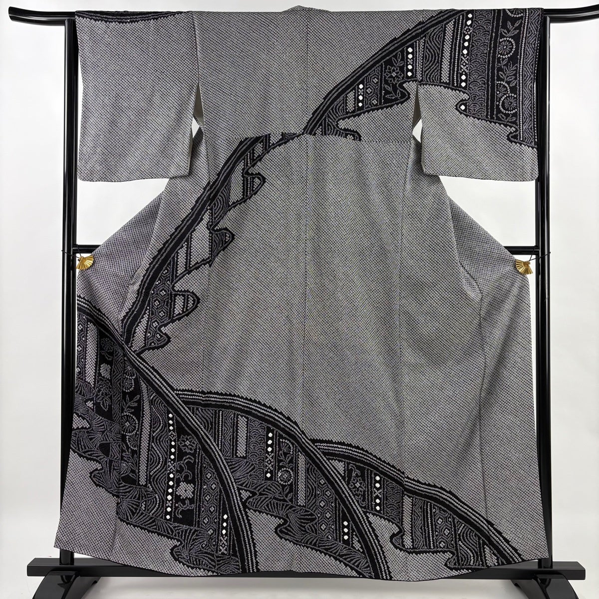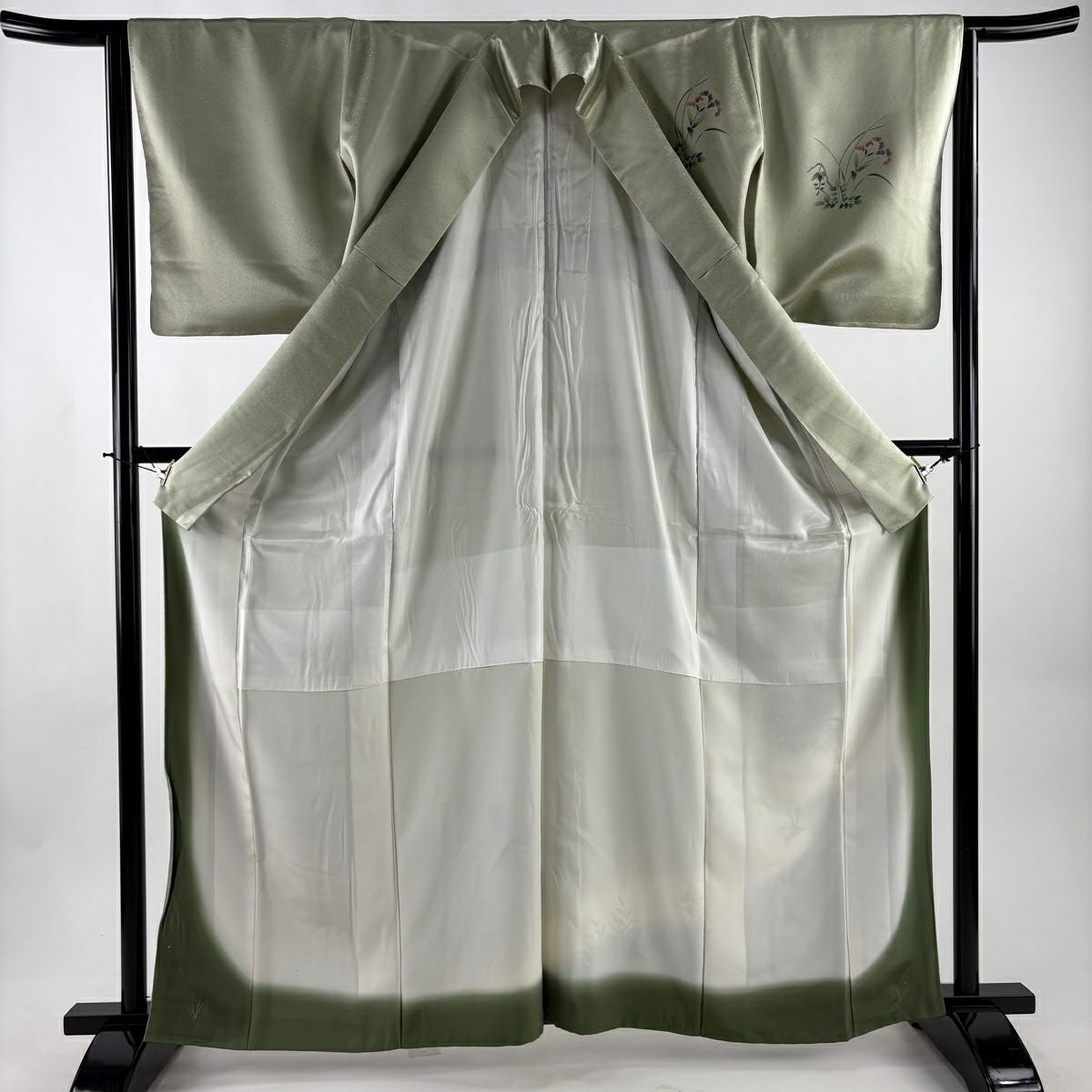 付下げ 身丈158cm 裄丈64.5cm M 袷 鈴乃屋 花 色紙 刺繍 金糸 灰緑 正絹 秀品 一つ紋