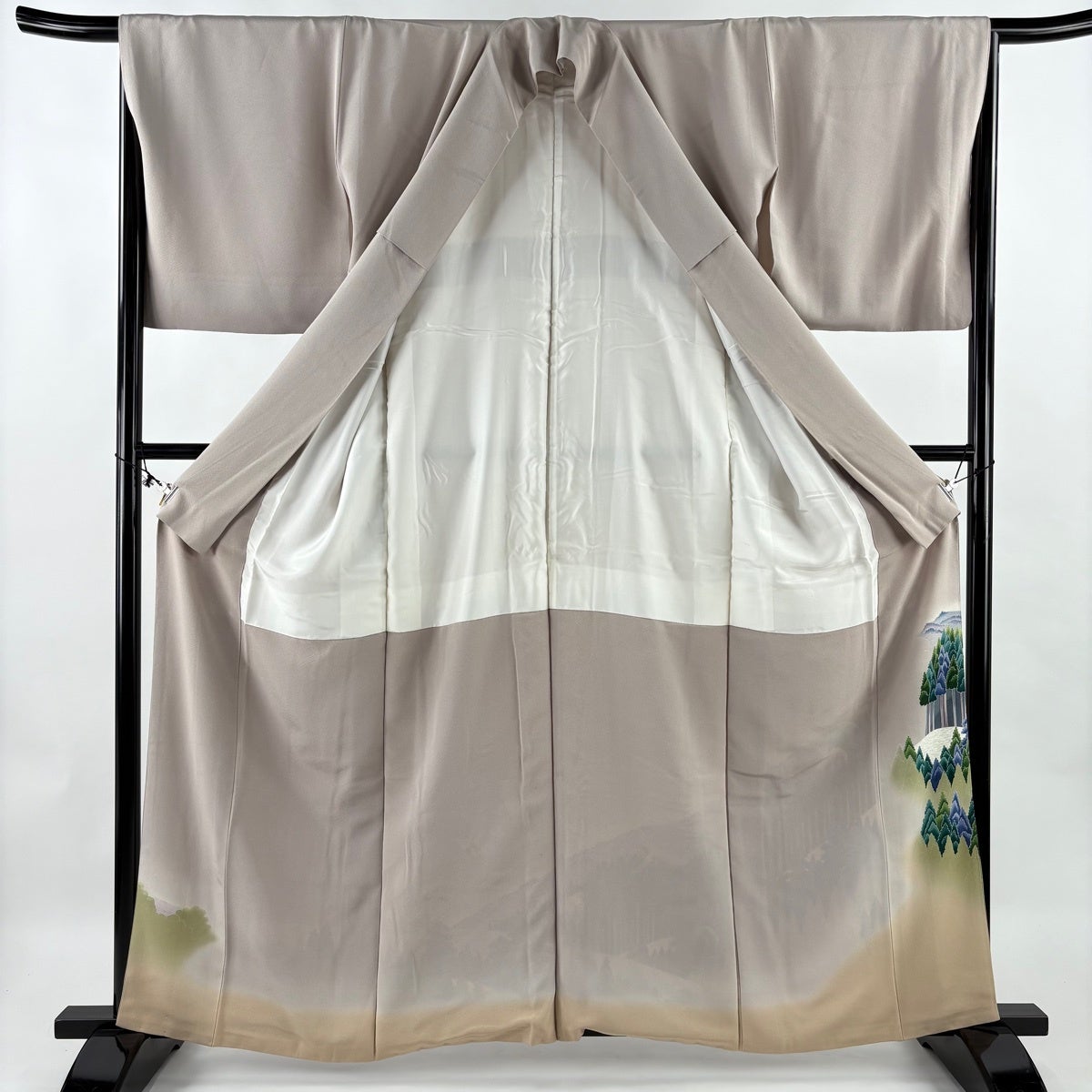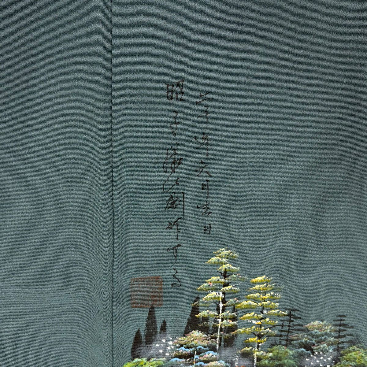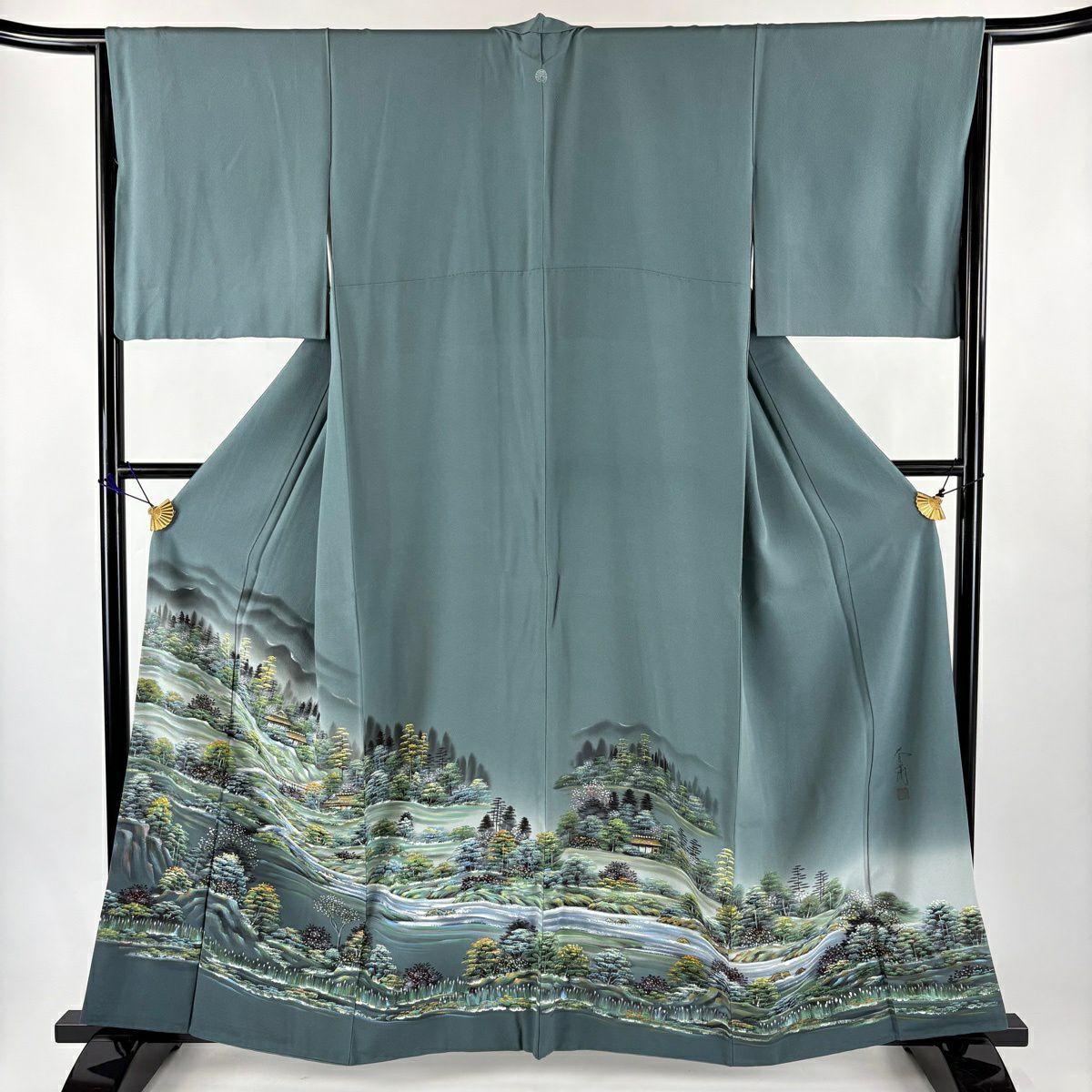 色留袖 身丈159.5cm 裄丈65.5cm M 袷 落款あり 風景 建物 ぼかし 灰緑 正絹 秀品 一つ紋