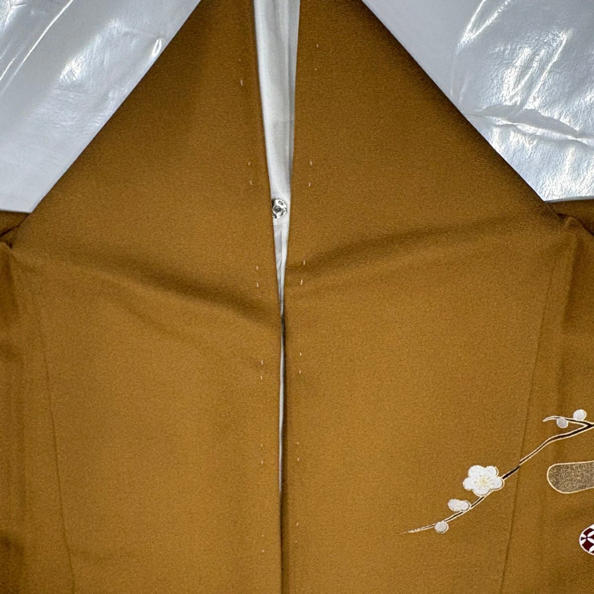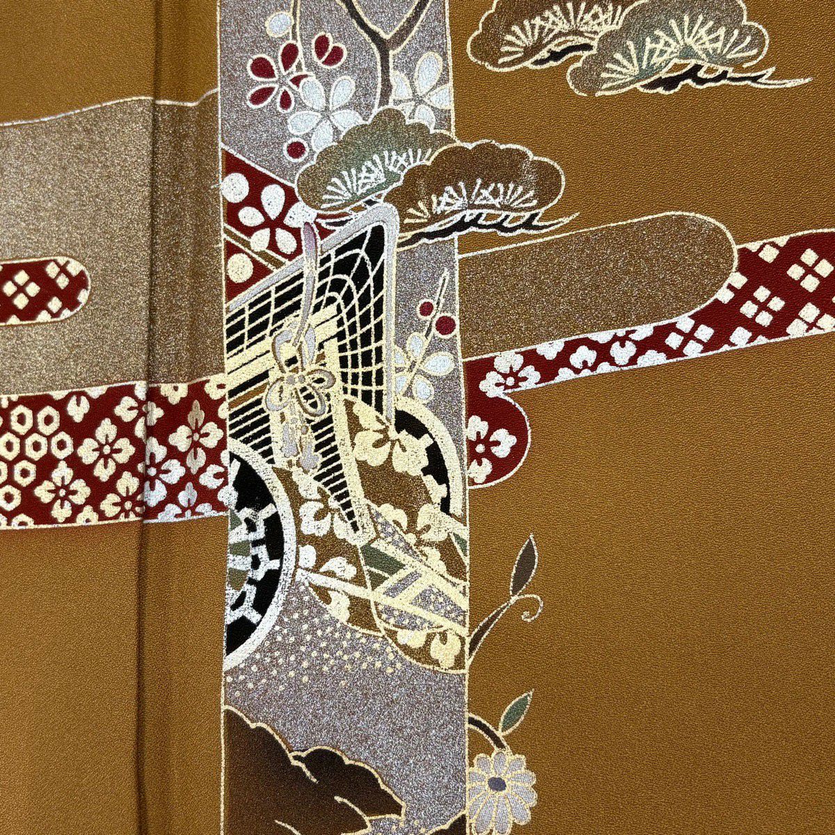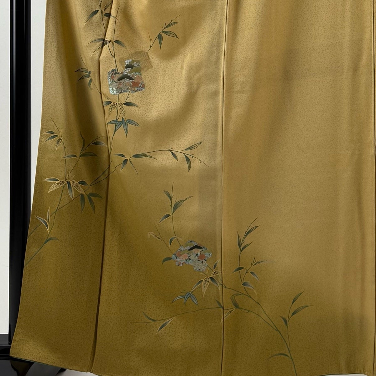 【美品】 振袖 身丈157cm 裄丈65cm M 袷 御所車 草花 金銀彩 ぼかし からし色 正絹 秀品