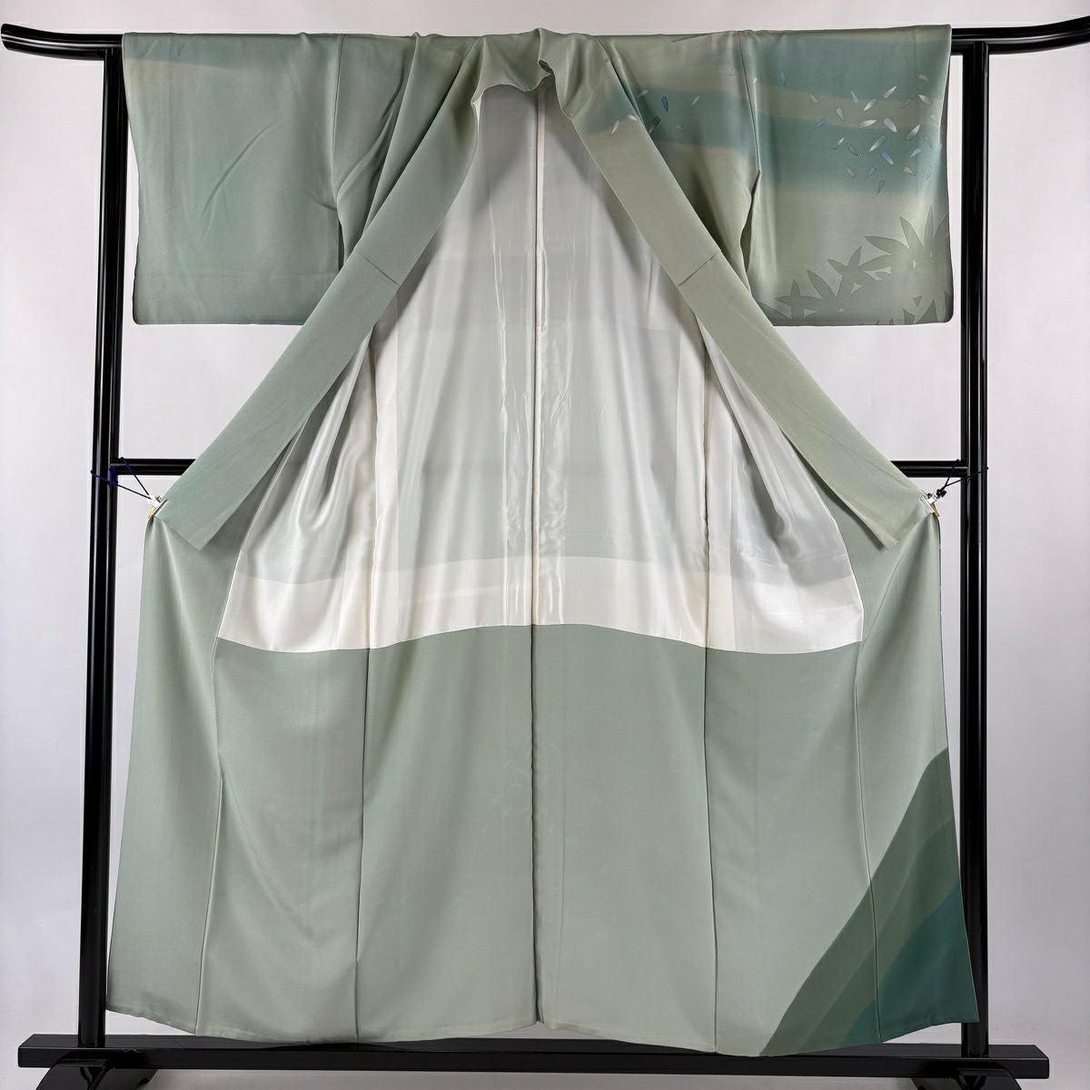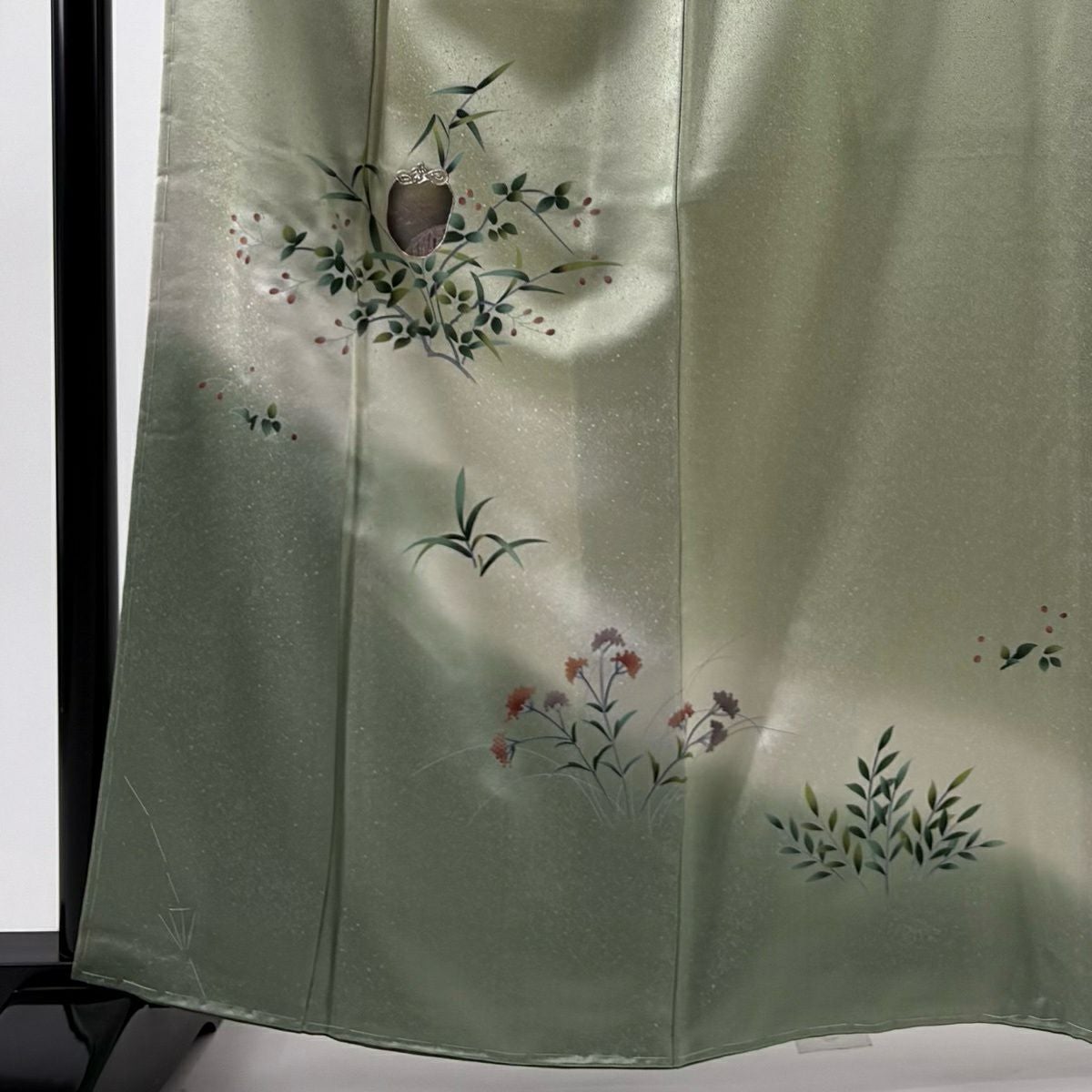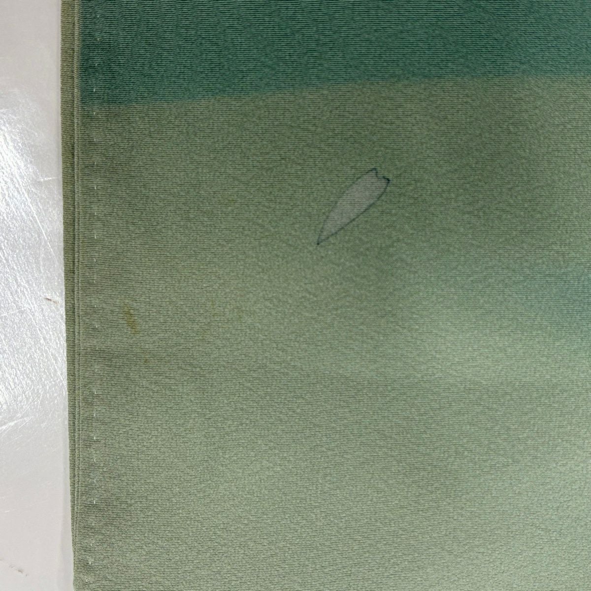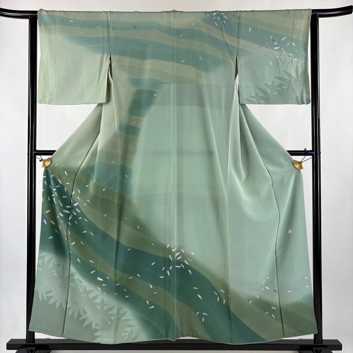 付下げ 身丈152cm 裄丈63cm S 袷 松尾光琳 落款あり 鳥 木賊 銀彩 ぼかし 緑 正絹 秀品