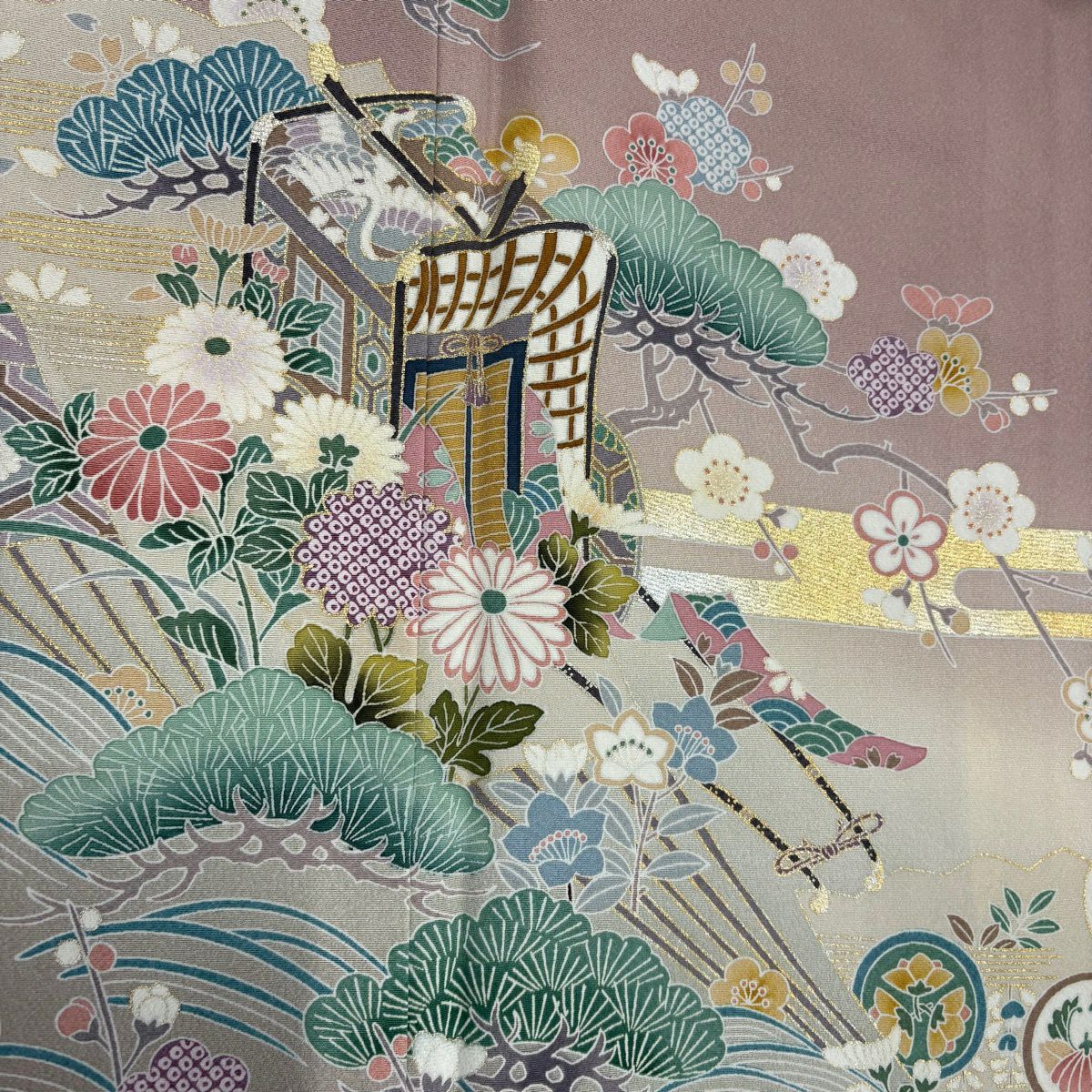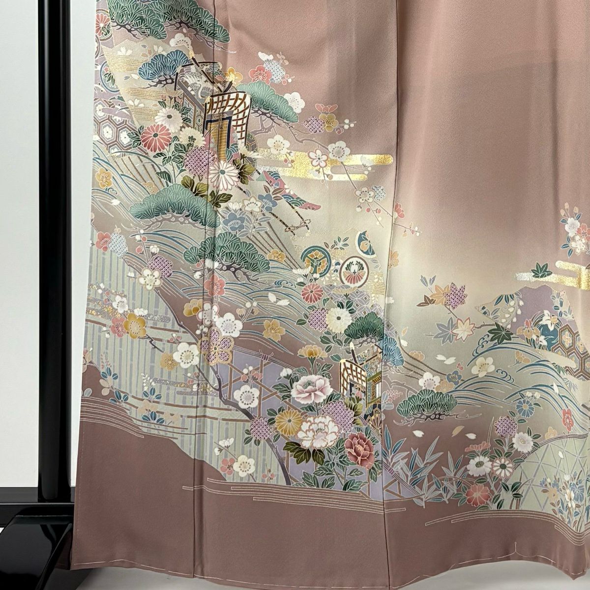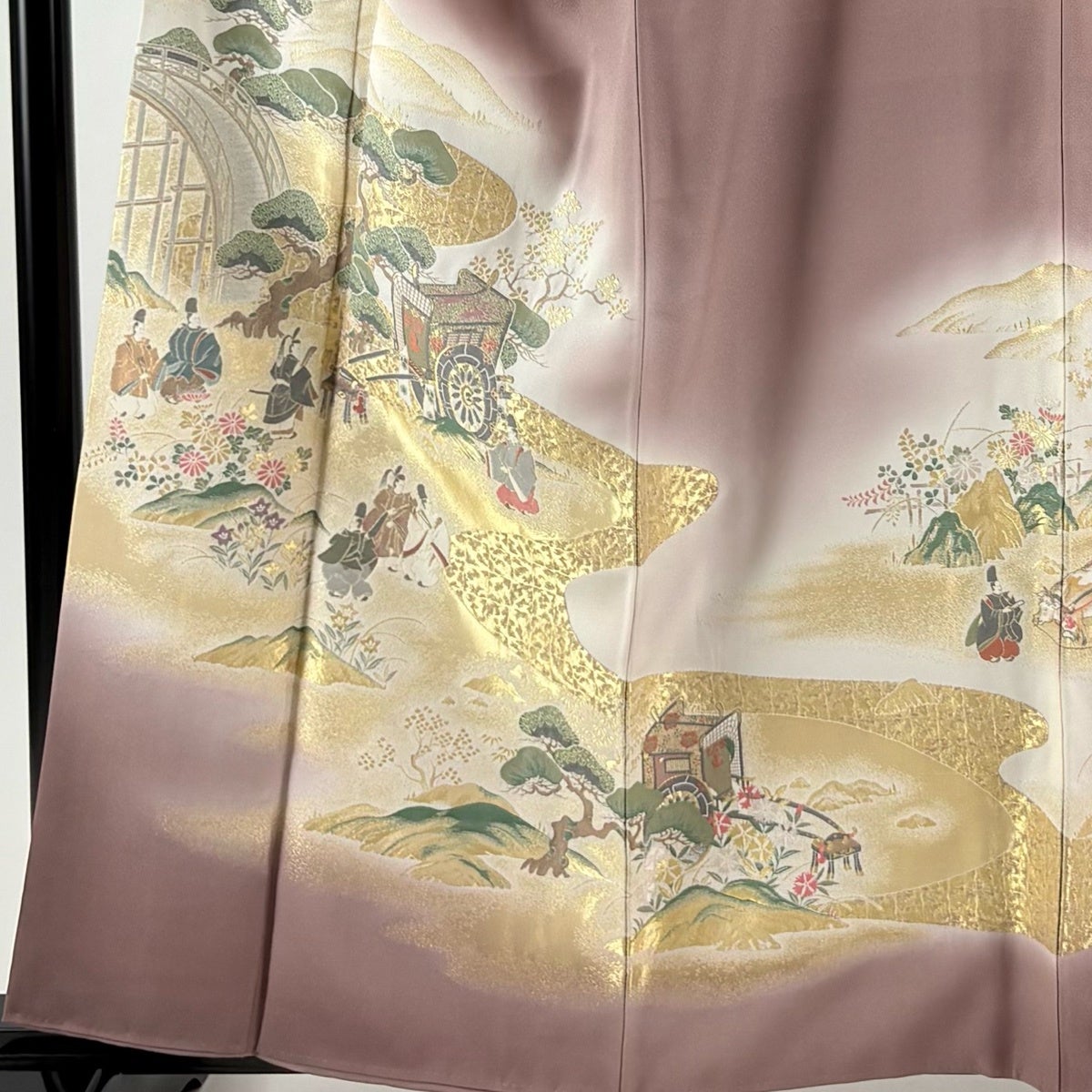 色留袖 身丈166cm 裄丈65.5cm M 袷 御所車 松梅 金銀彩 ぼかし 灰紫 正絹 秀品 一つ紋