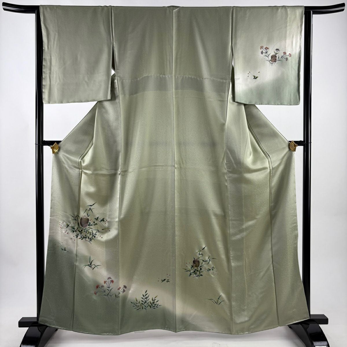 【美品】 付下げ 身丈163.5cm 裄丈64cm M 袷 お仕覆 草花 螺鈿 金銀彩 灰緑 正絹 秀品