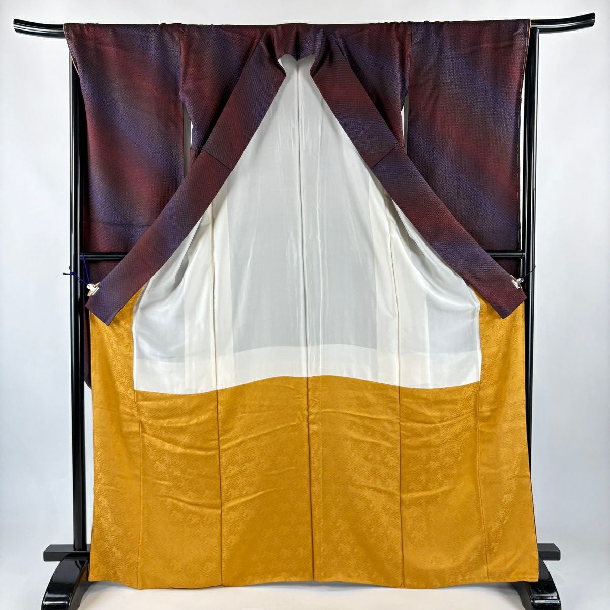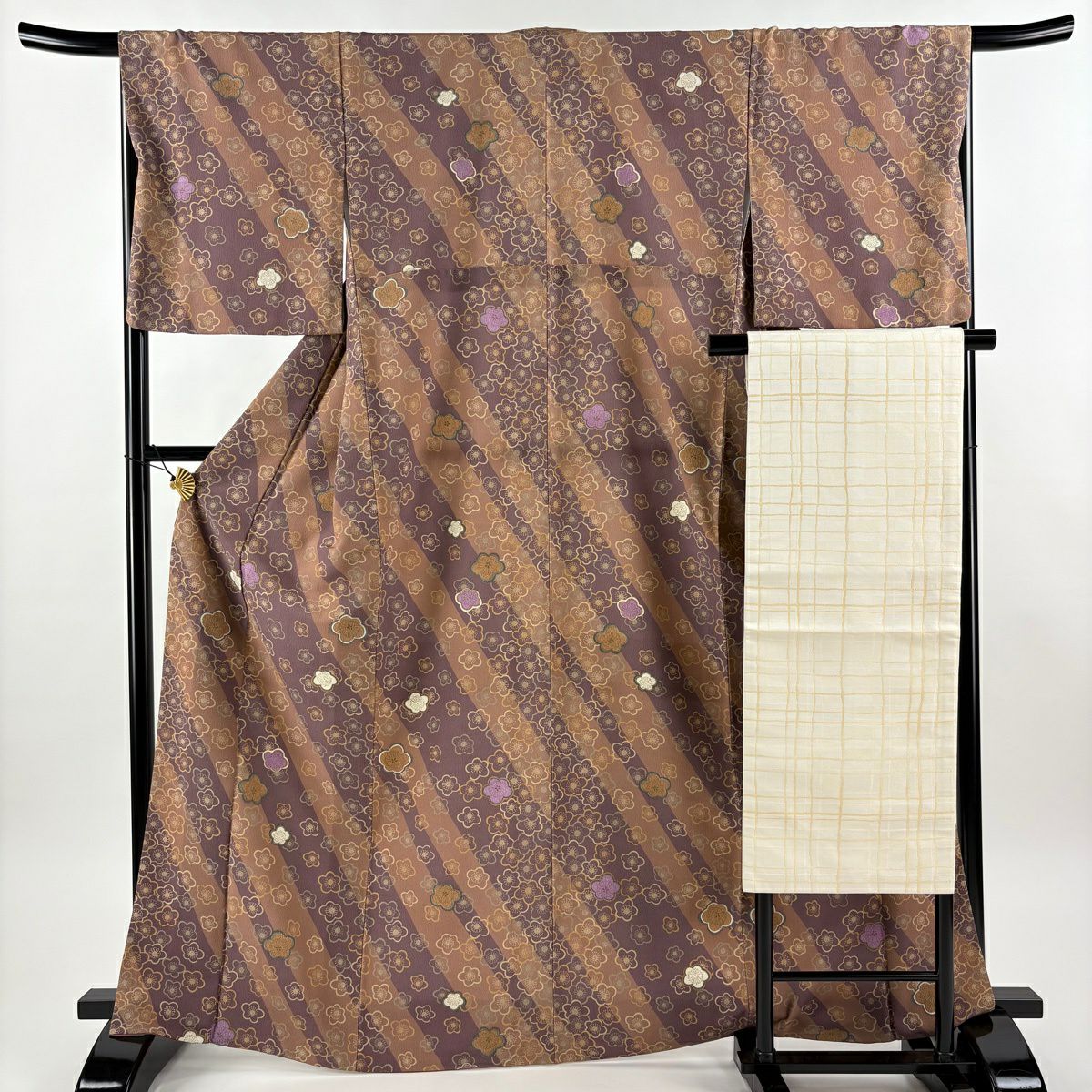 【美品】 小紋 身丈166.5cm 裄丈66.5cm M 袷 名古屋帯セット 梅 斜縞 金彩 薄小豆 正絹 秀品