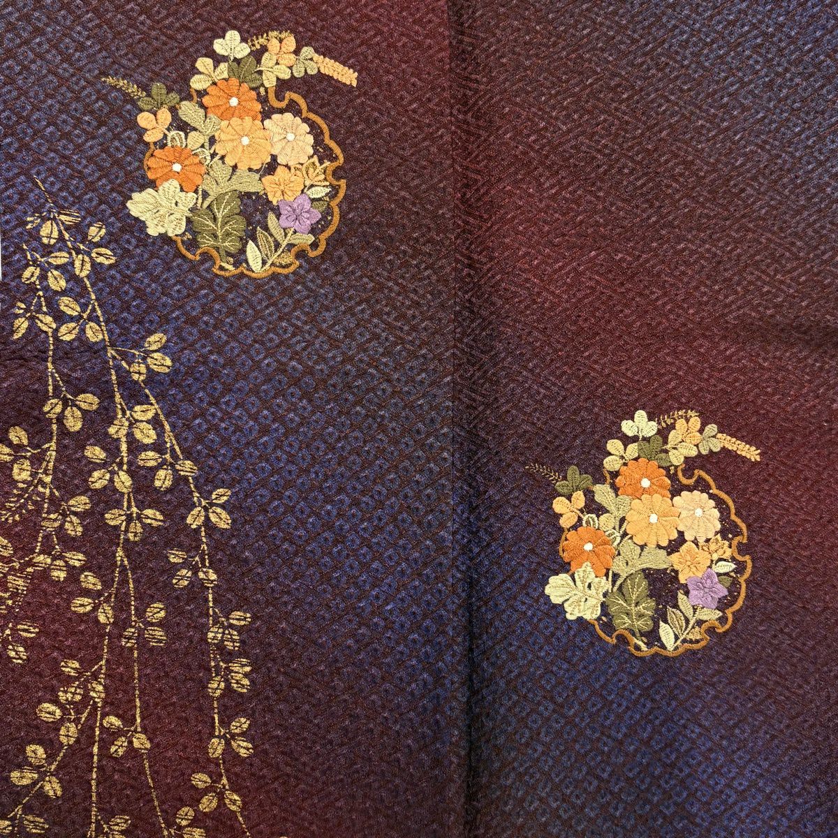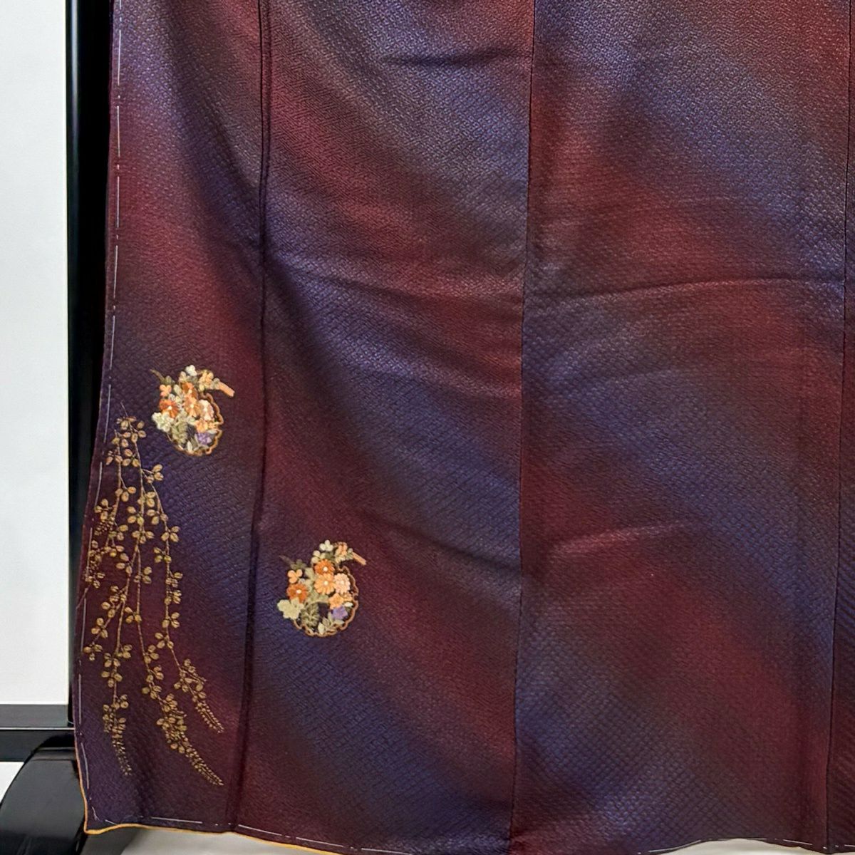 【美品】 振袖 身丈165.5cm 裄丈66.5cm M 袷 鈴乃屋 雪輪 菊 刺繍 絞り 茶紫 正絹 秀品