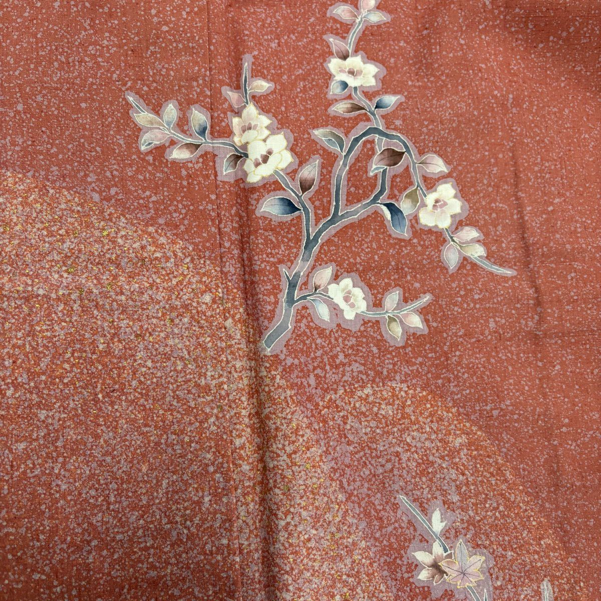 付下げ 身丈167.5cm 裄丈67cm M 袷 紬地 やまと 枝花 楓 金彩 ぼかし 朱色 正絹 秀品