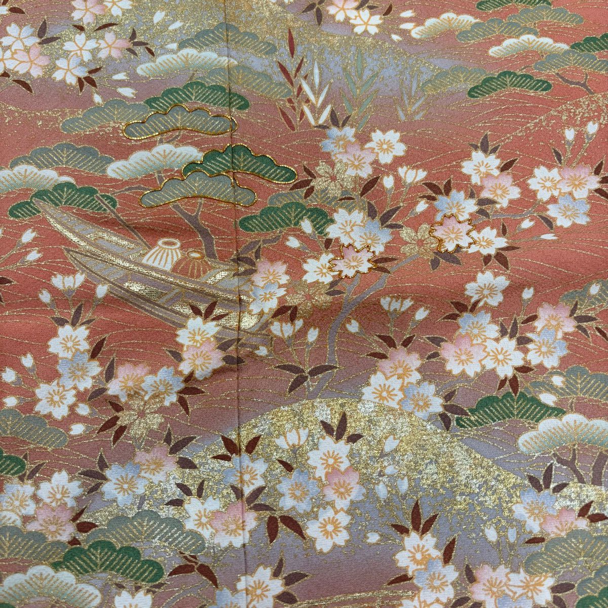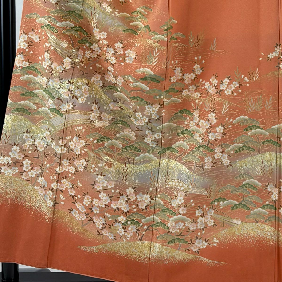 訪問着 身丈157.5cm 裄丈67cm M 袷 鈴乃屋 橋 桜 金糸 金彩 サーモンピンク 正絹 秀品