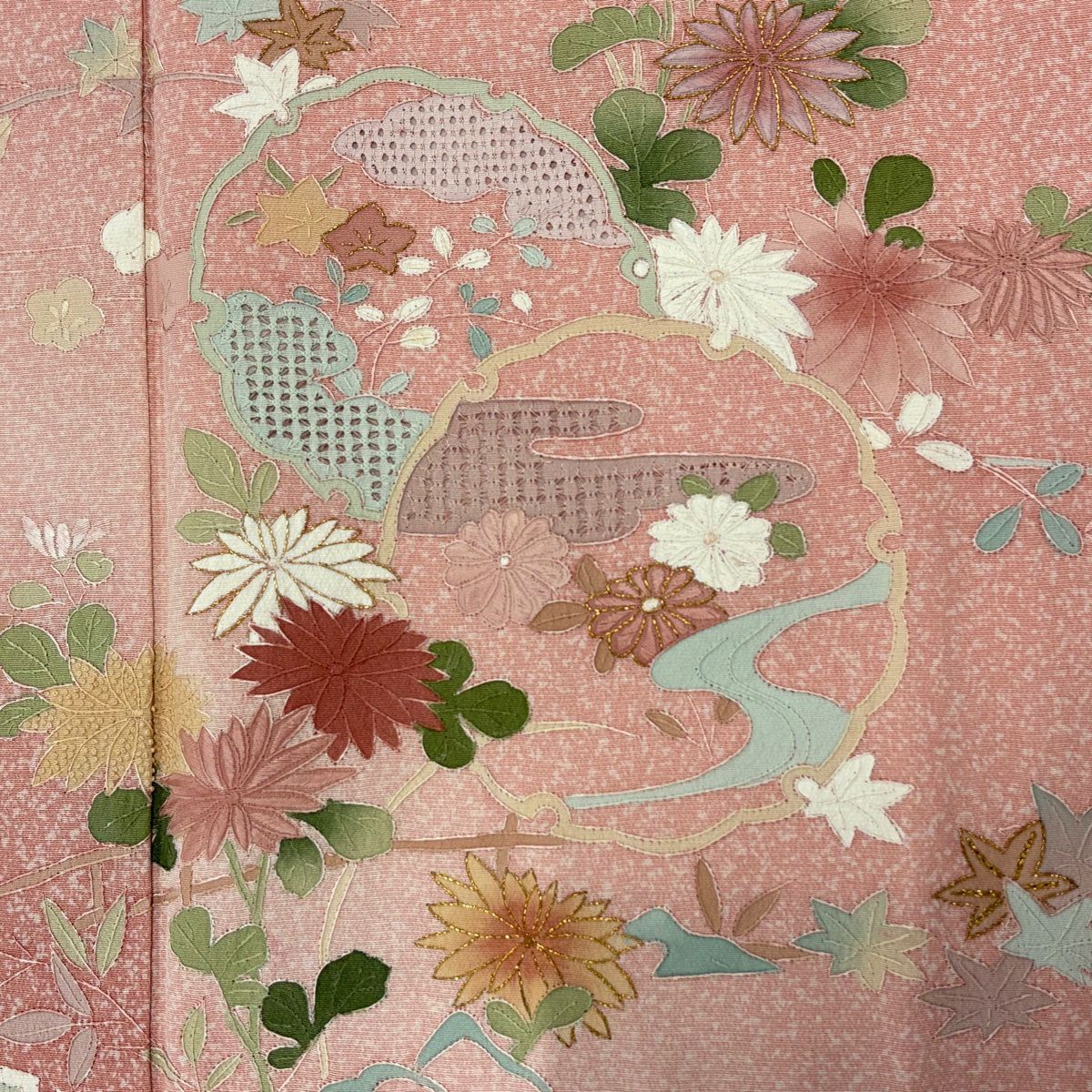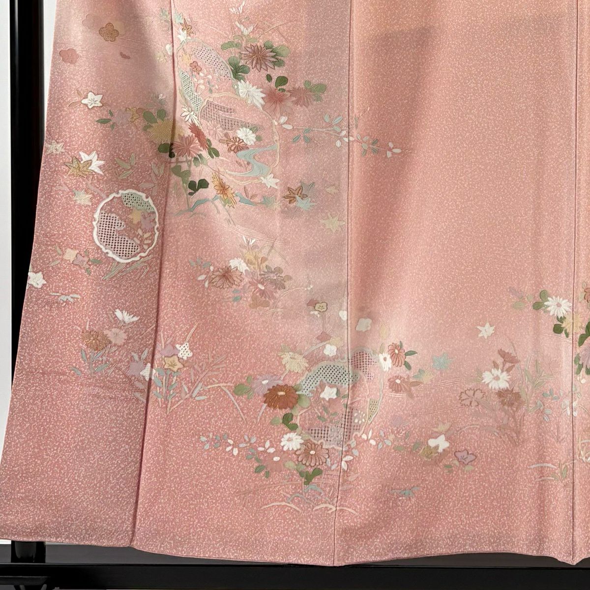 【美品】 訪問着 身丈157cm 裄丈63.5cm S 袷 雪輪 草花 刺繍 金糸 ピンク 正絹 秀品