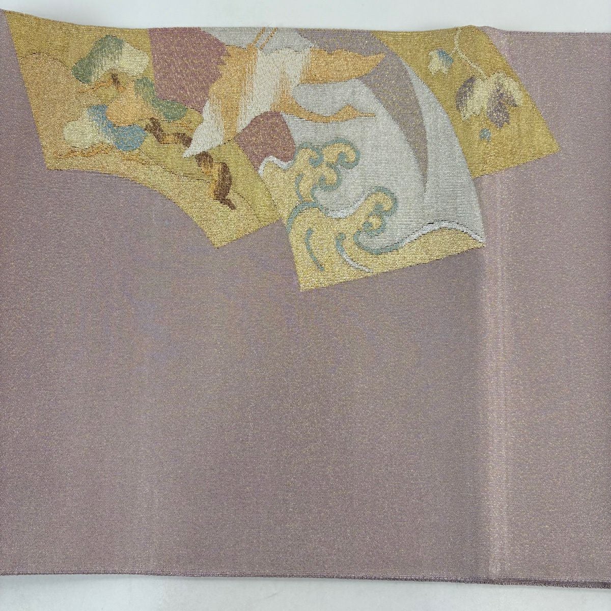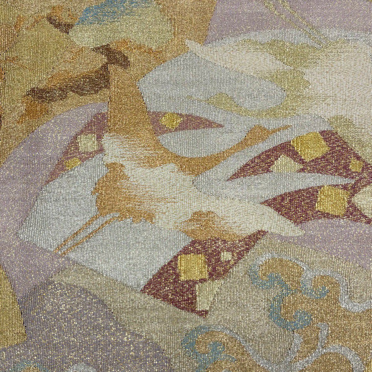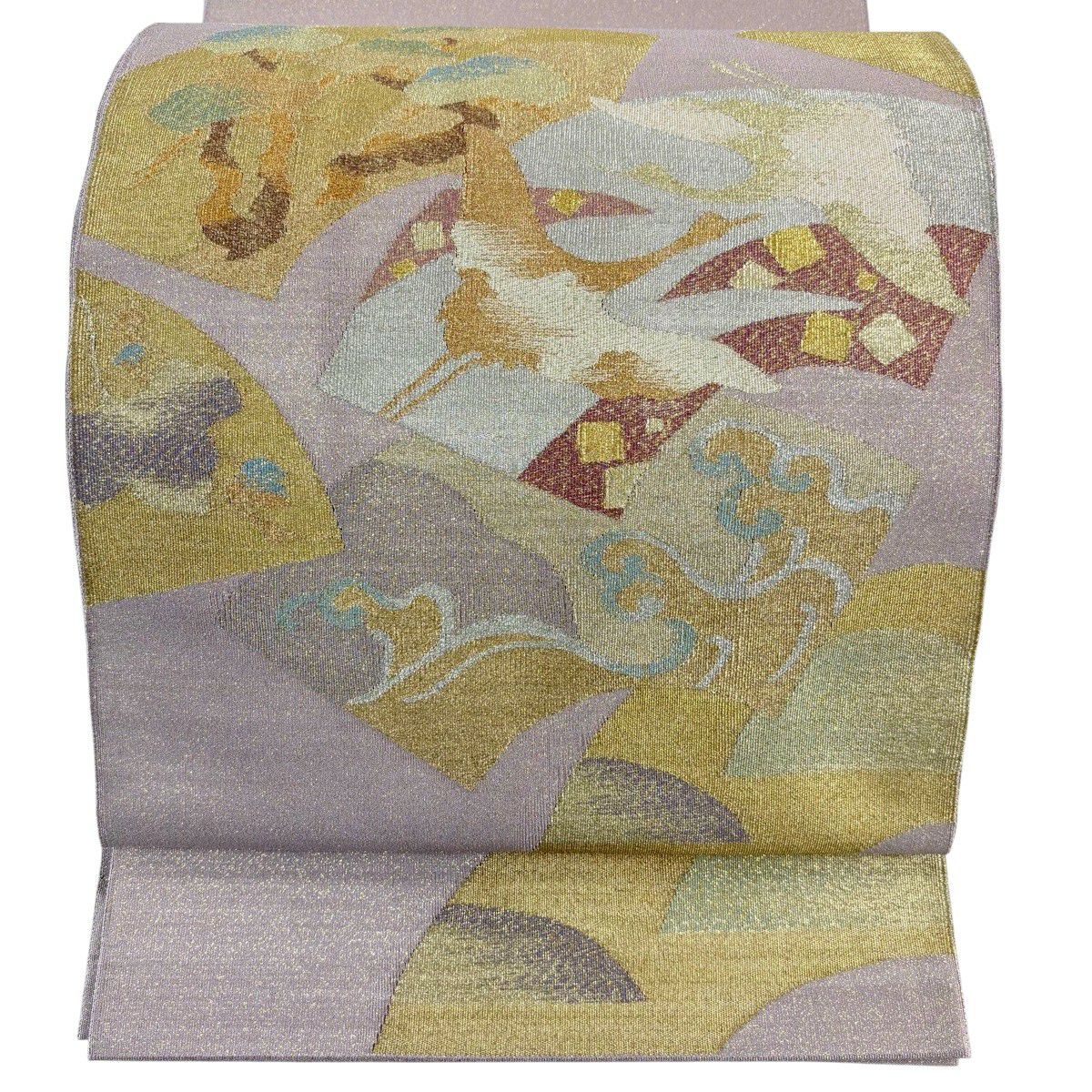 30%OFF 【美品】 袋帯 秀品 関西仕立て 鶴 扇面 綴れ織 金銀糸 灰紫 お太鼓柄 正絹 K30