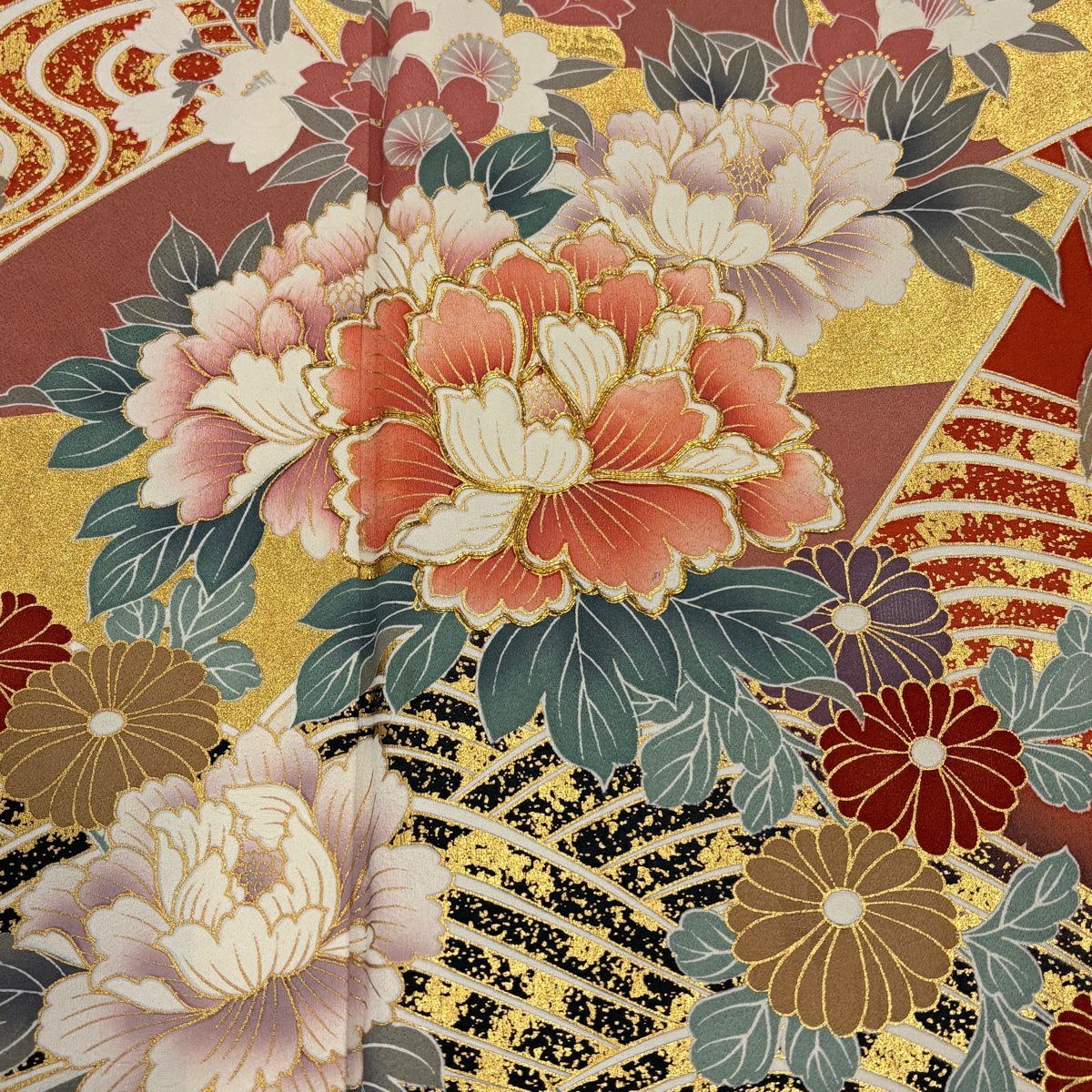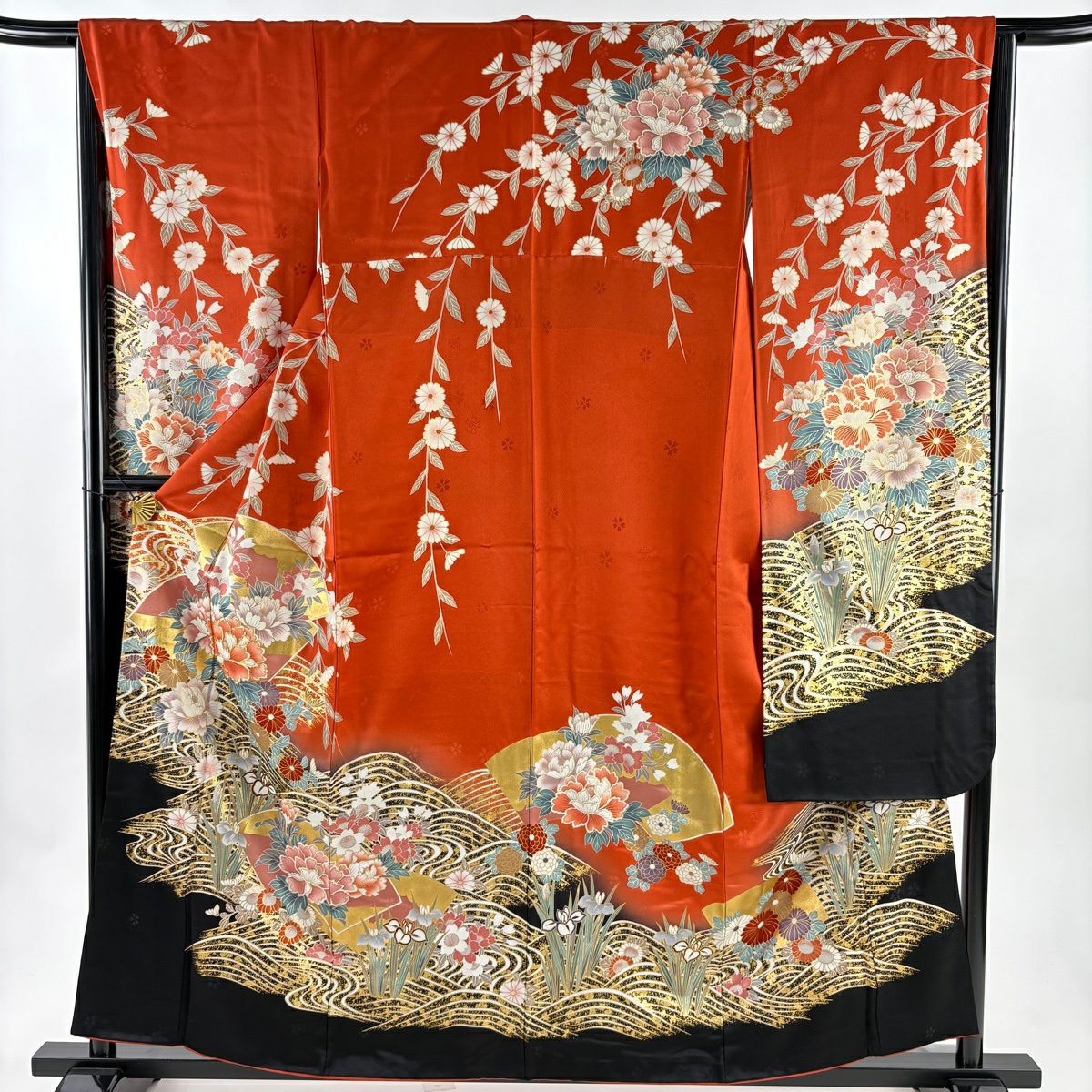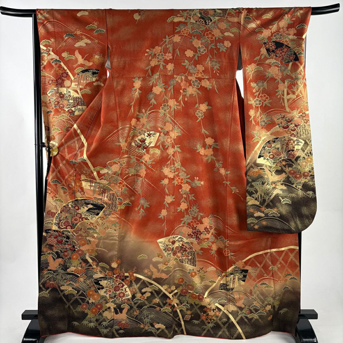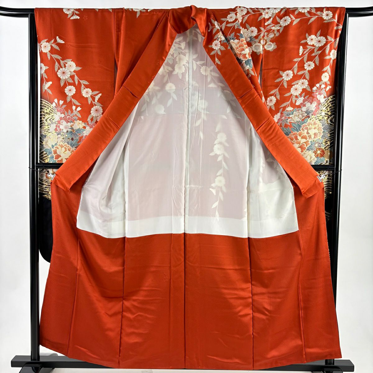 30%OFF 振袖 身丈159cm 裄丈66cm M 袷 牡丹 扇面 金糸 金彩 朱色 正絹 秀品 K30