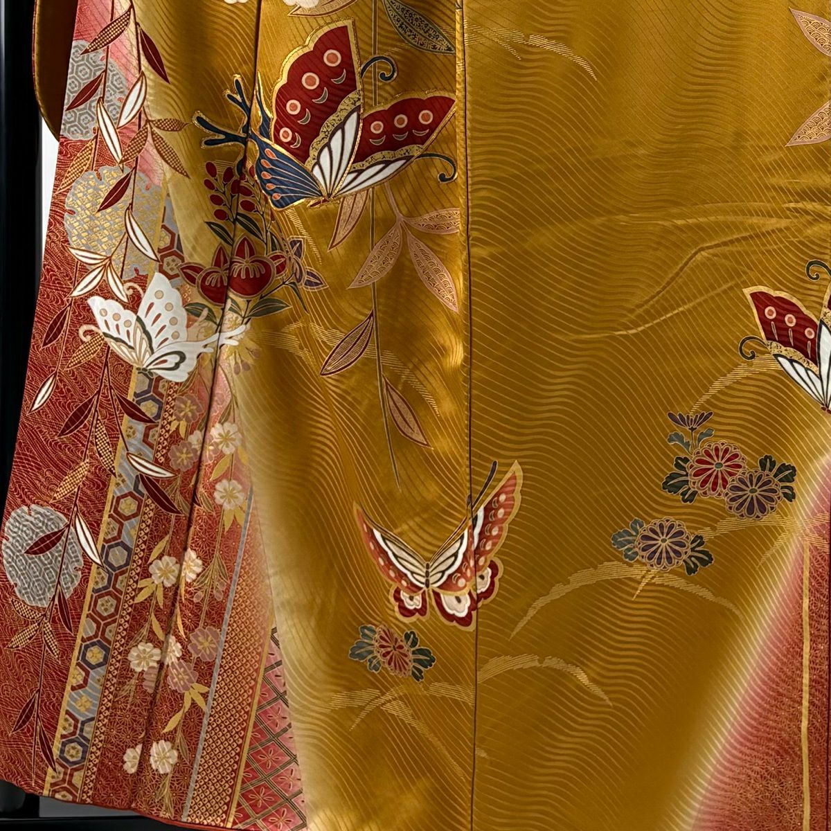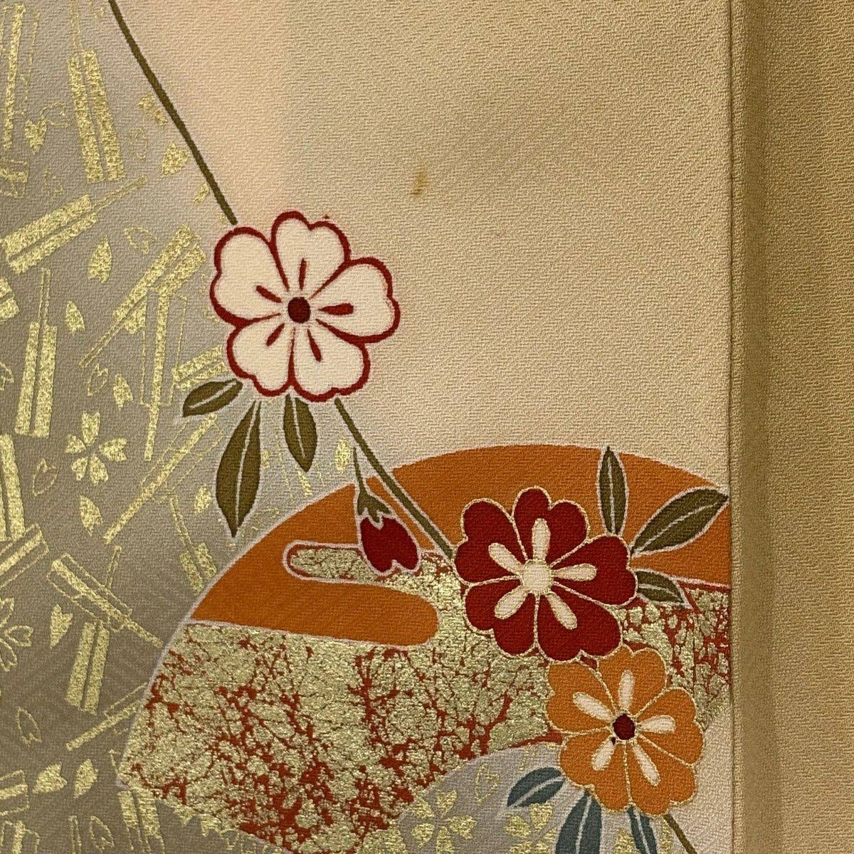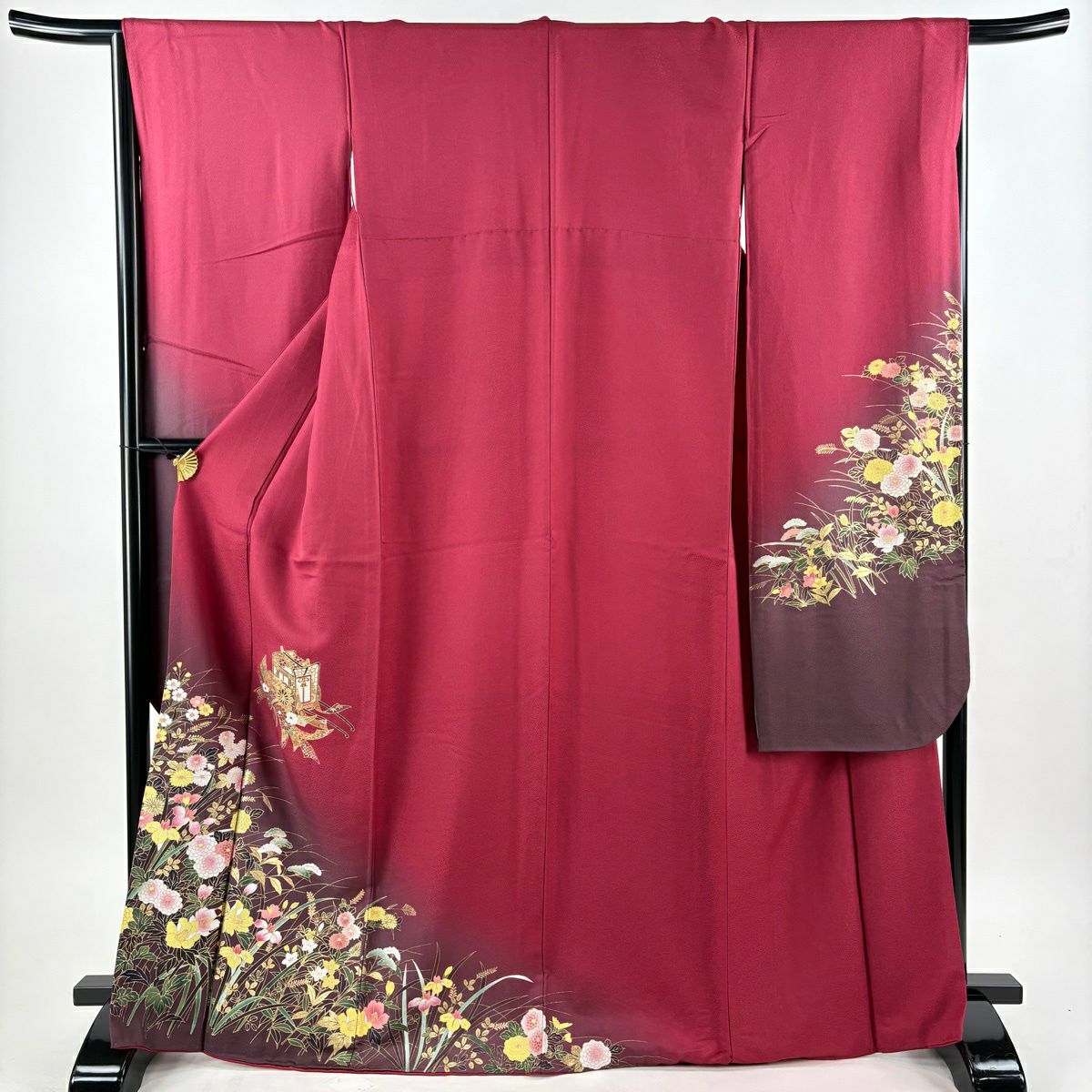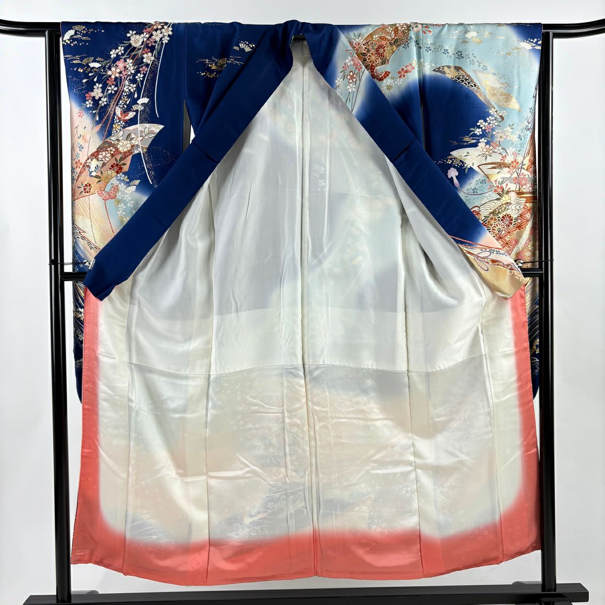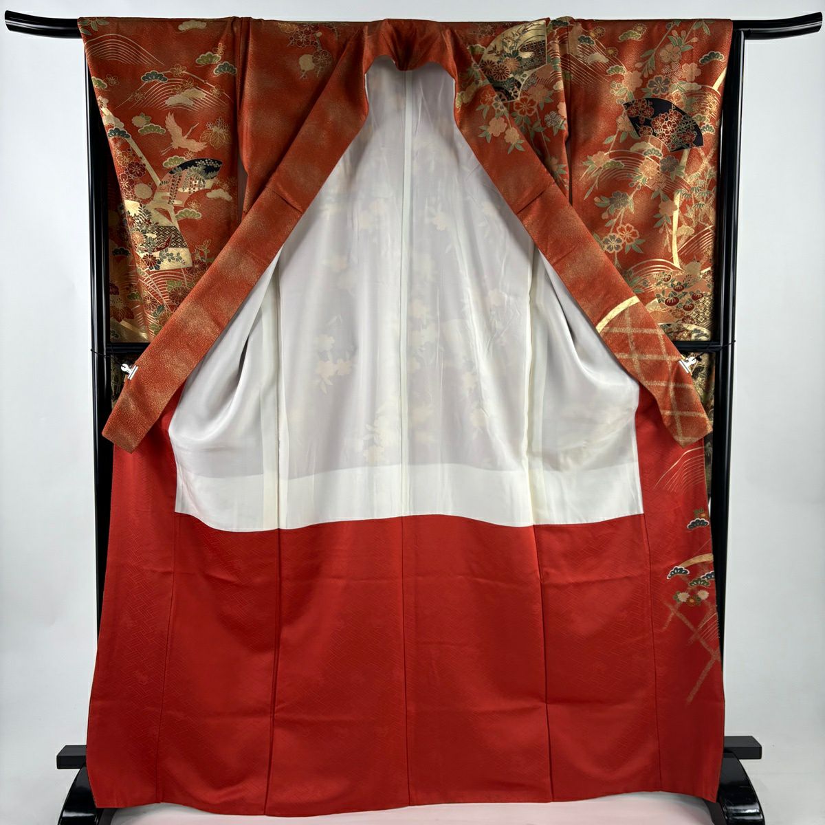 30%OFF 振袖 身丈159cm 裄丈66cm M 袷 牡丹 扇面 金糸 金彩 朱色 正絹 秀品 K30