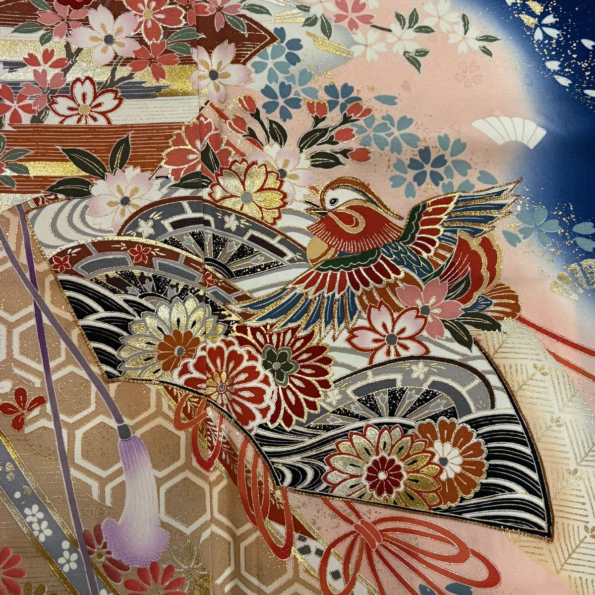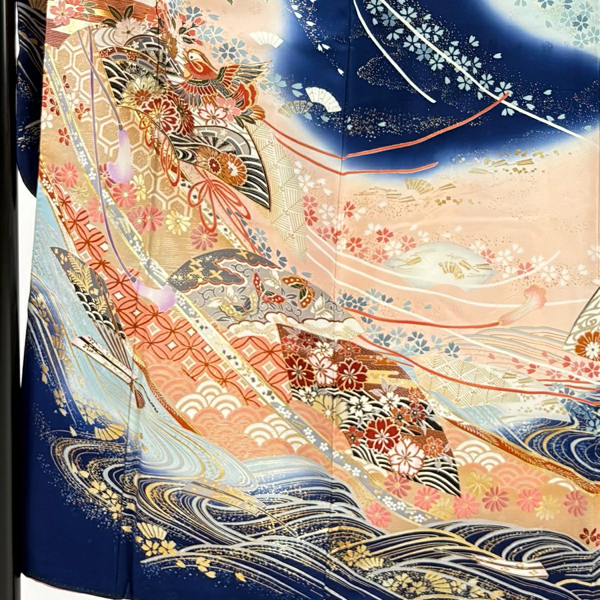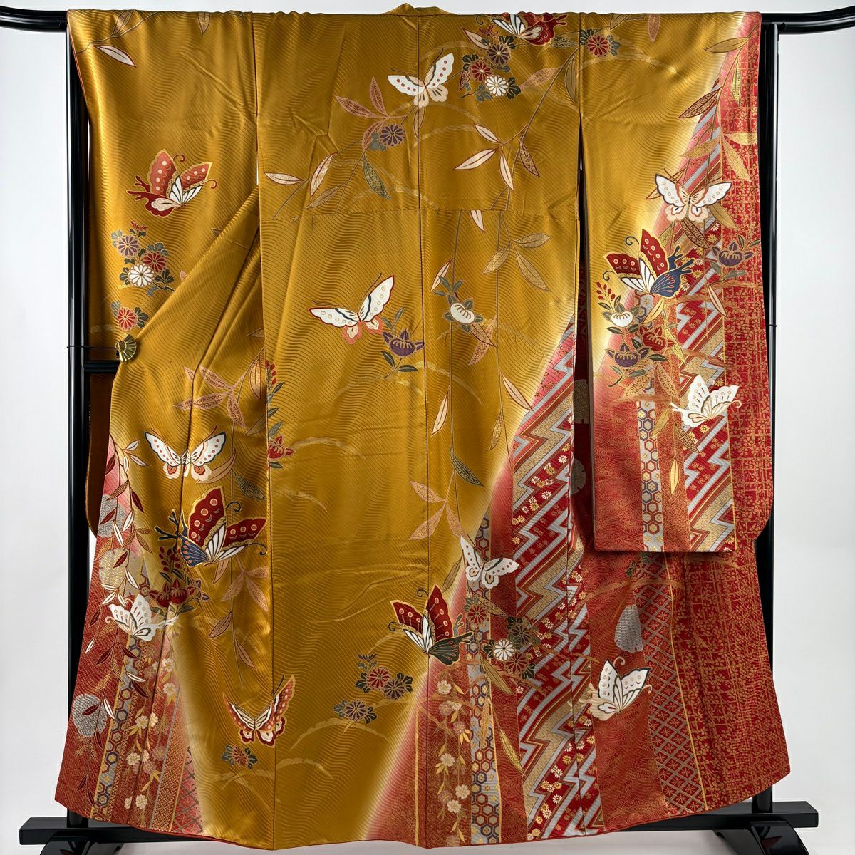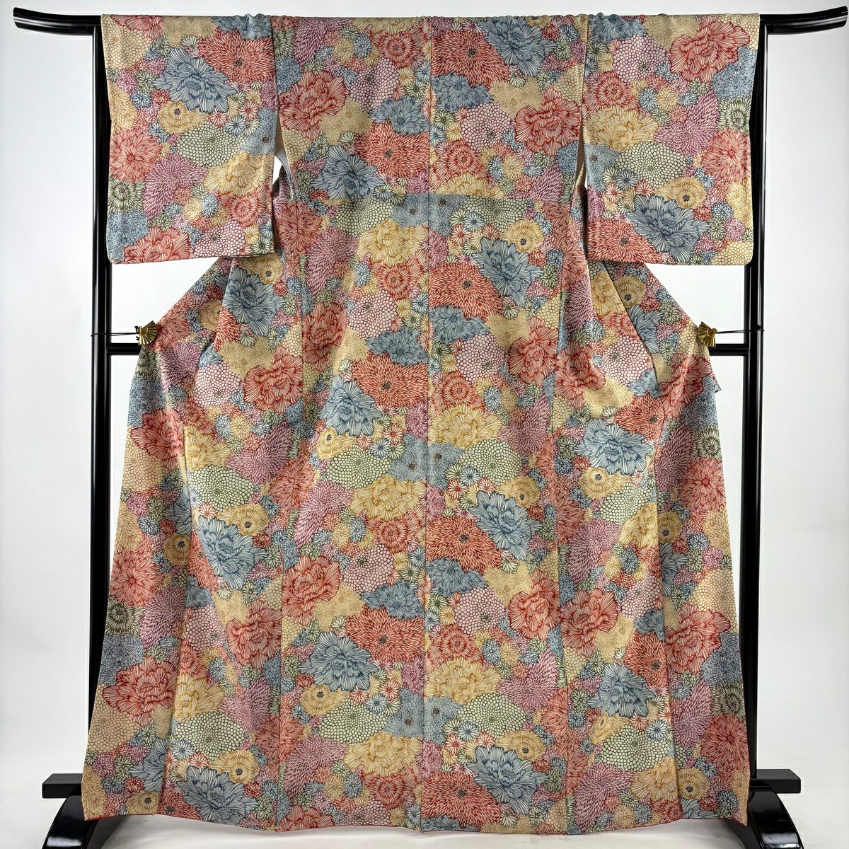 30%OFF 振袖 身丈159cm 裄丈66cm M 袷 牡丹 扇面 金糸 金彩 朱色 正絹 秀品 K30