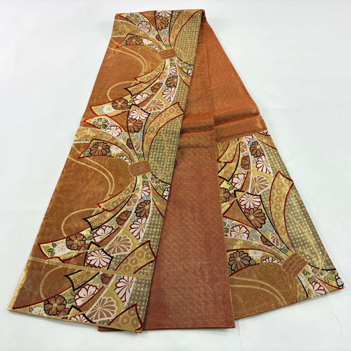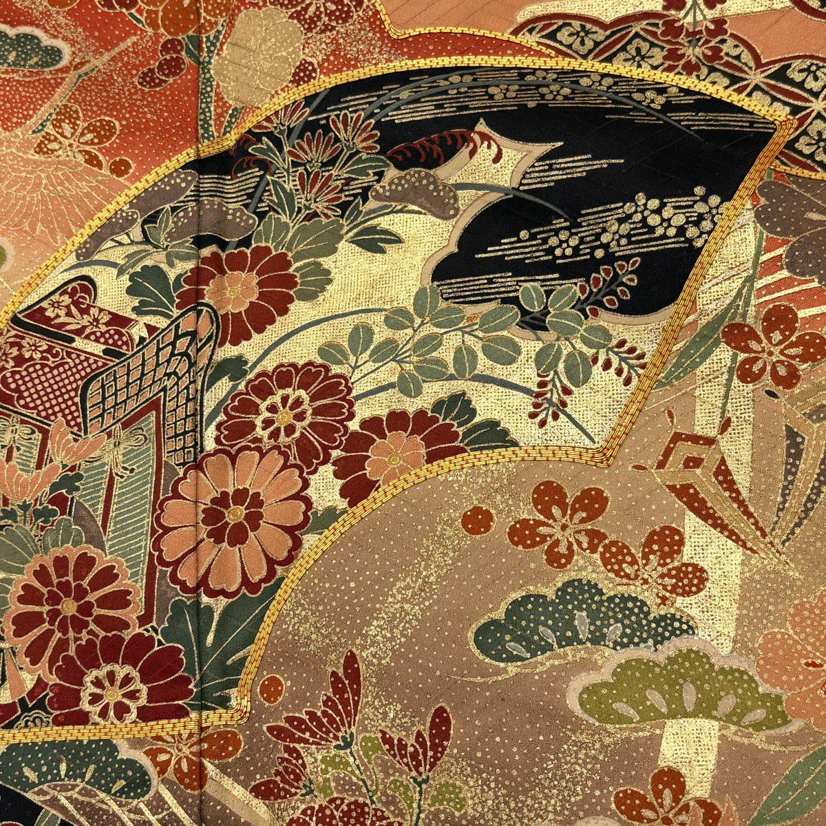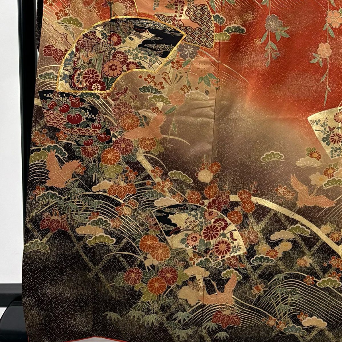 30%OFF 振袖 身丈168cm 裄丈66cm M 袷 扇面 草花 金糸 金彩 赤茶 正絹 秀品 K30