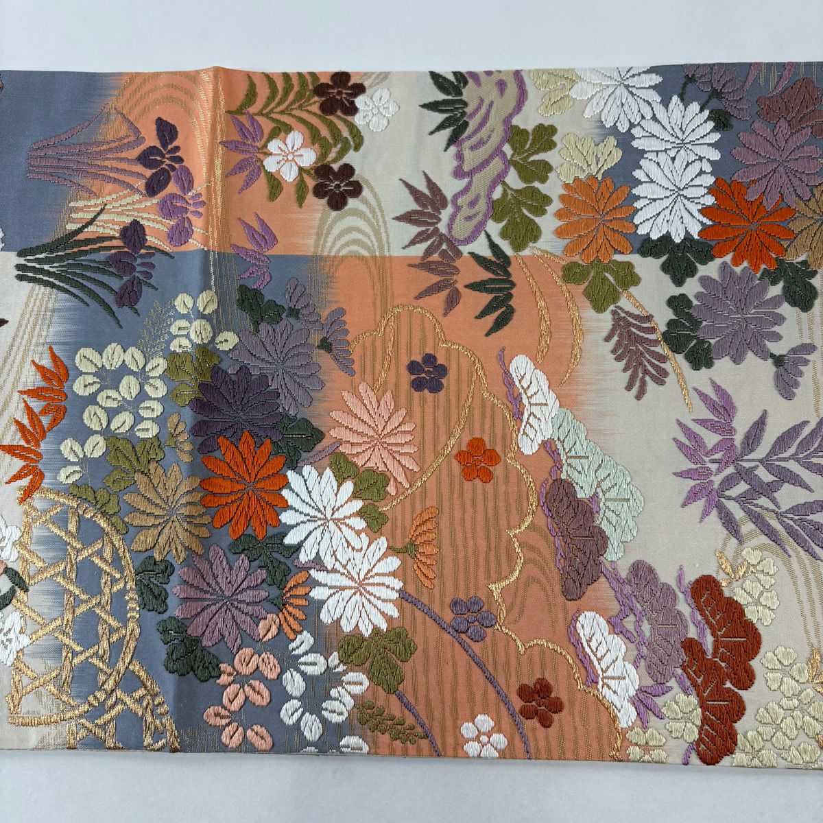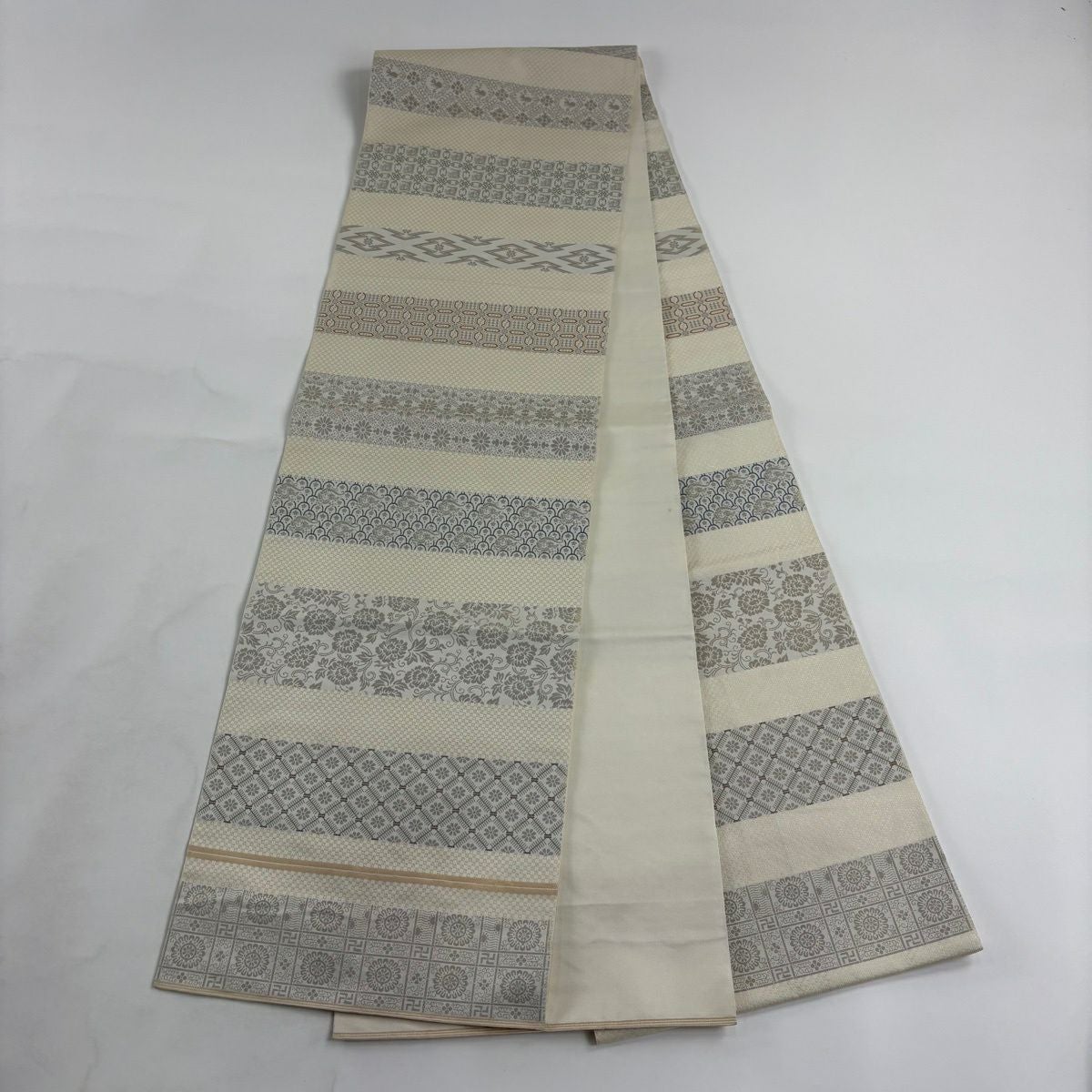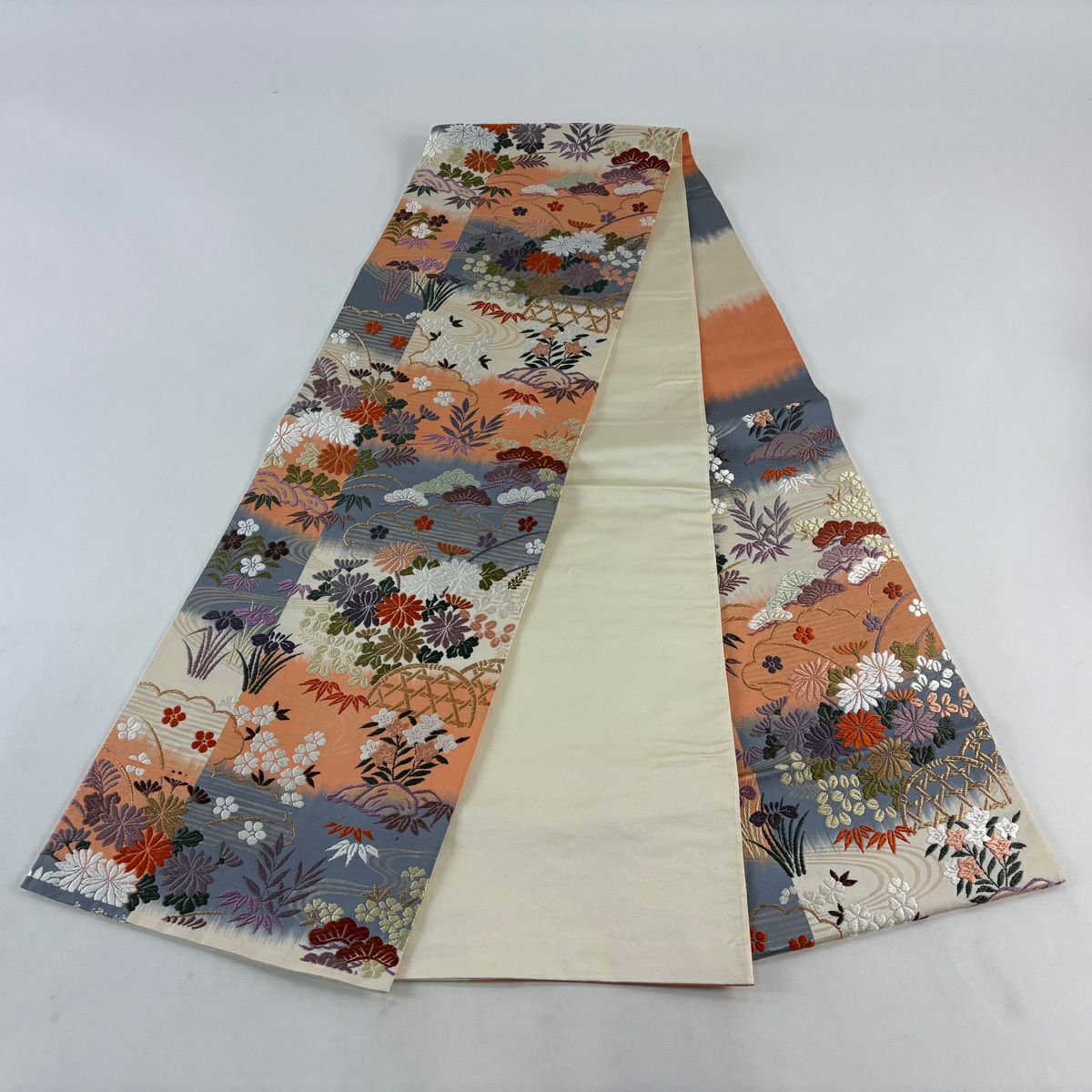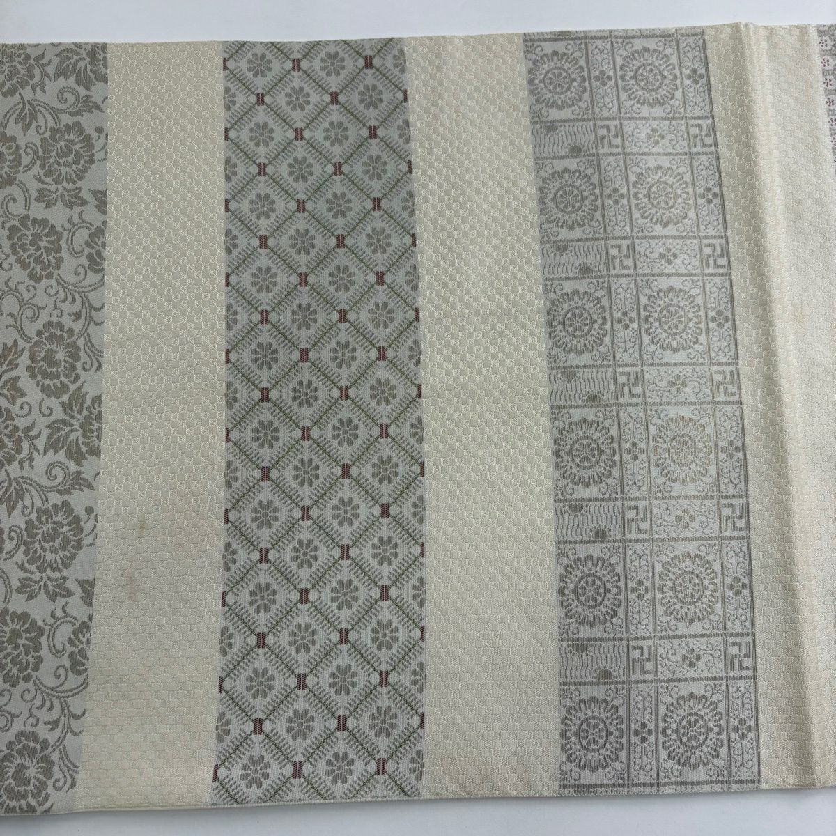 30%OFF 袋帯 秀品 川島織物 落款あり 関西仕立て 草花 段縞 箔 クリーム 全通 正絹 K30