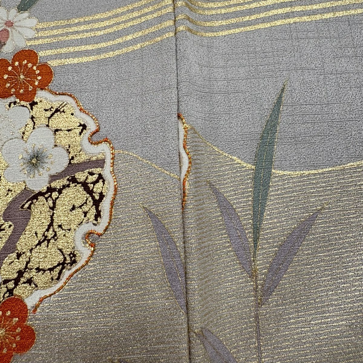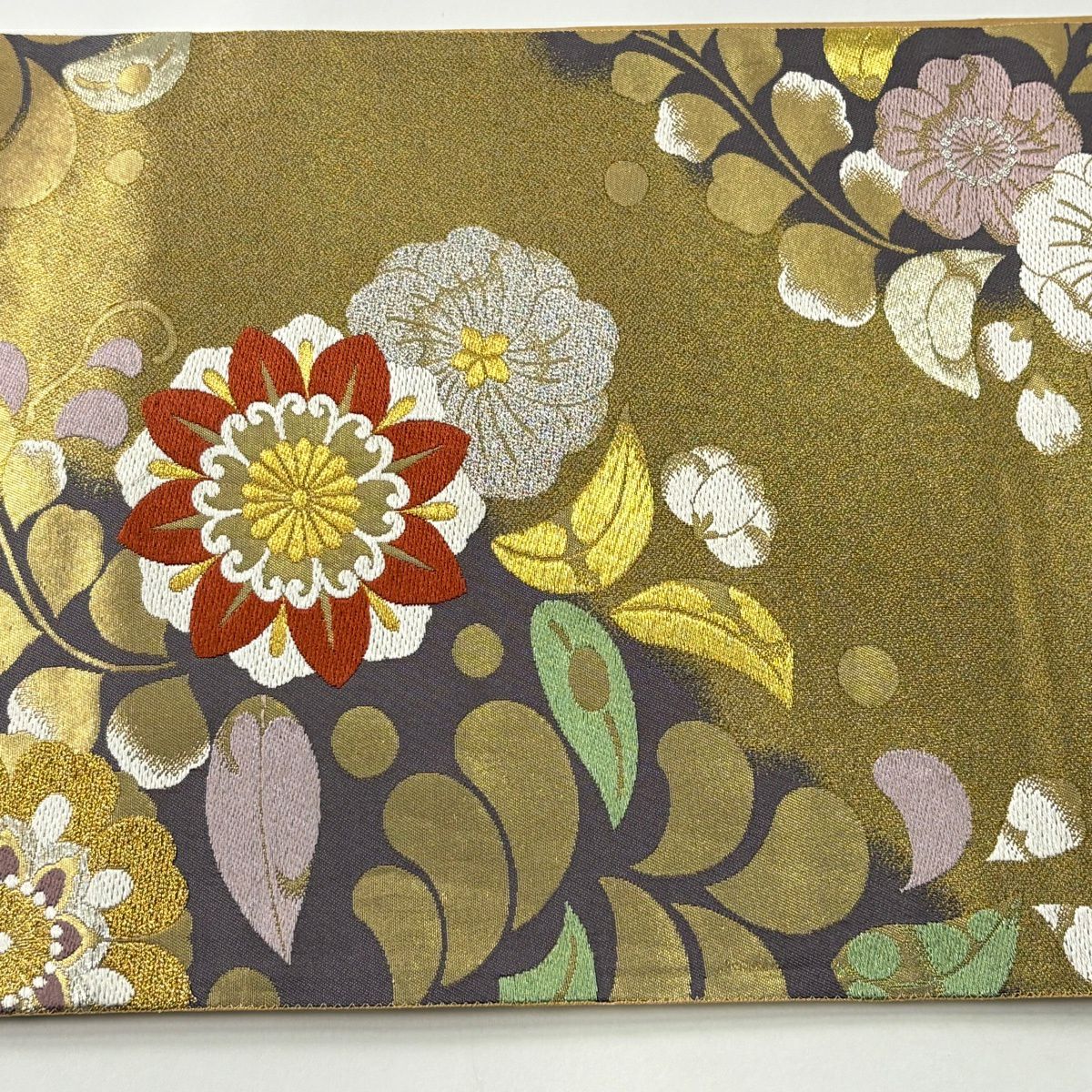 30%OFF 【美品】 袋帯 秀品 証紙あり 振袖向き 草花 霞 金銀糸 箔 灰紫 六通 正絹 K30