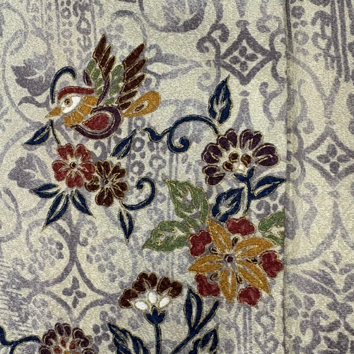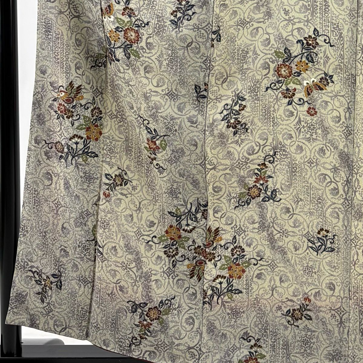 30%OFF 小紋 身丈160cm 裄丈63.5cm S 袷 花唐草 鳥 金彩 灰白 正絹 秀品 K30