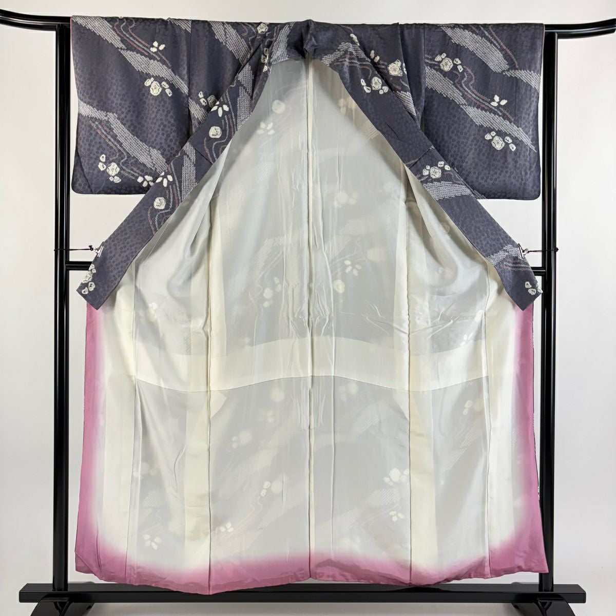 30%OFF 小紋 身丈155cm 裄丈63cm S 袷 辻が花柄 流水 絞り 灰紫 正絹 秀品 K30