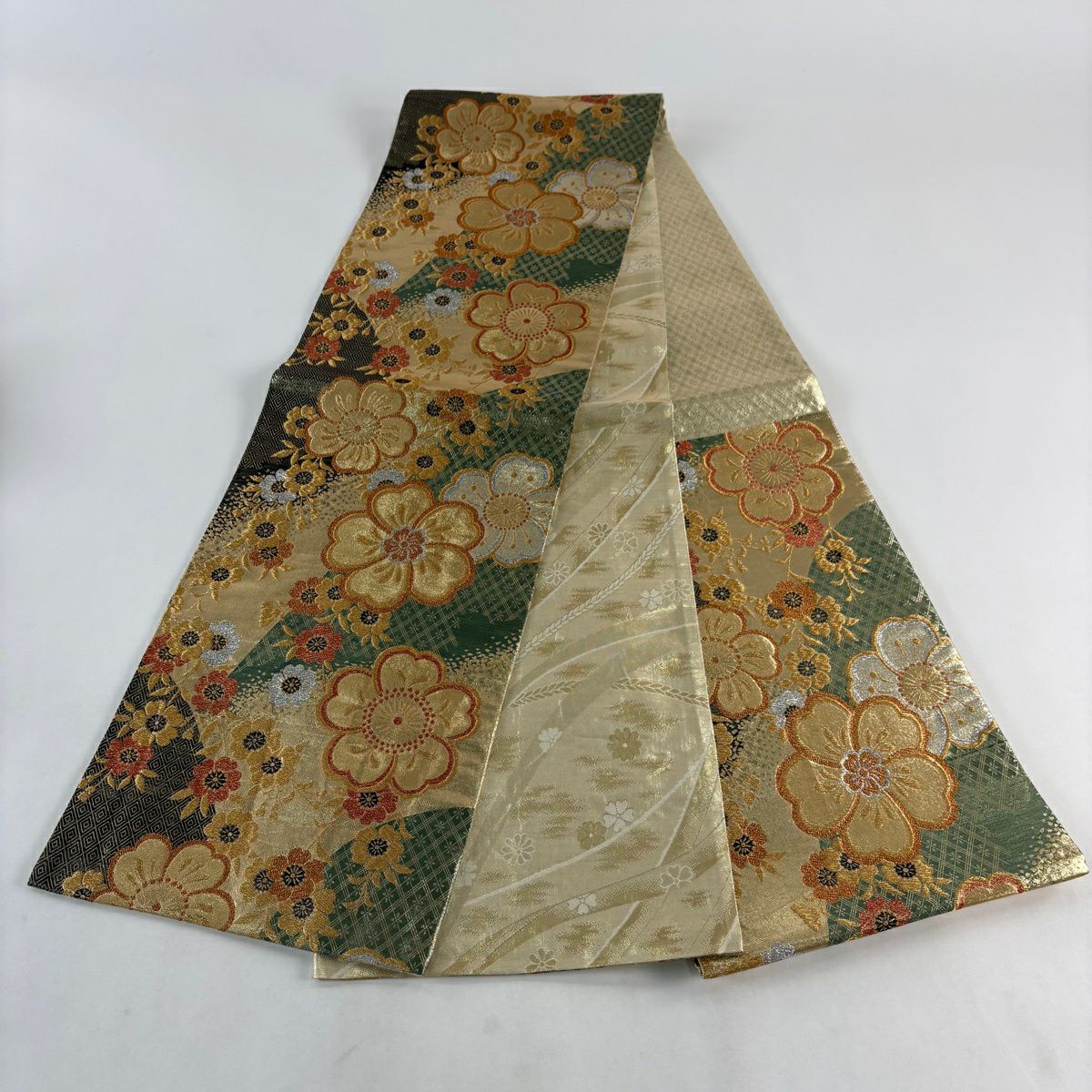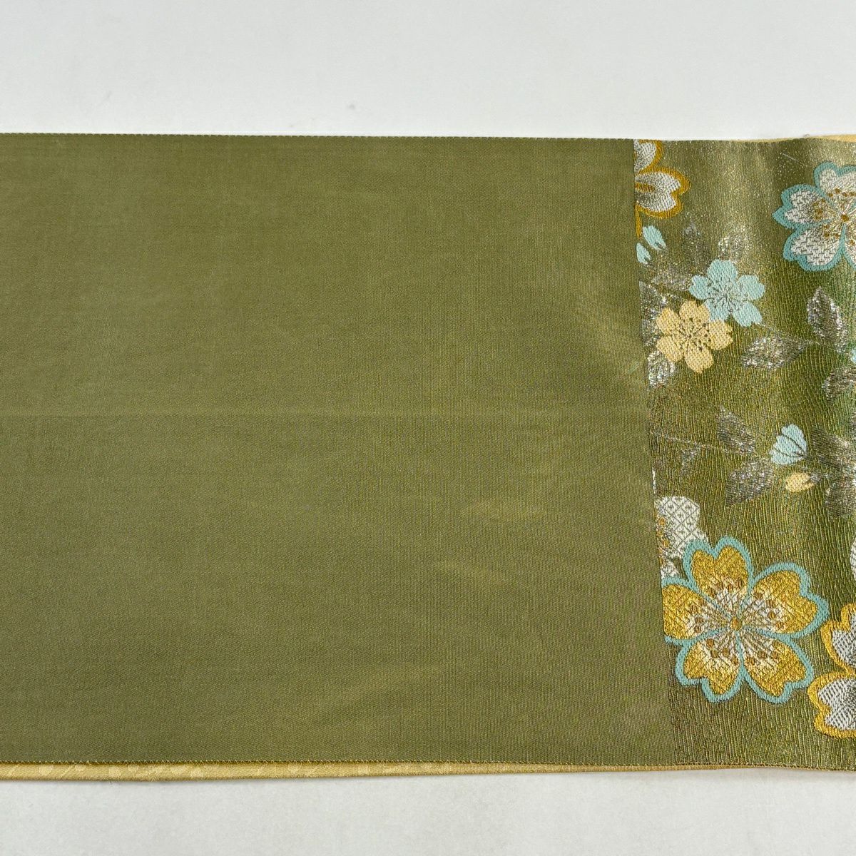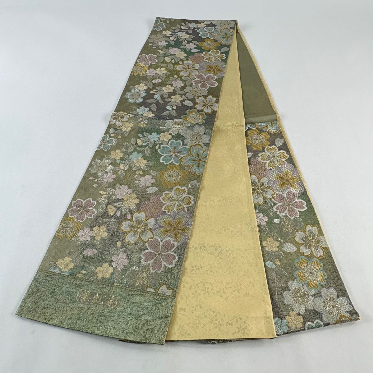 袋帯 秀品 証紙あり 桜 箔 金糸 よもぎ色 六通 正絹