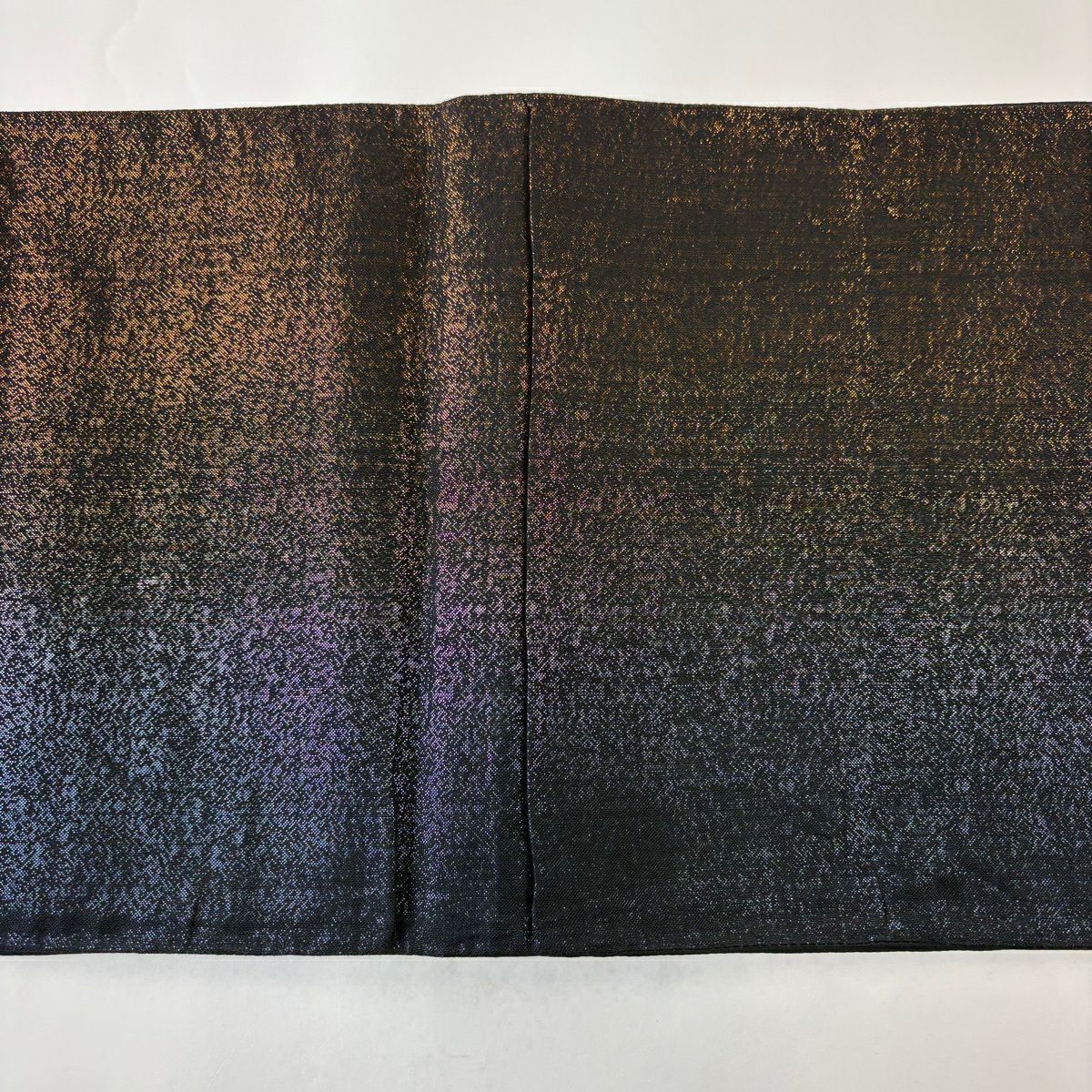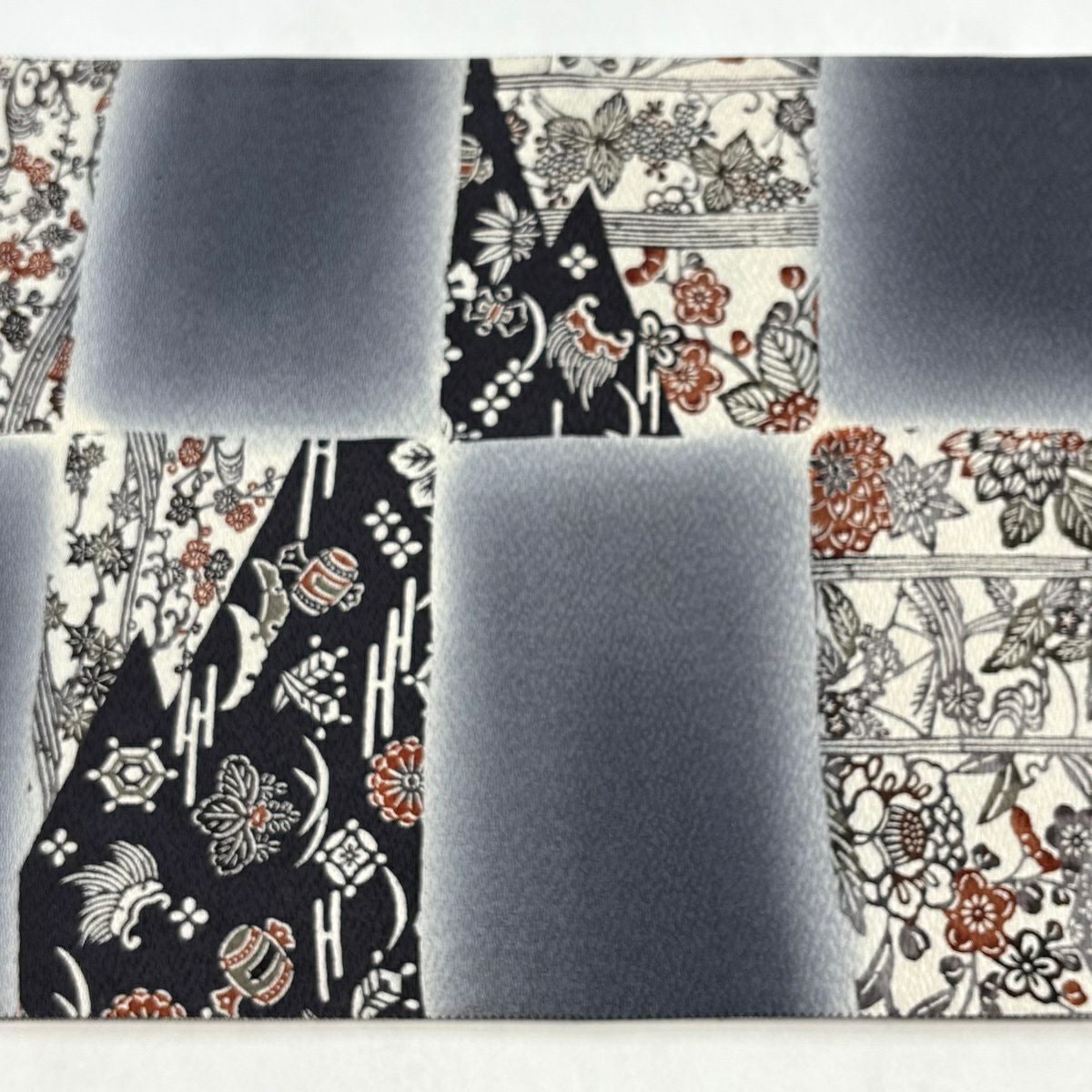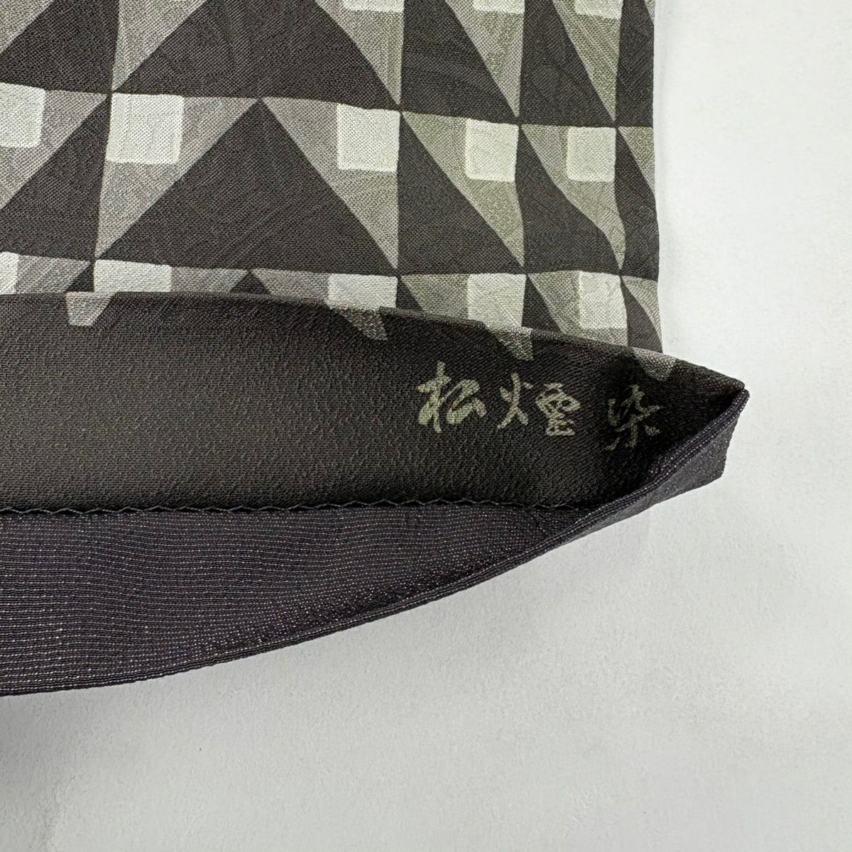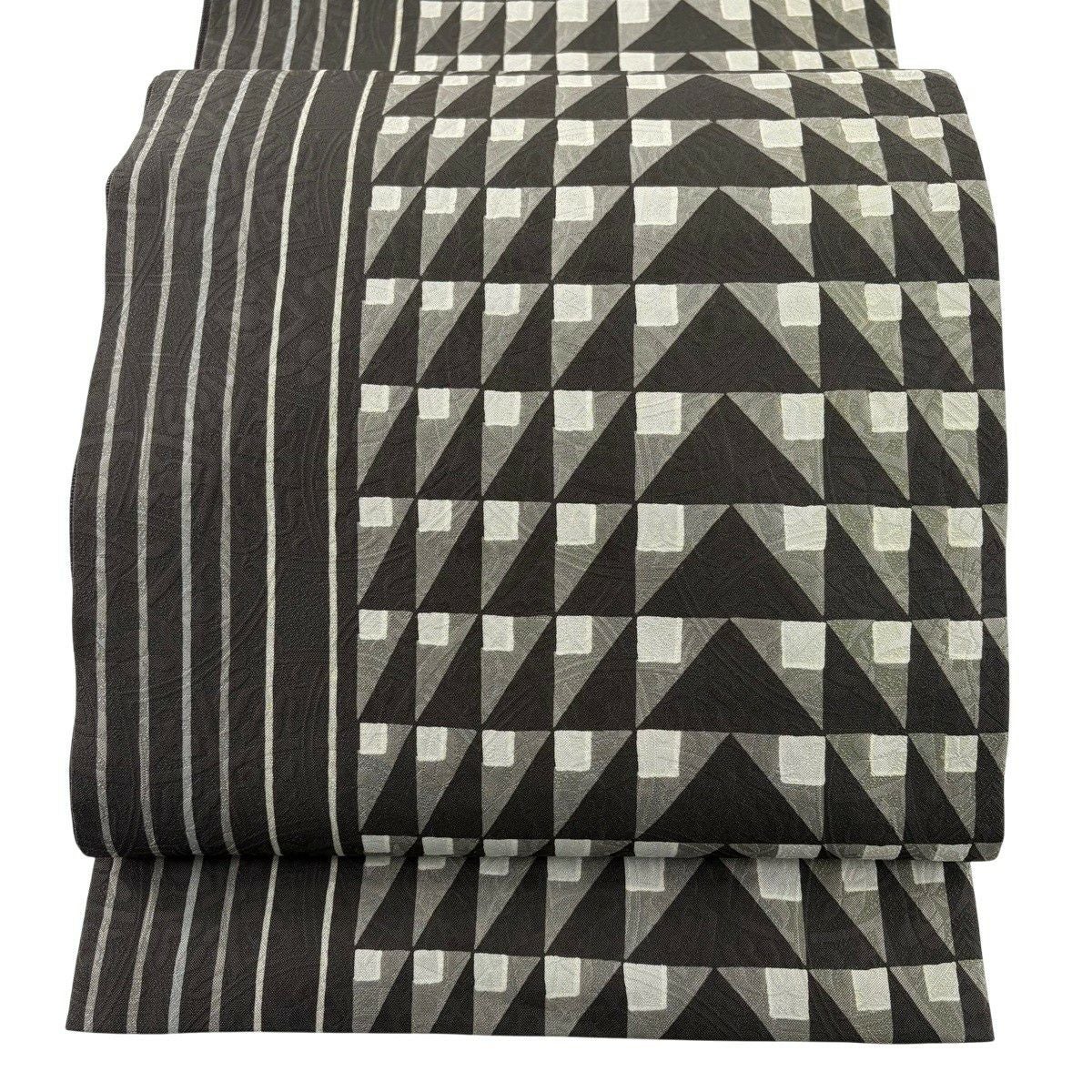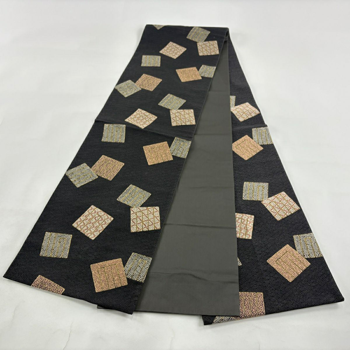 袋帯 秀品 市松 幾何学模様 銀通し 箔 黒 六通 正絹