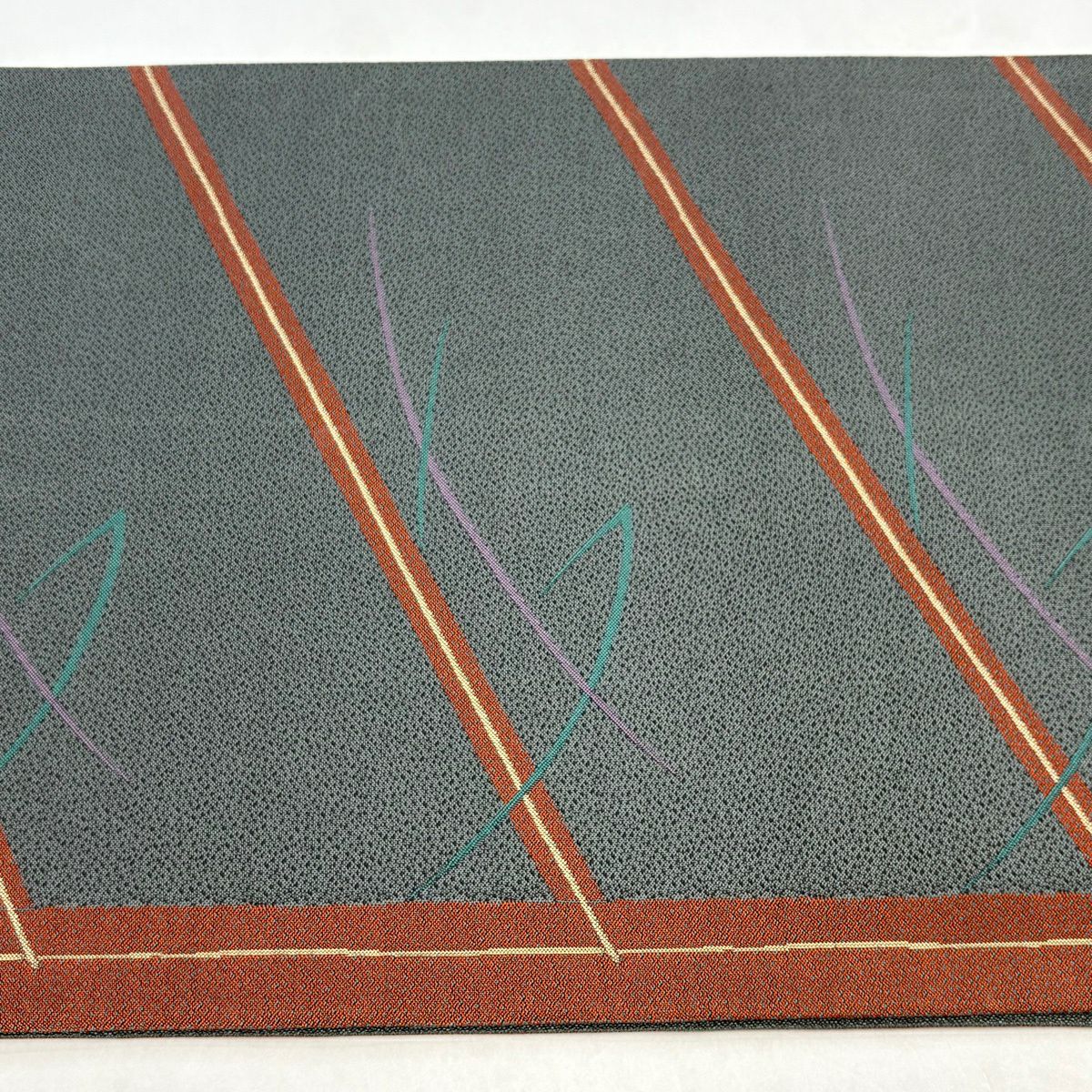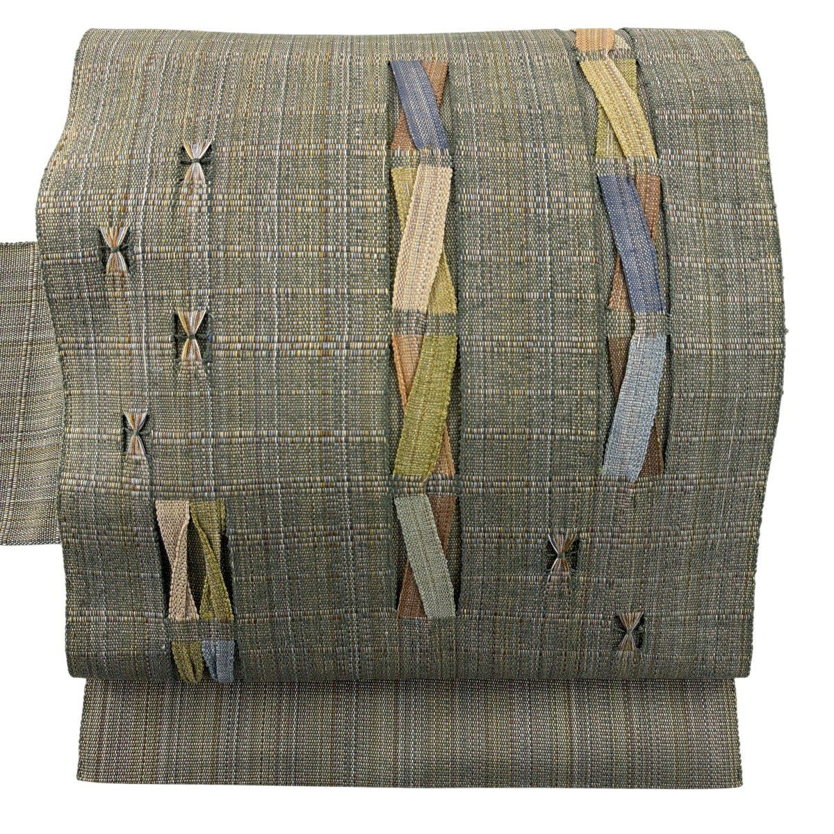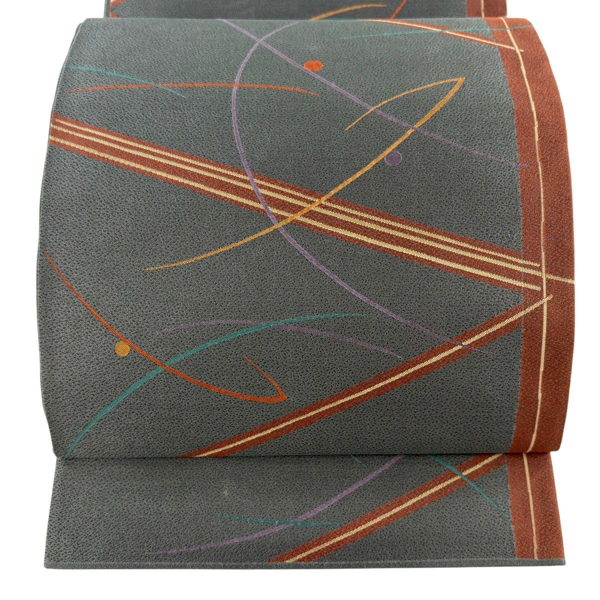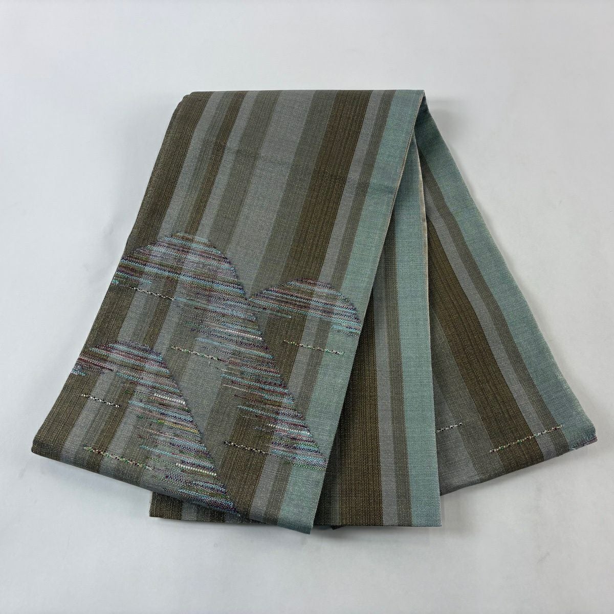 【美品】 名古屋帯 秀品 八寸名古屋帯 幾何学模様 灰緑 正絹