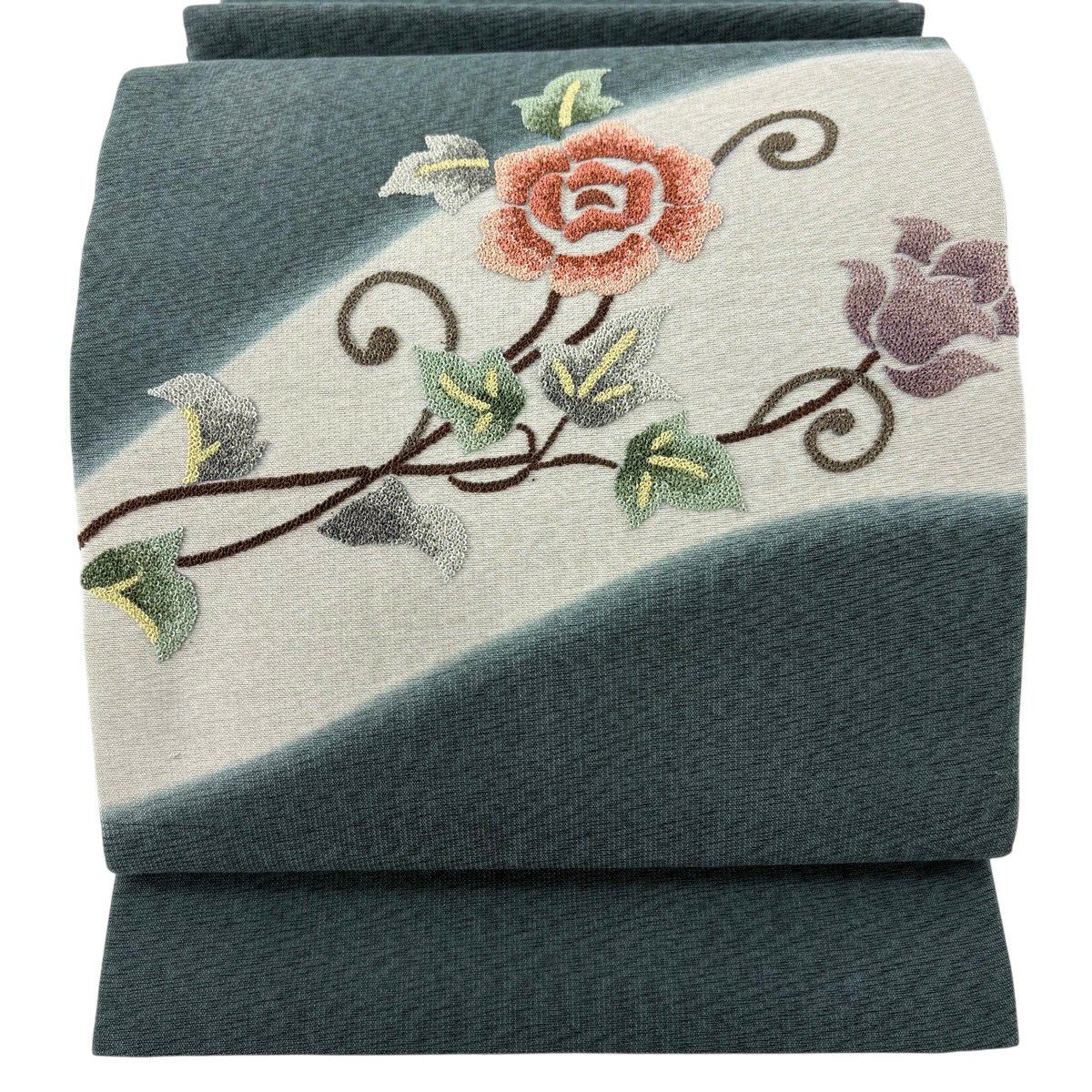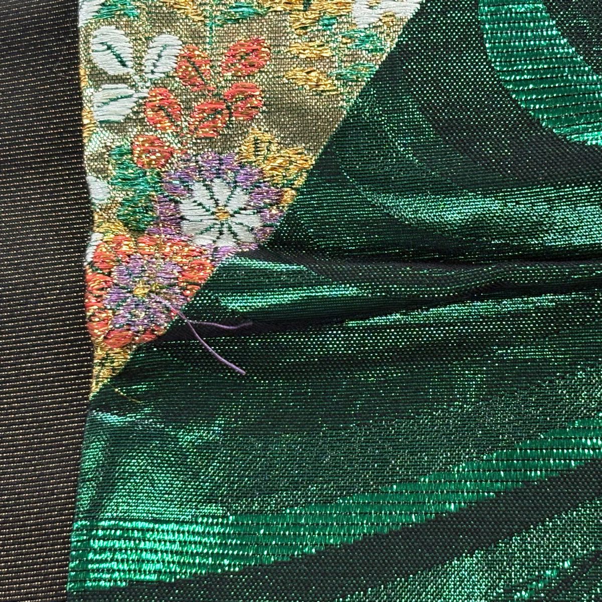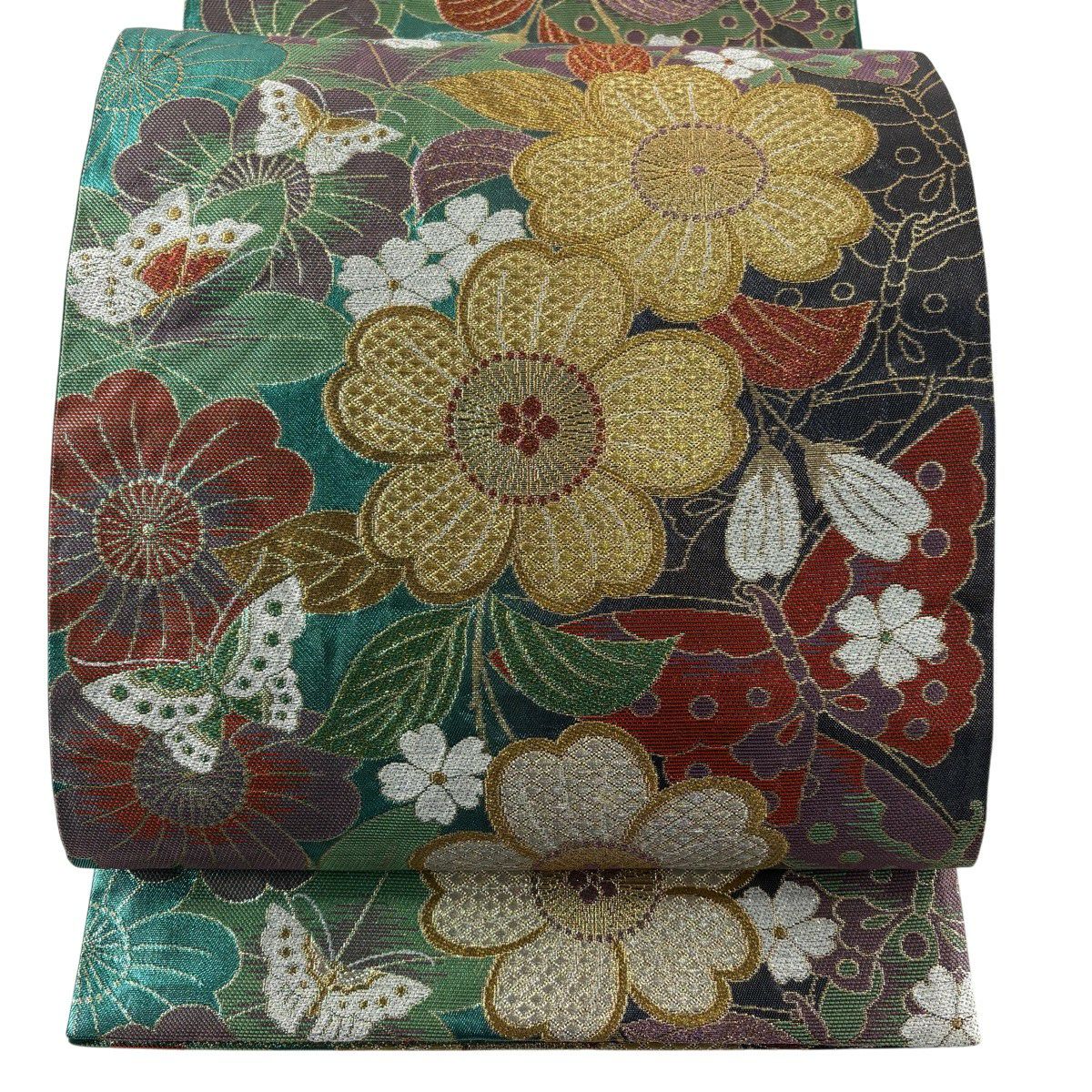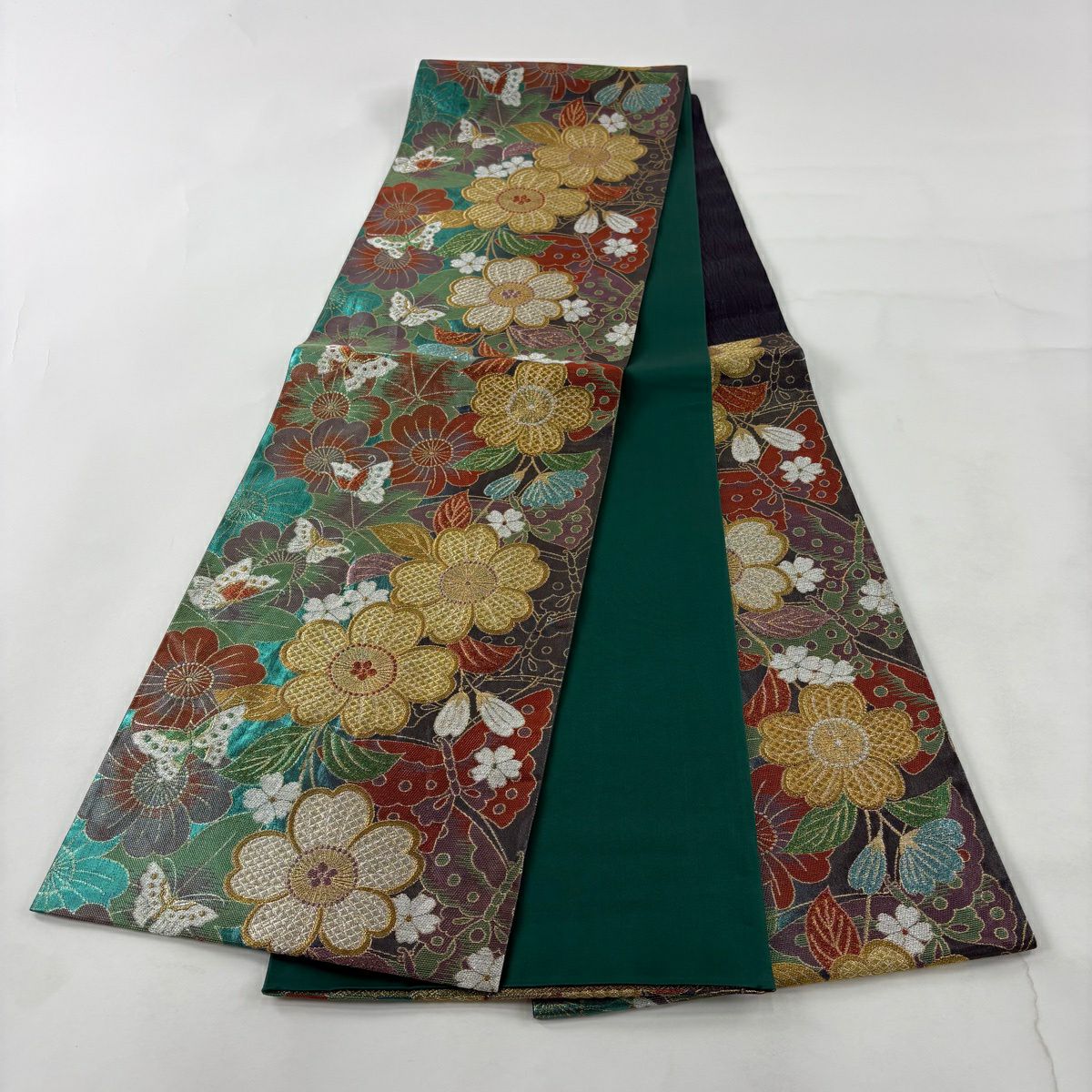 【美品】 開き名古屋帯 秀品 草花 相良刺繍 深緑 正絹