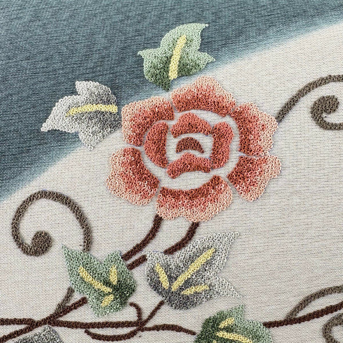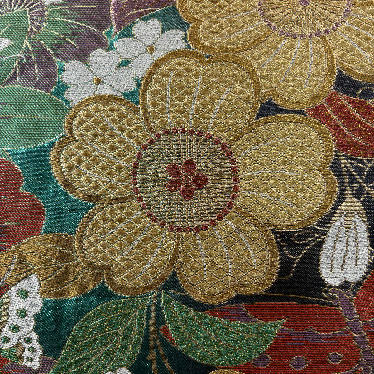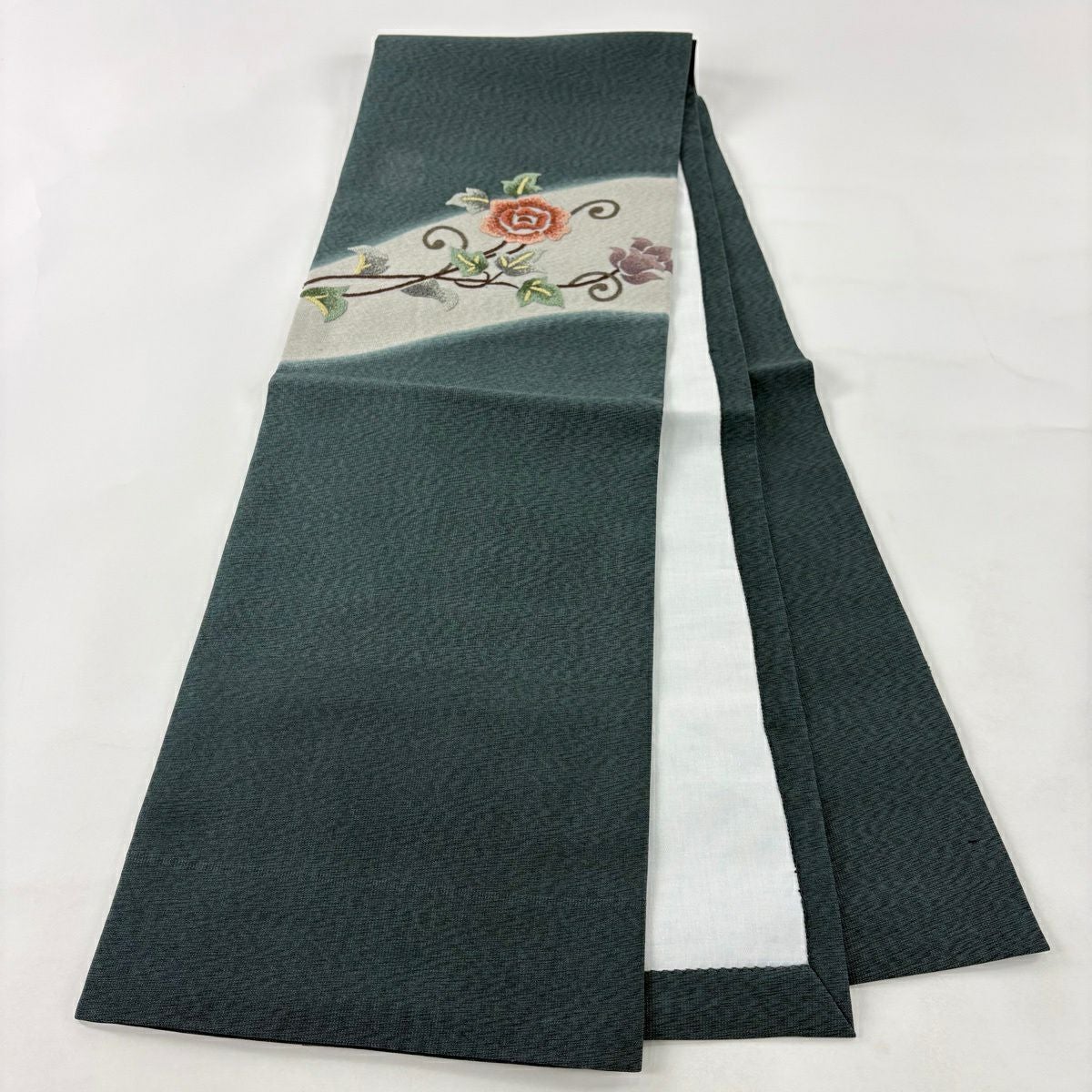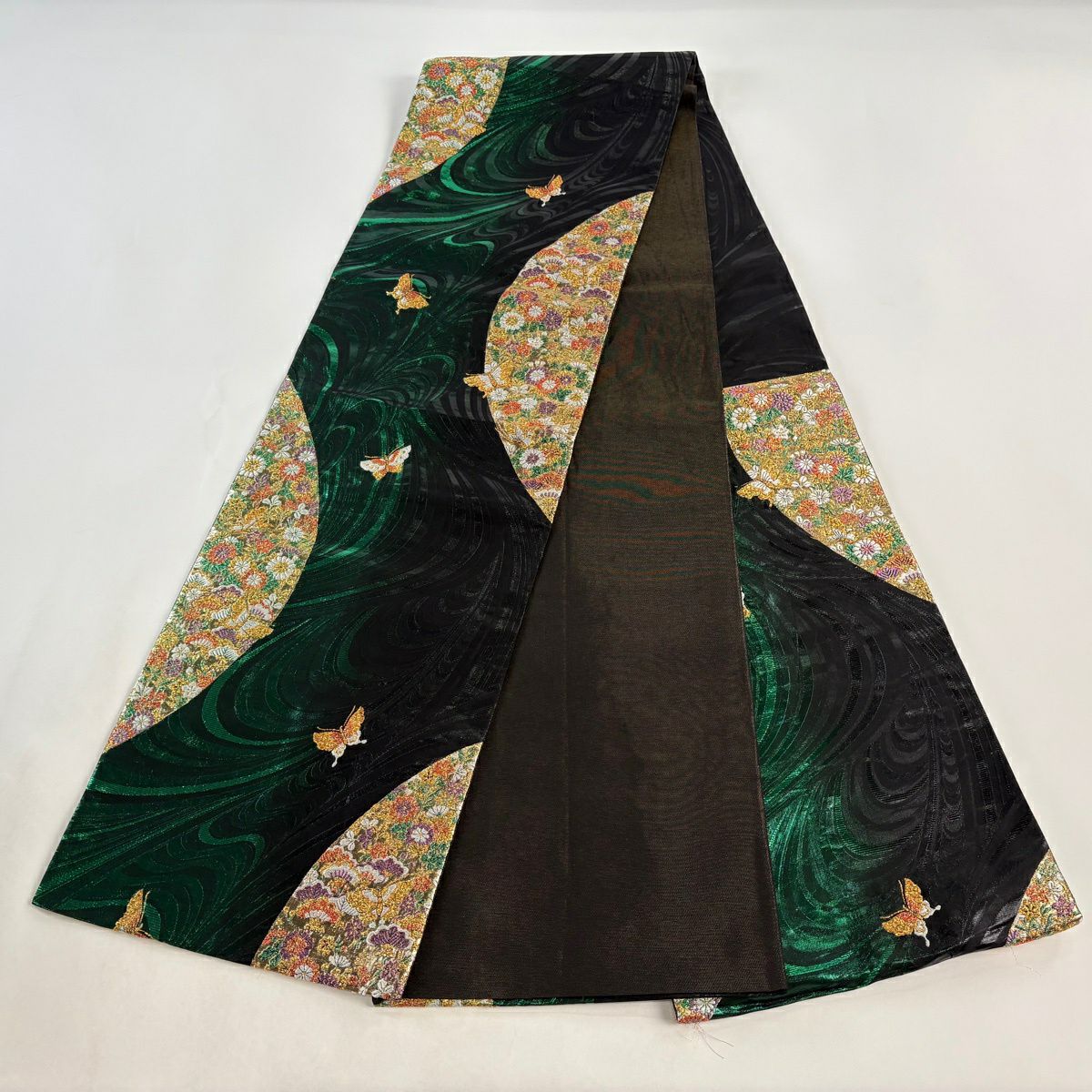 【美品】 開き名古屋帯 秀品 草花 相良刺繍 深緑 正絹