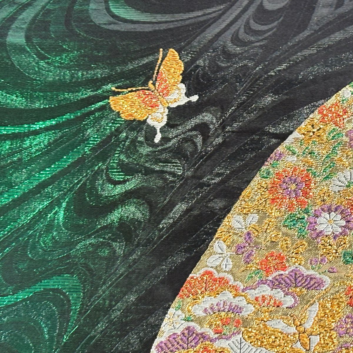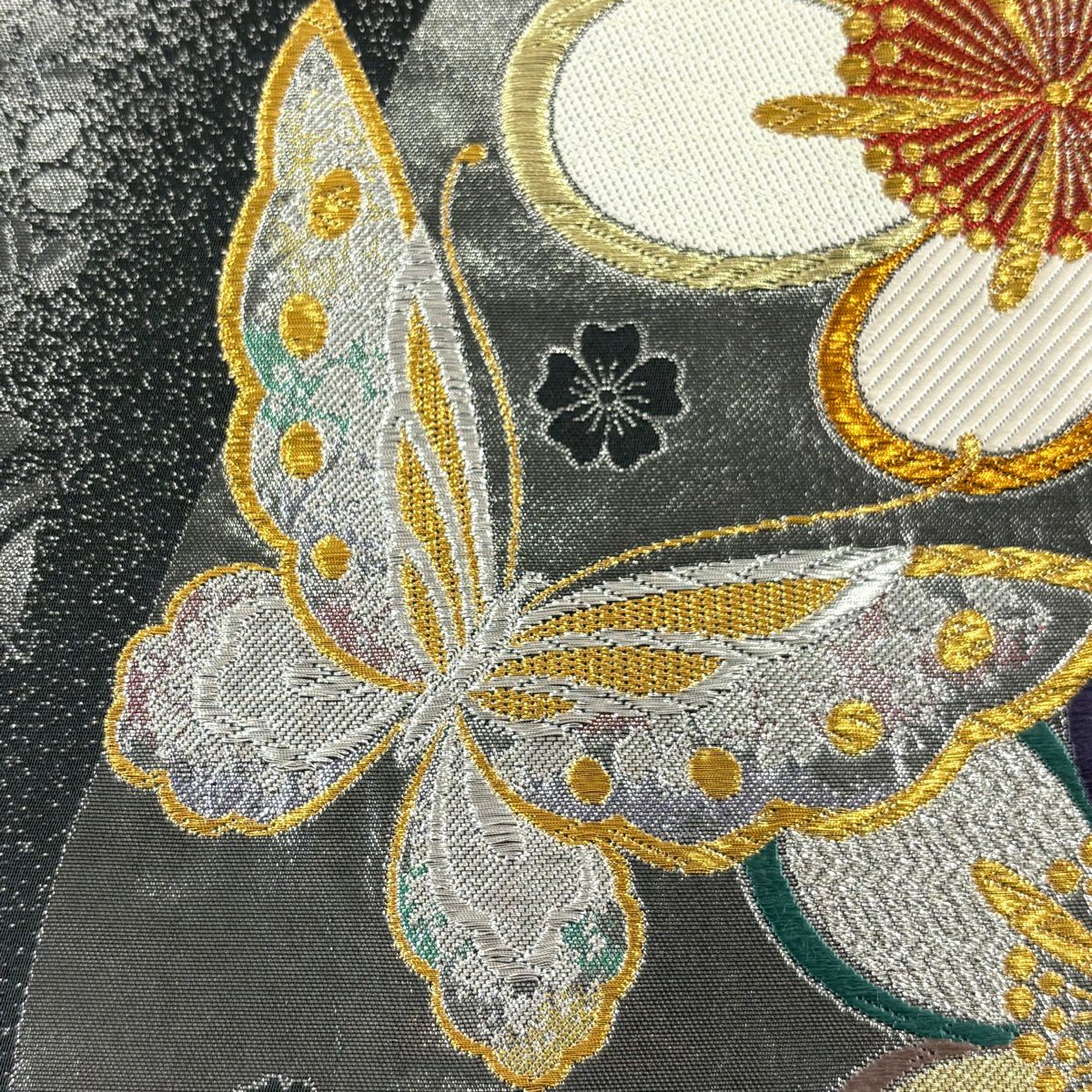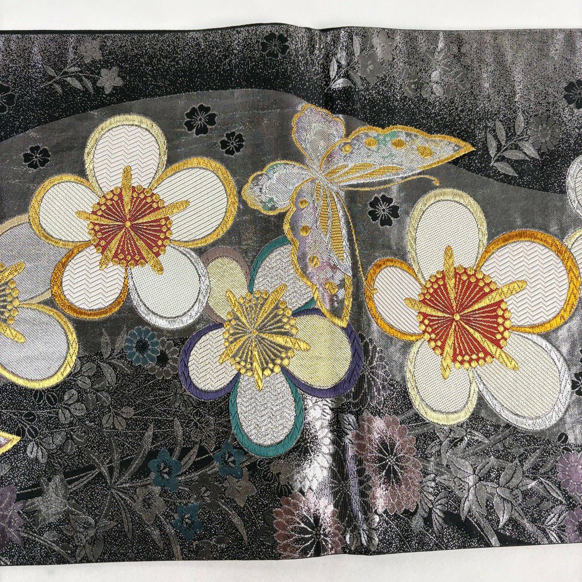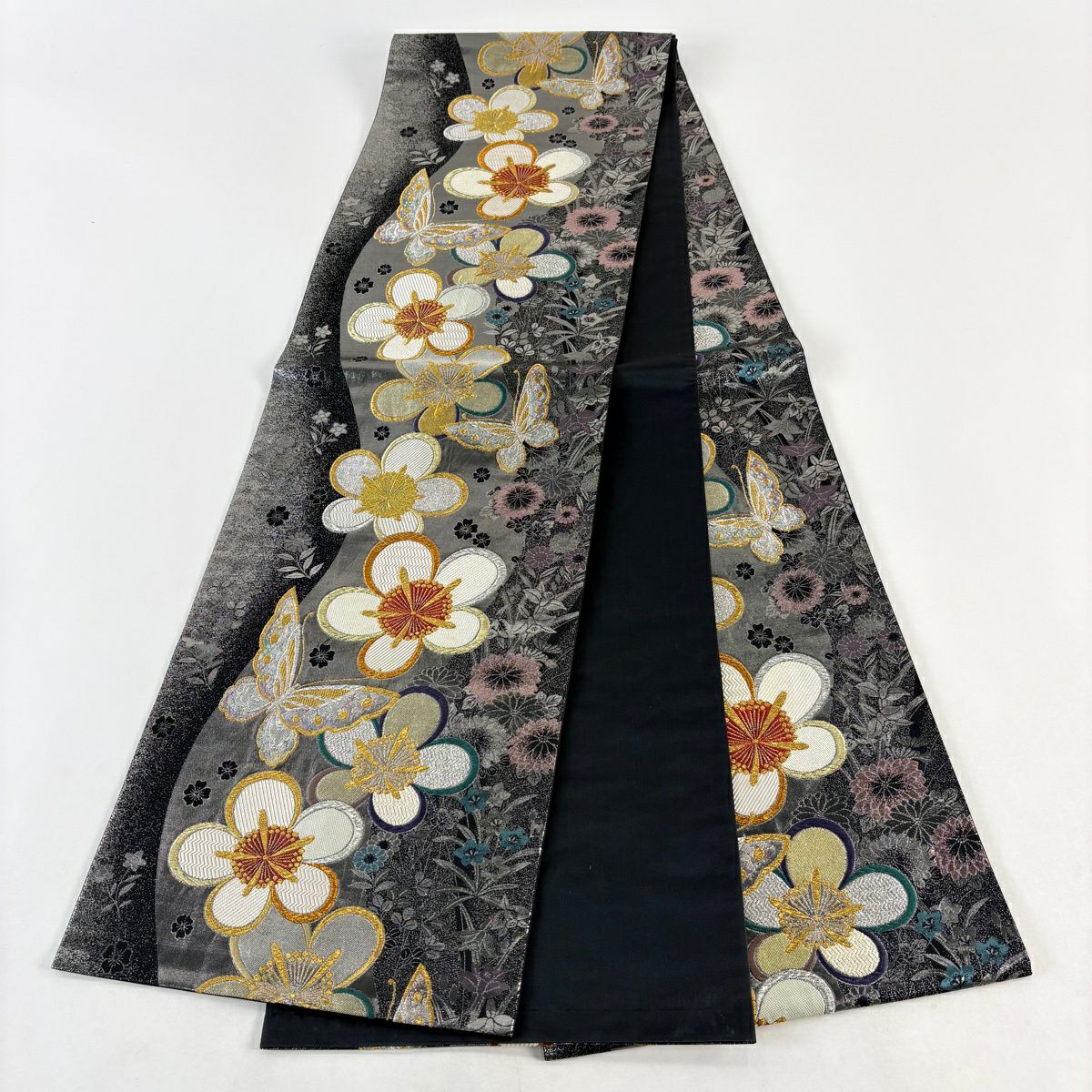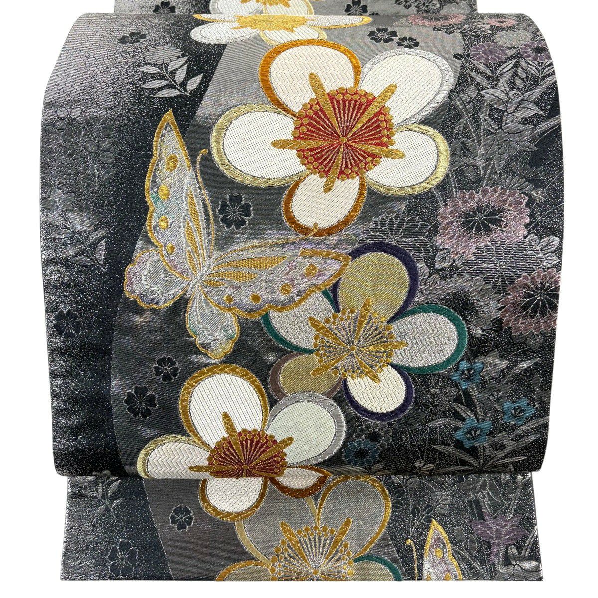 袋帯 秀品 優都里 梅 蝶 金銀糸 箔 墨色 全通 正絹