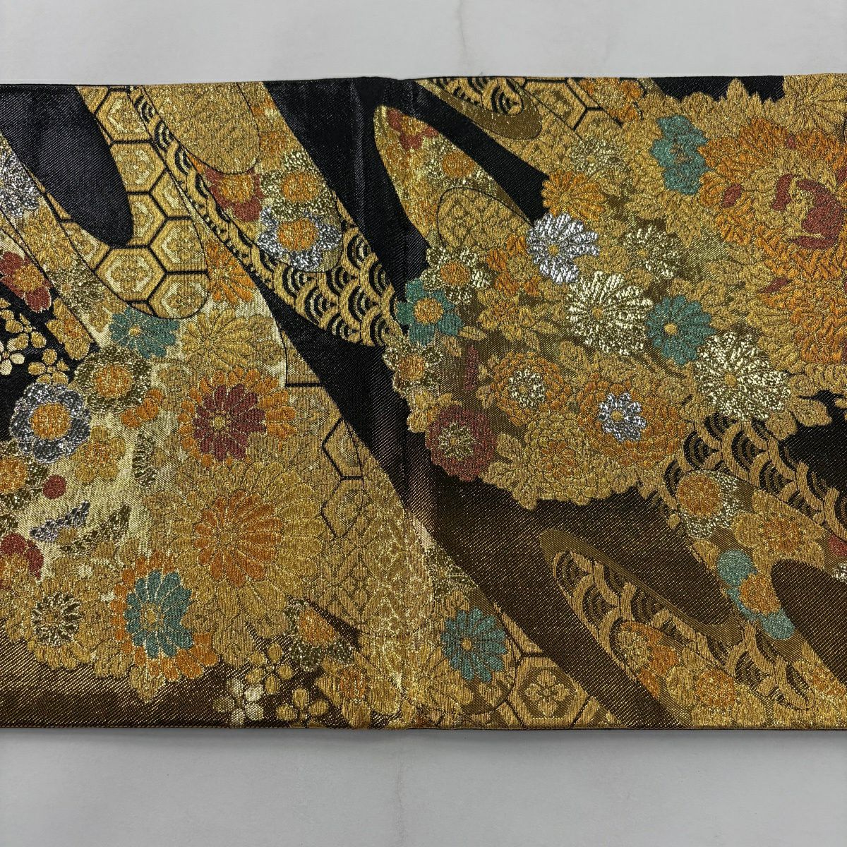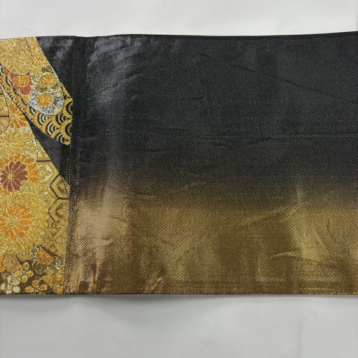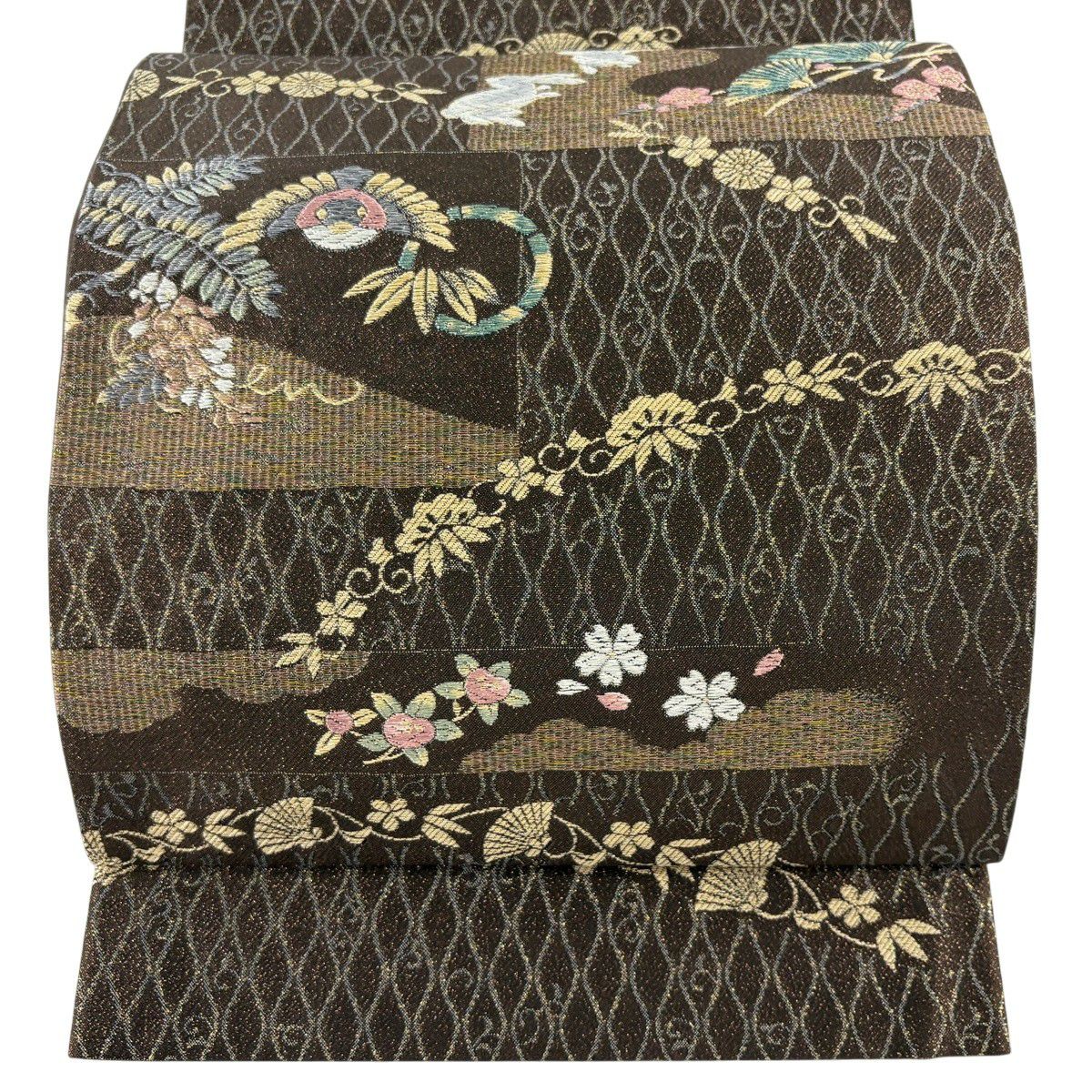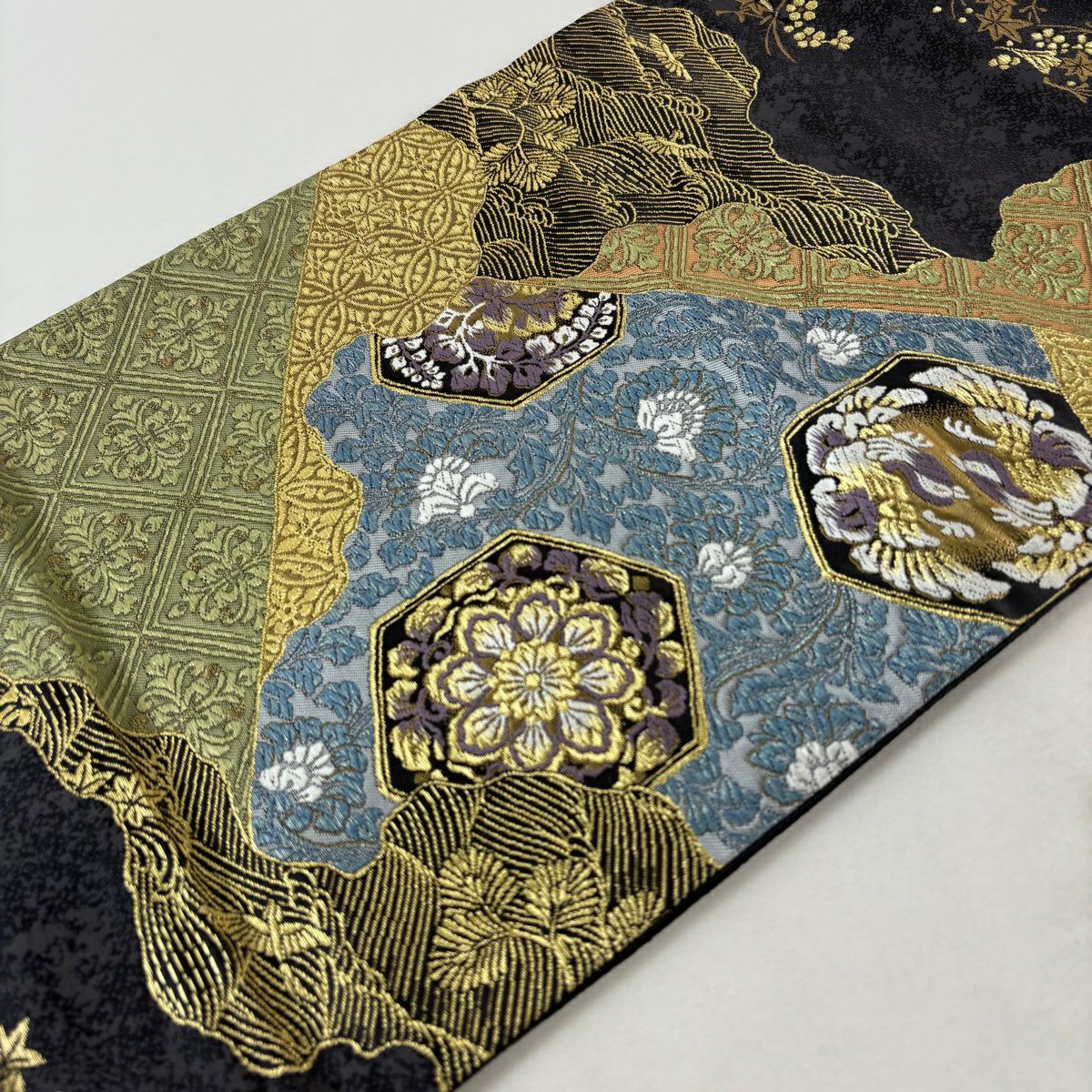 【美品】 袋帯 秀品 花鳥 菱 金糸 箔 黒 六通 正絹