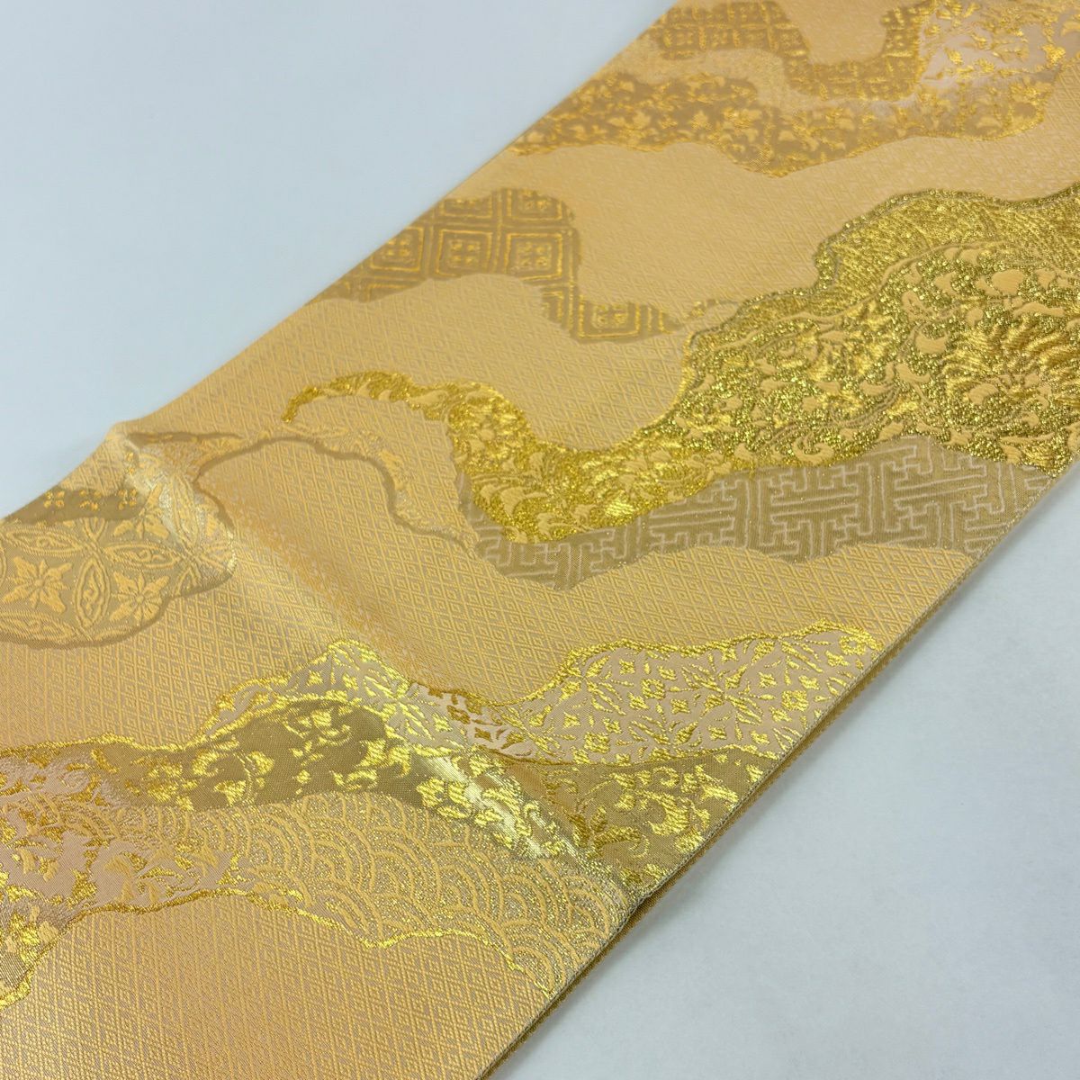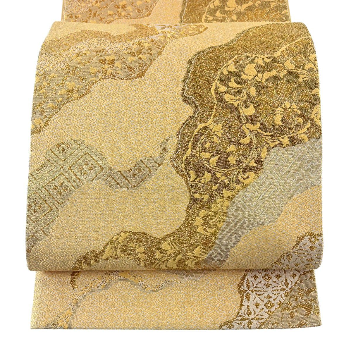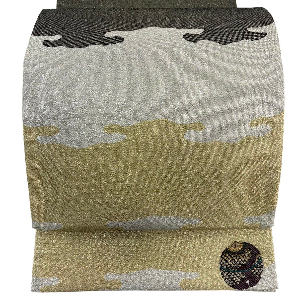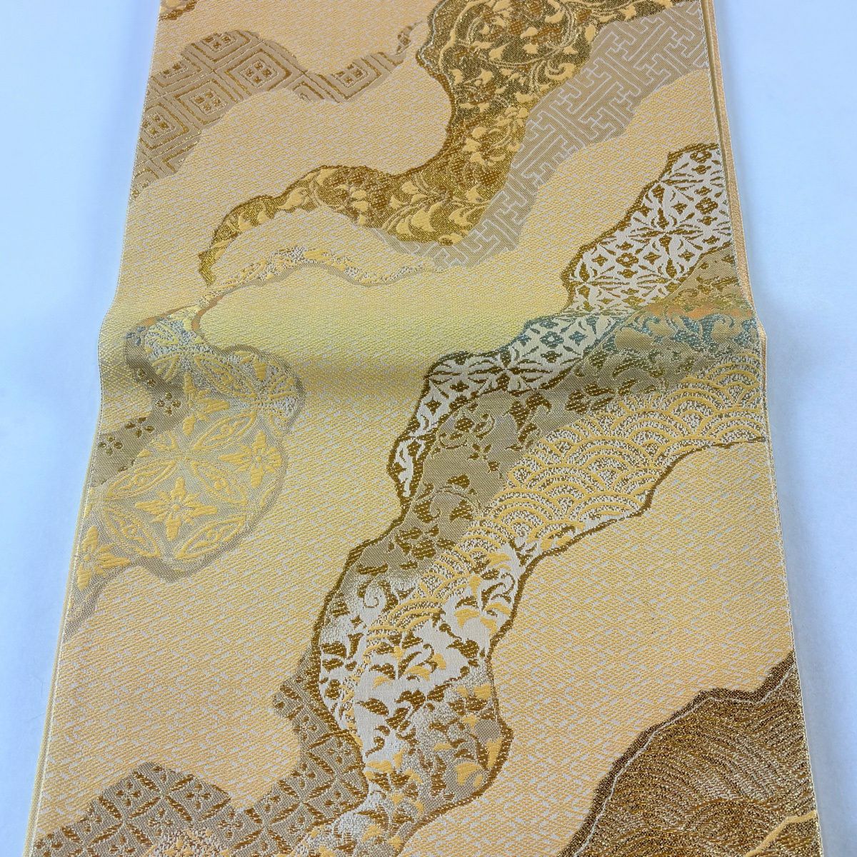 袋帯 秀品 霞 幾何学模様 箔 ベージュ 六通 正絹