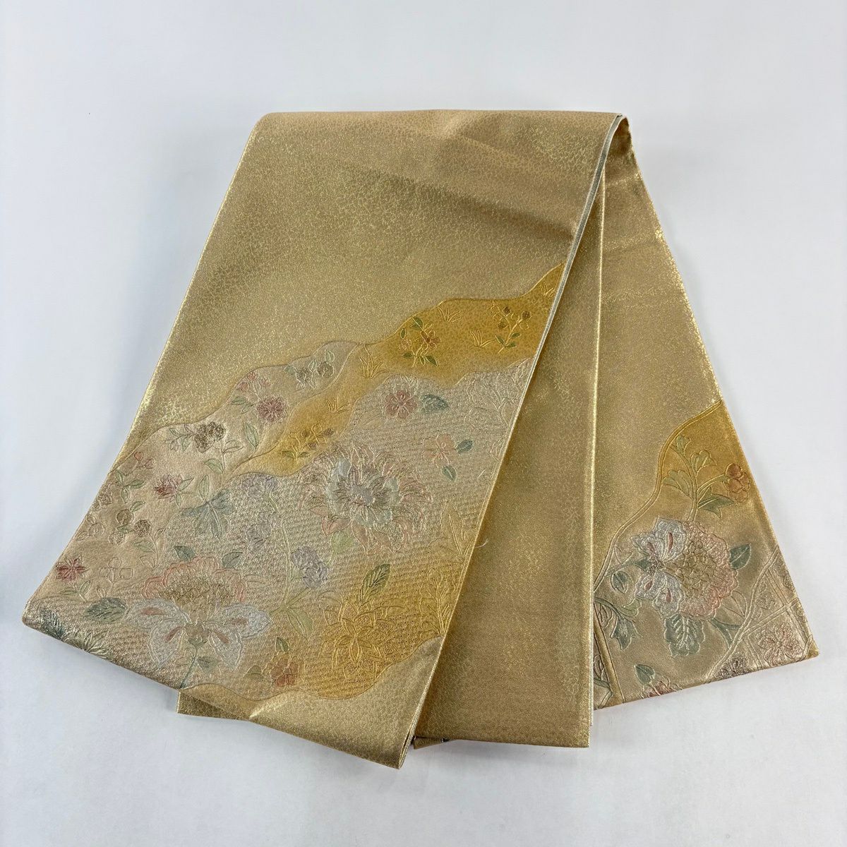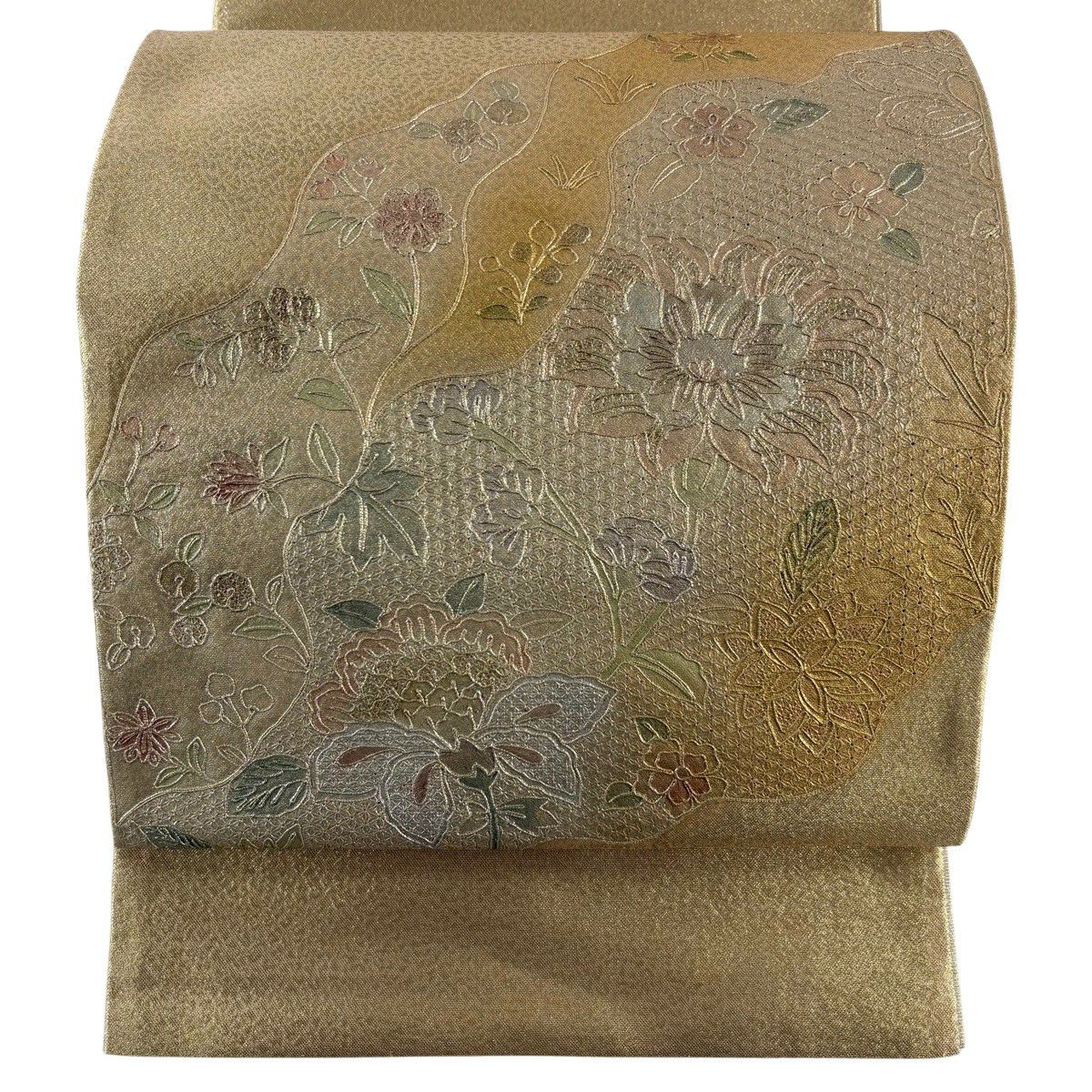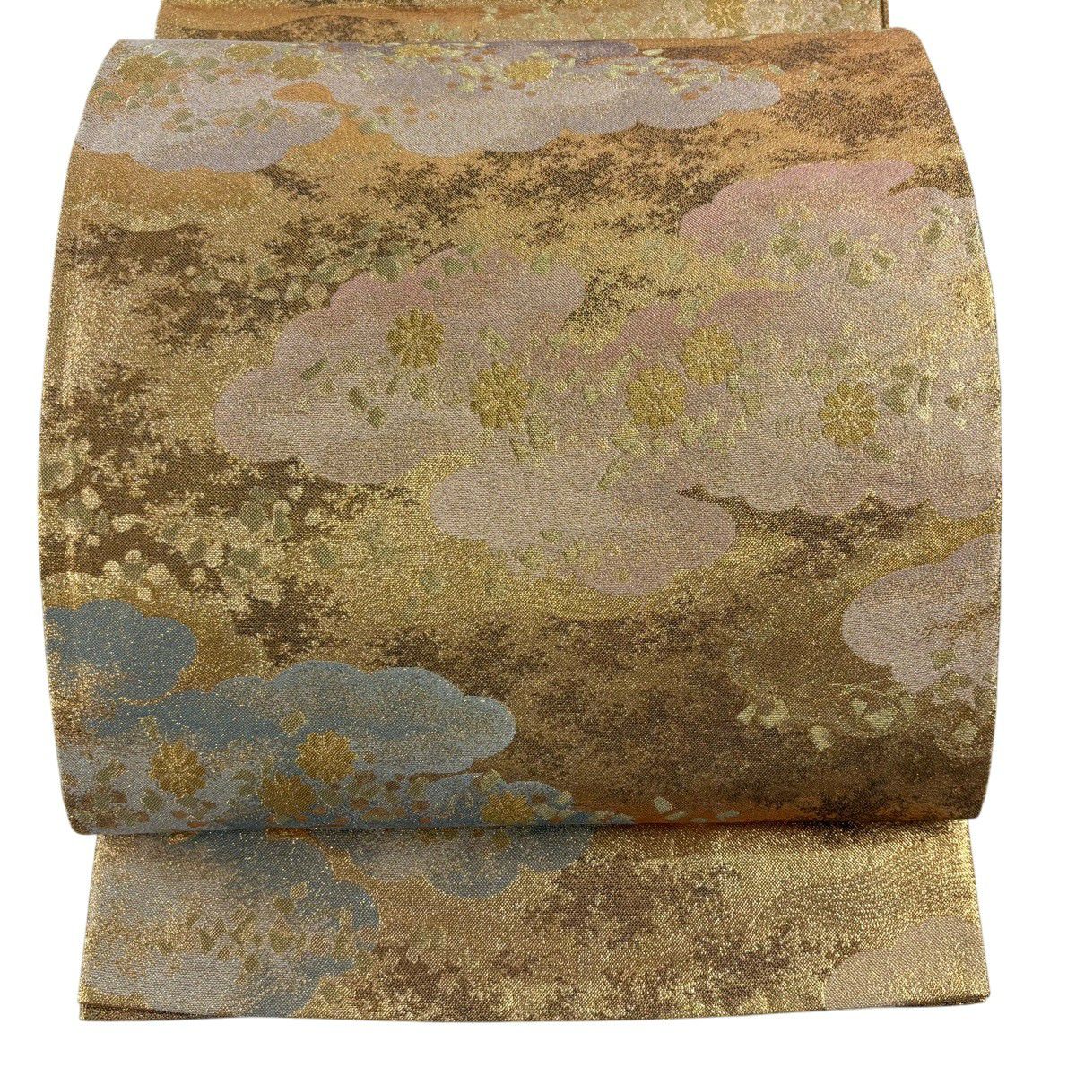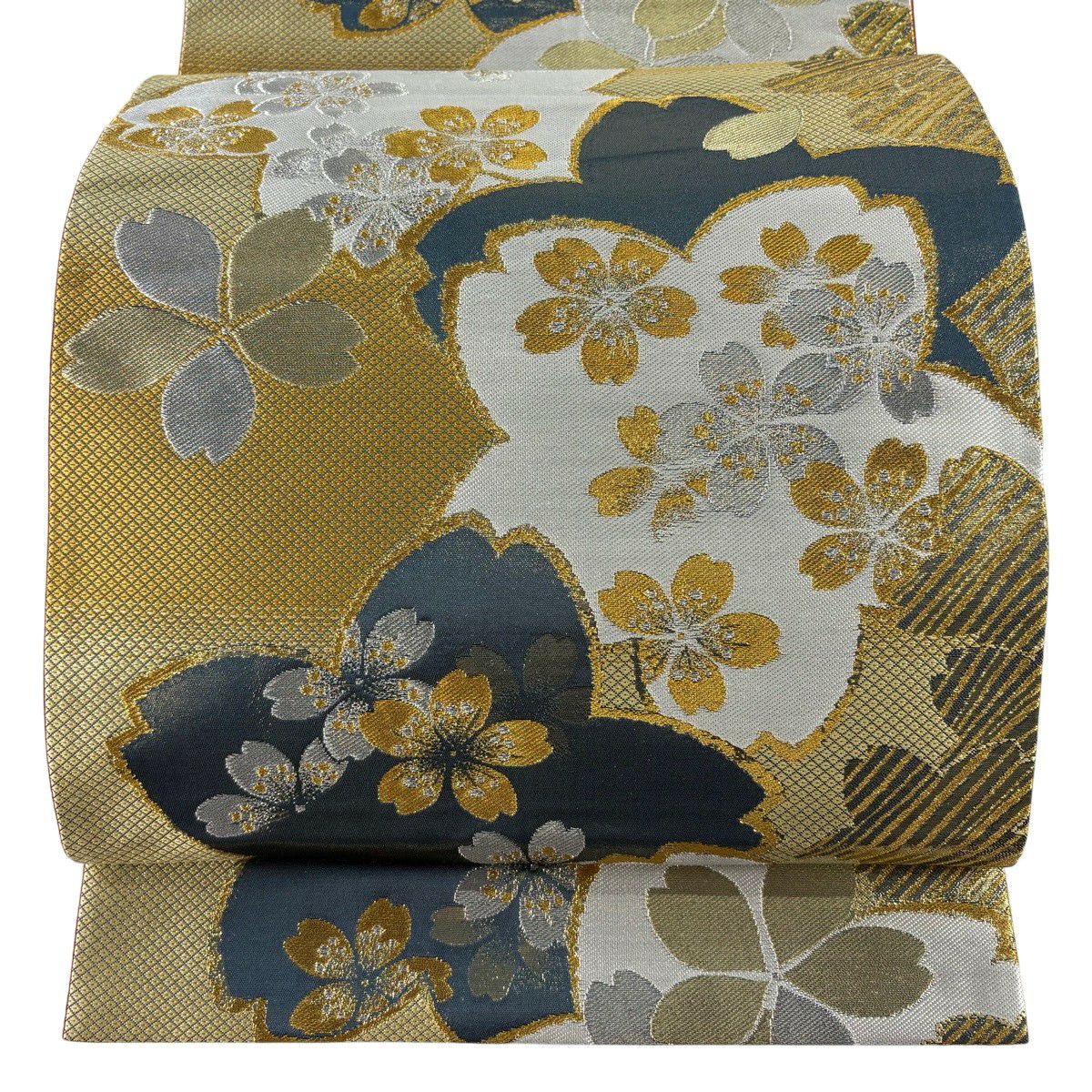 袋帯 秀品 花浪漫 桜 金銀糸 箔 薄黄土色 六通 正絹