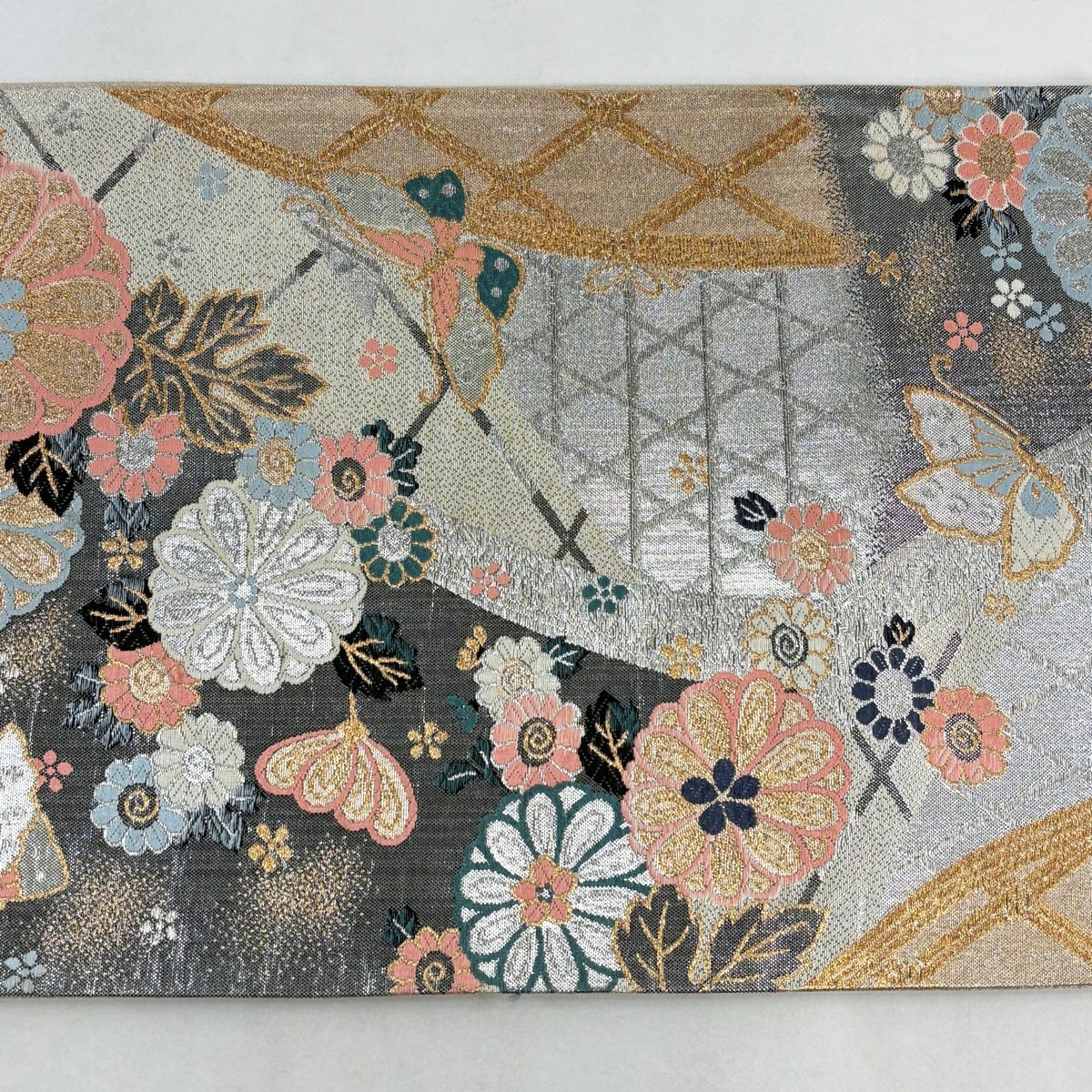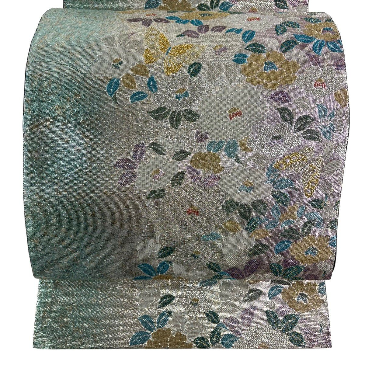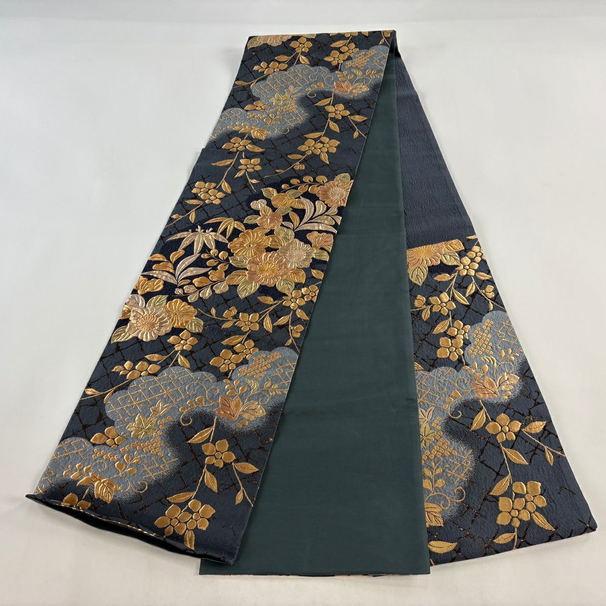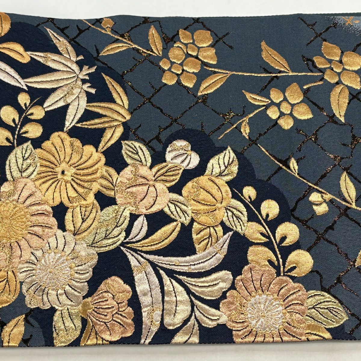 袋帯 秀品 草花 斜格子 金銀糸 箔 青灰色 六通 正絹