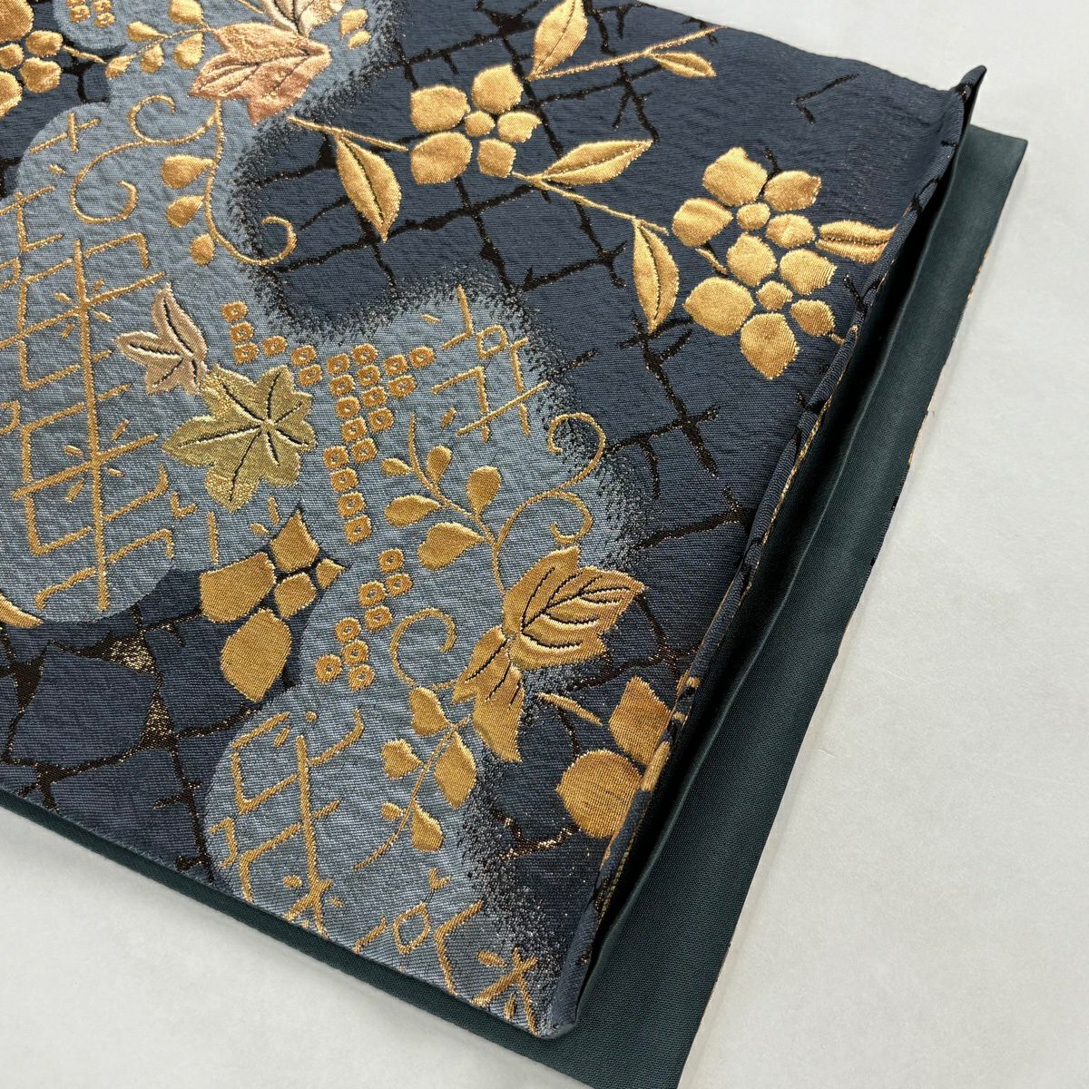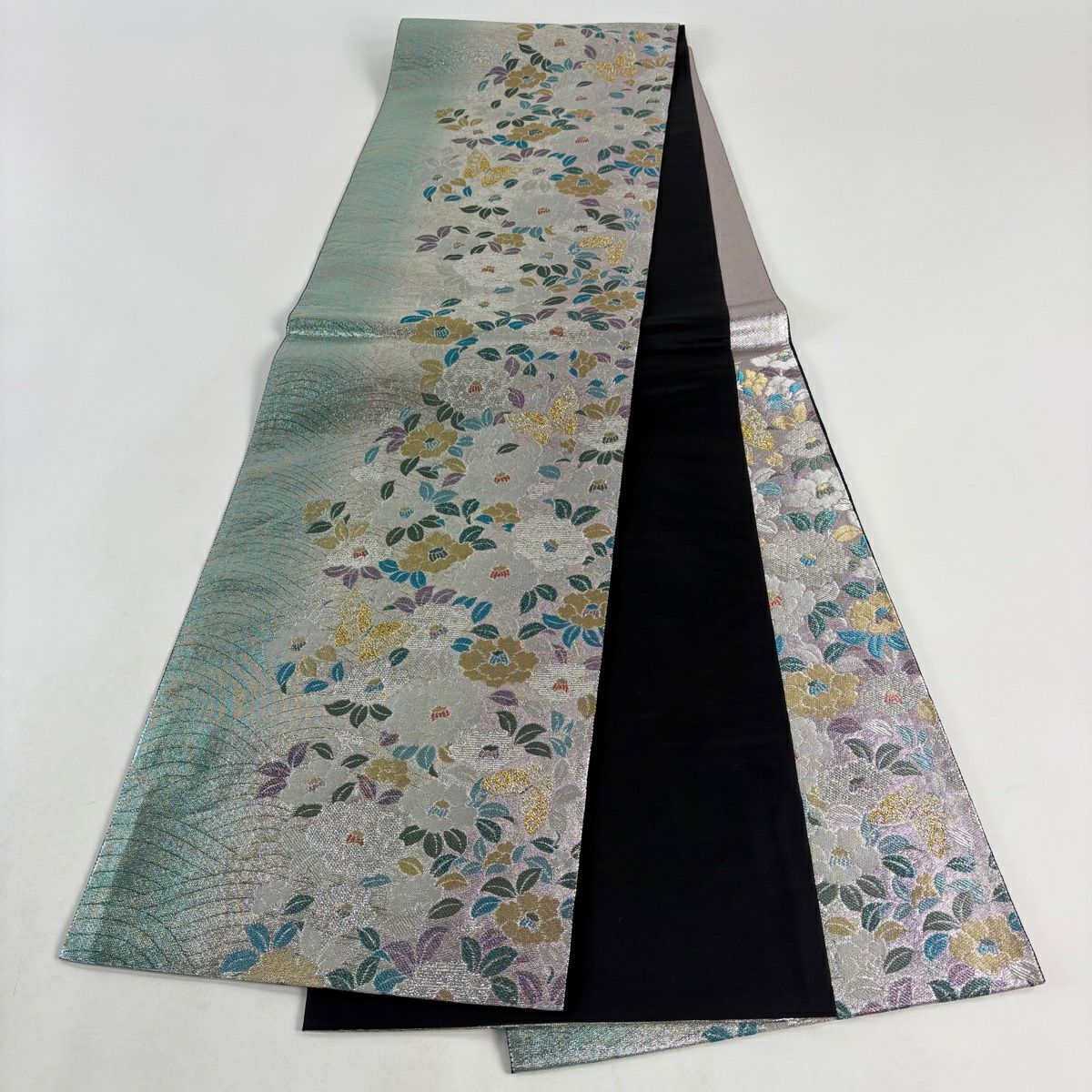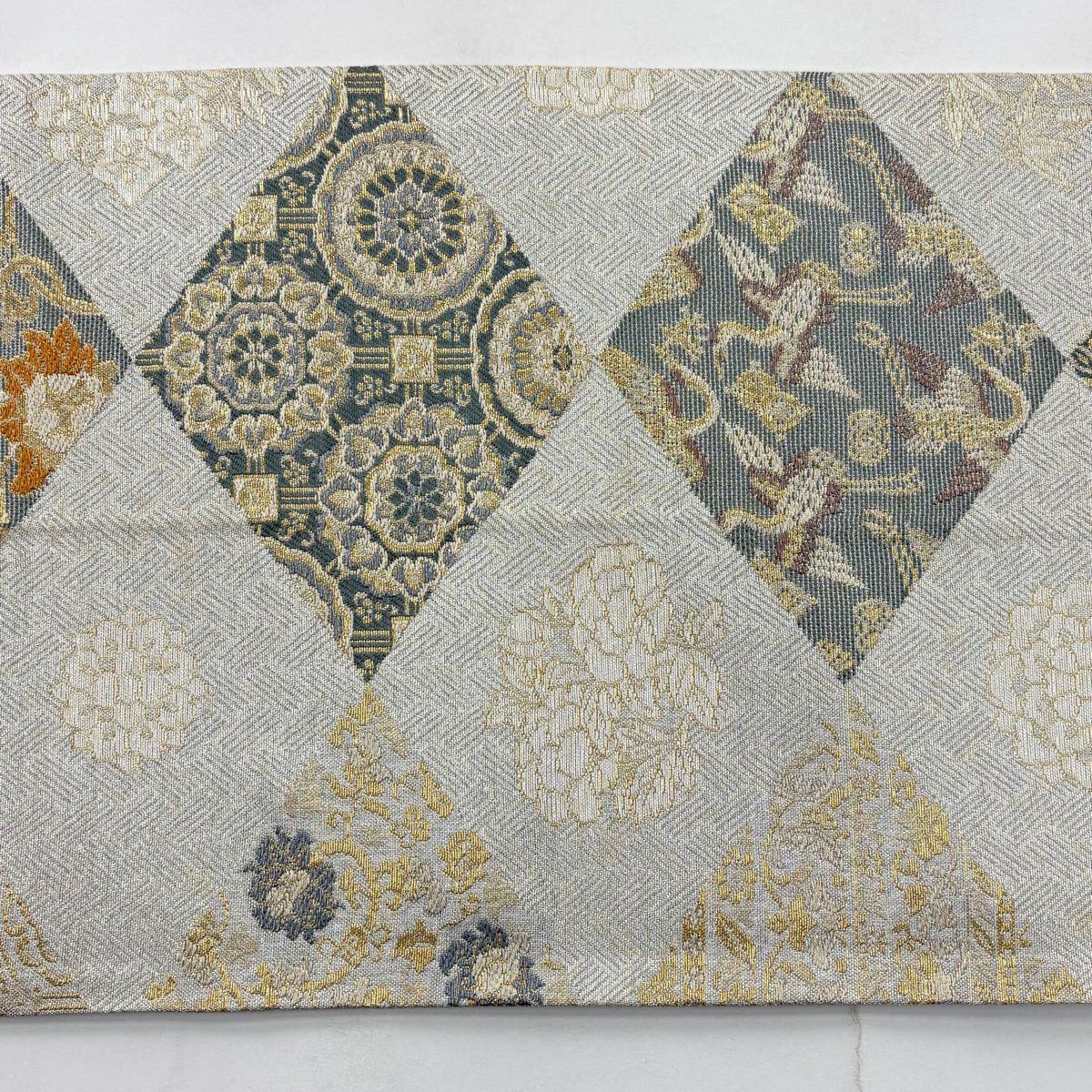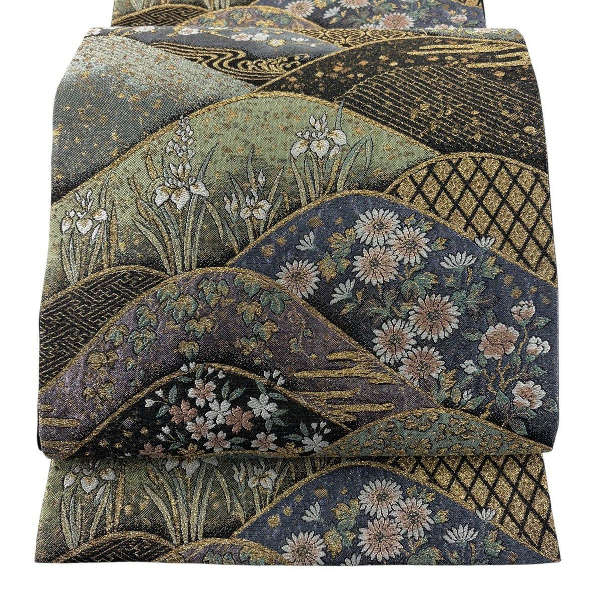 袋帯 秀品 草花 斜格子 金銀糸 箔 青灰色 六通 正絹