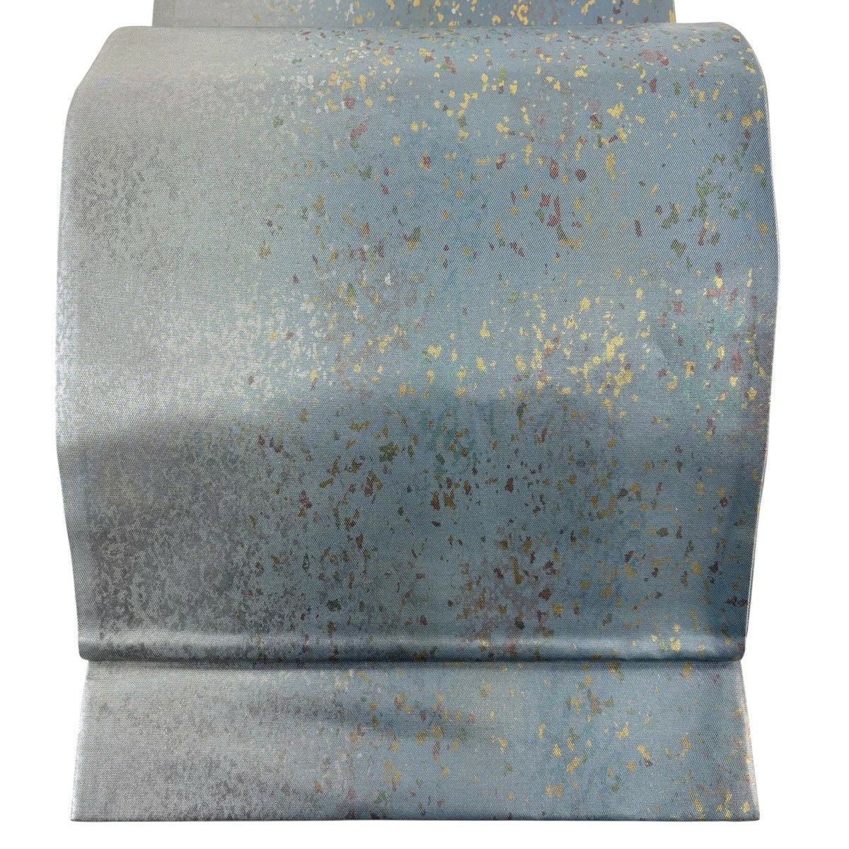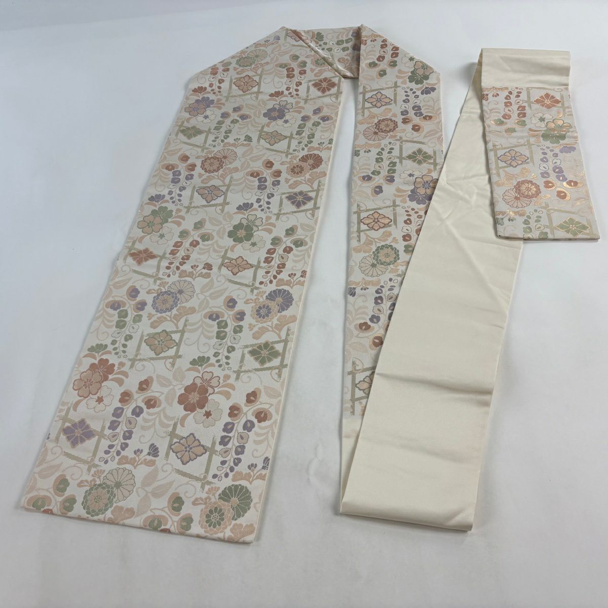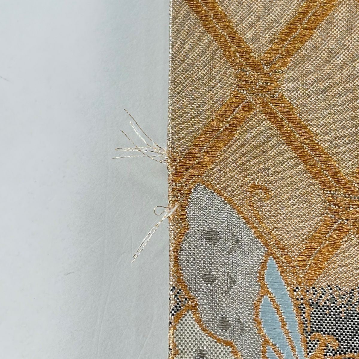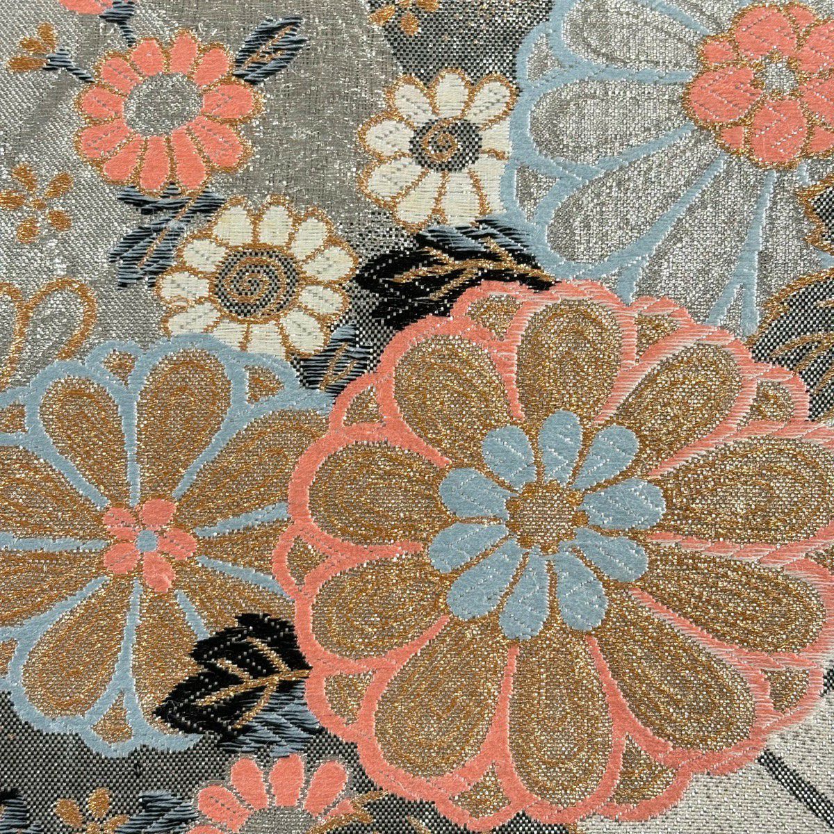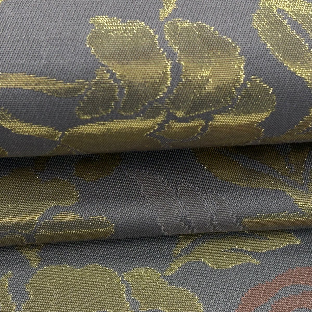 袋帯 秀品 草花 斜格子 金銀糸 箔 青灰色 六通 正絹