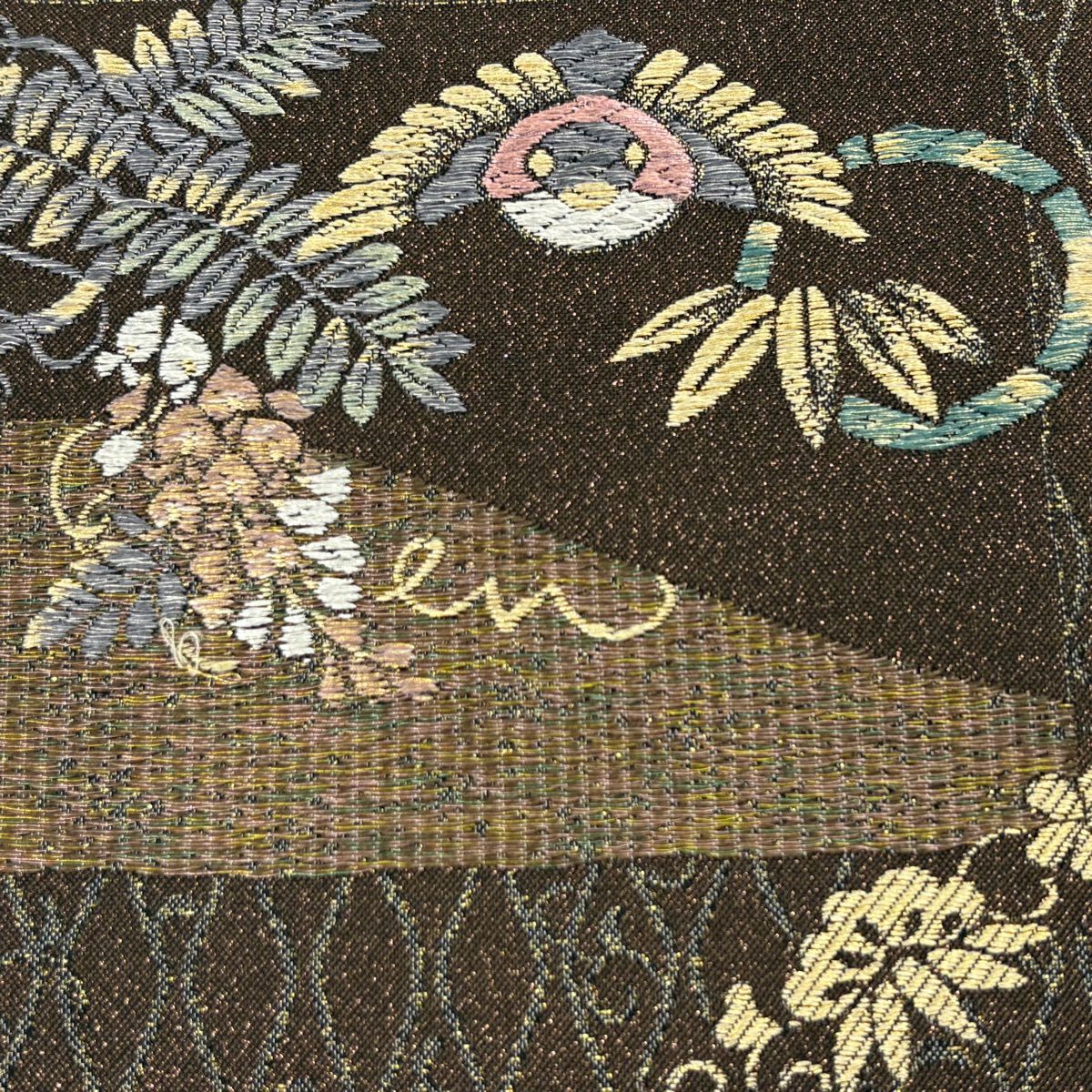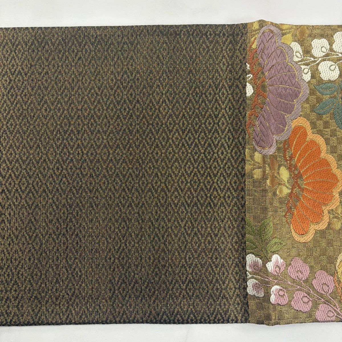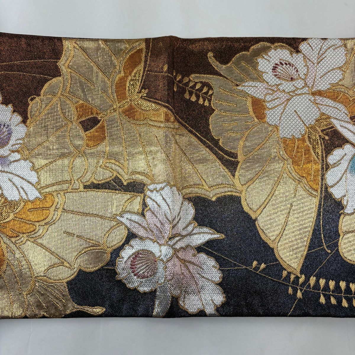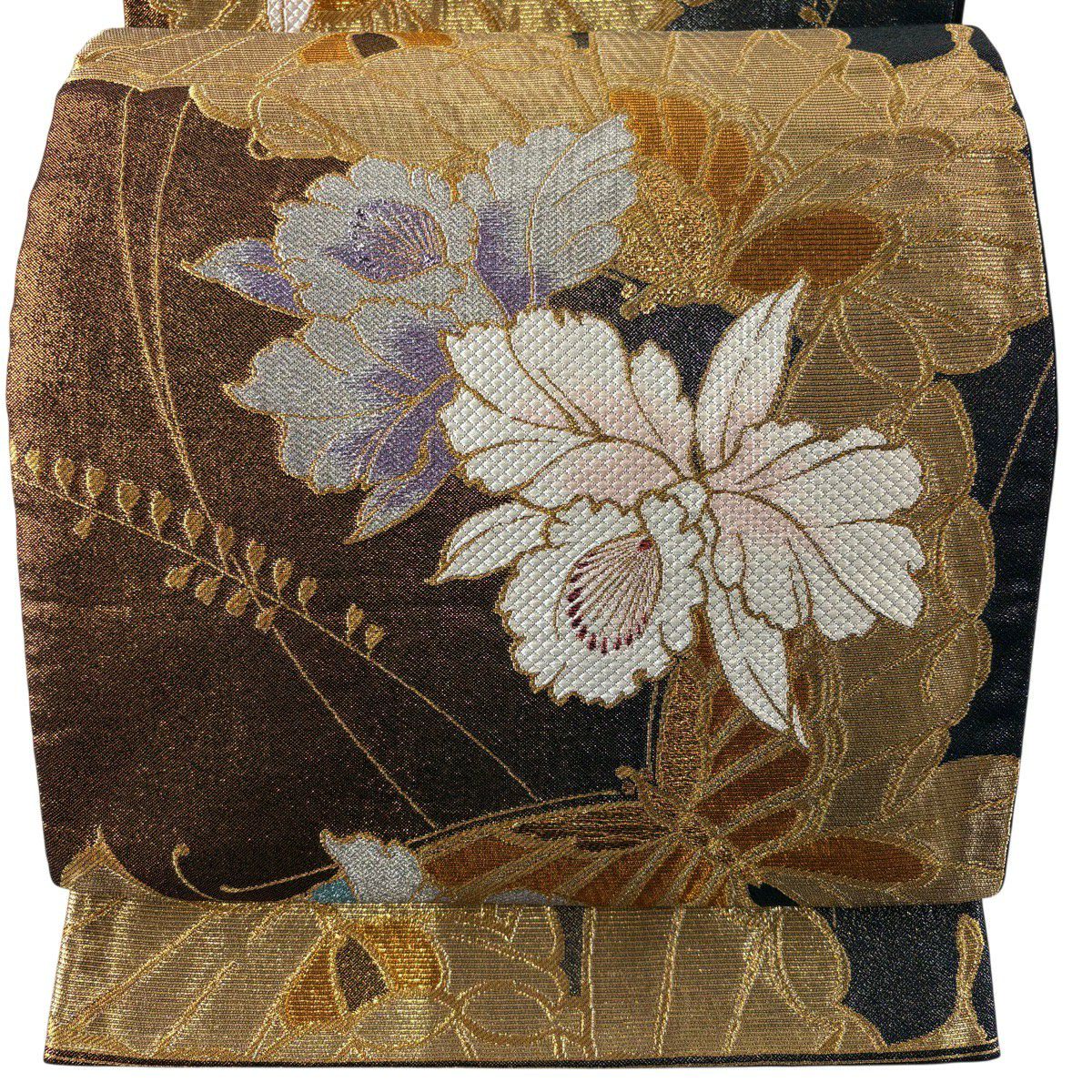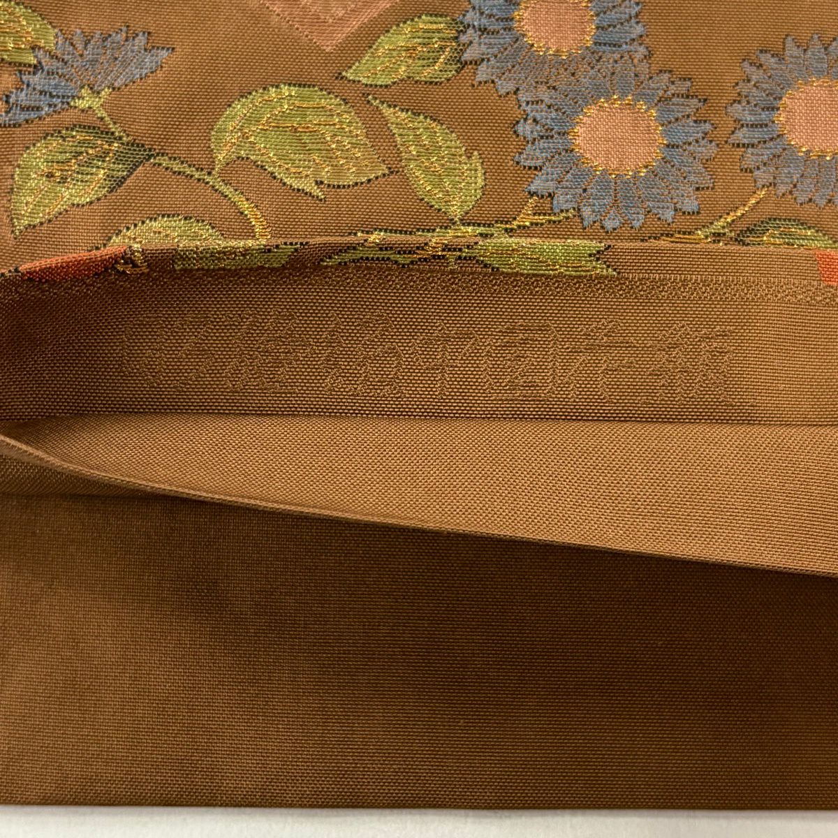 【美品】 袋帯 秀品 花器 草花 金糸 茶色 六通 正絹