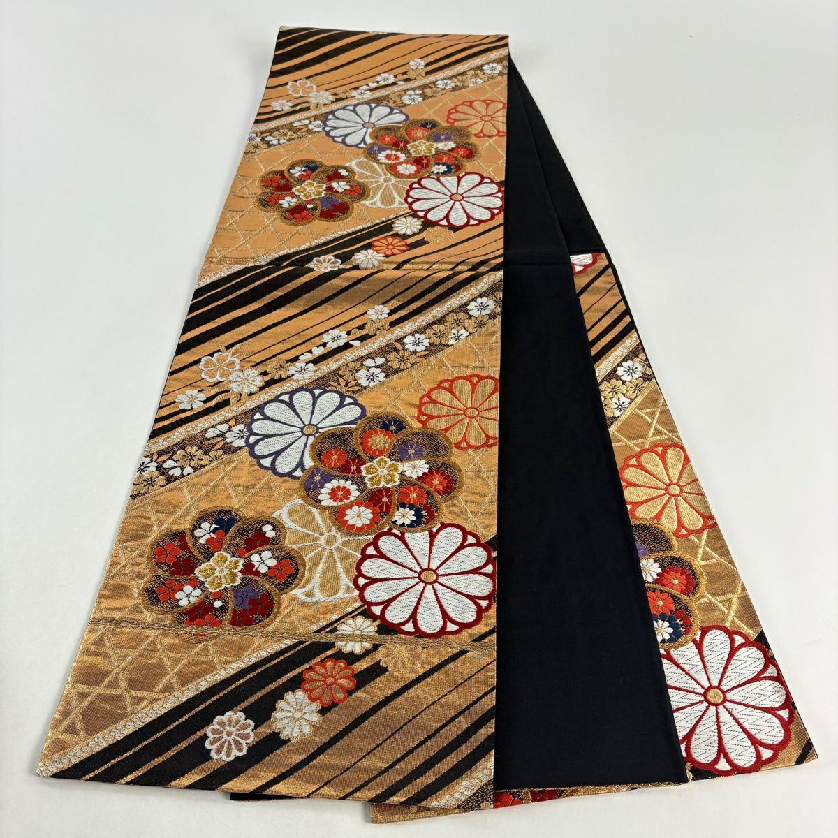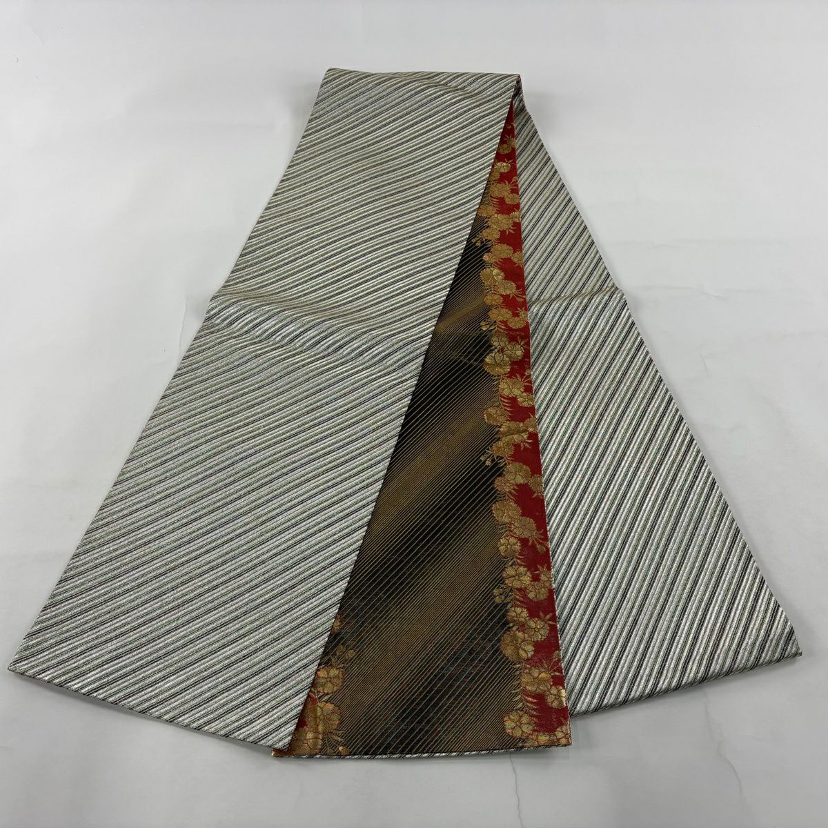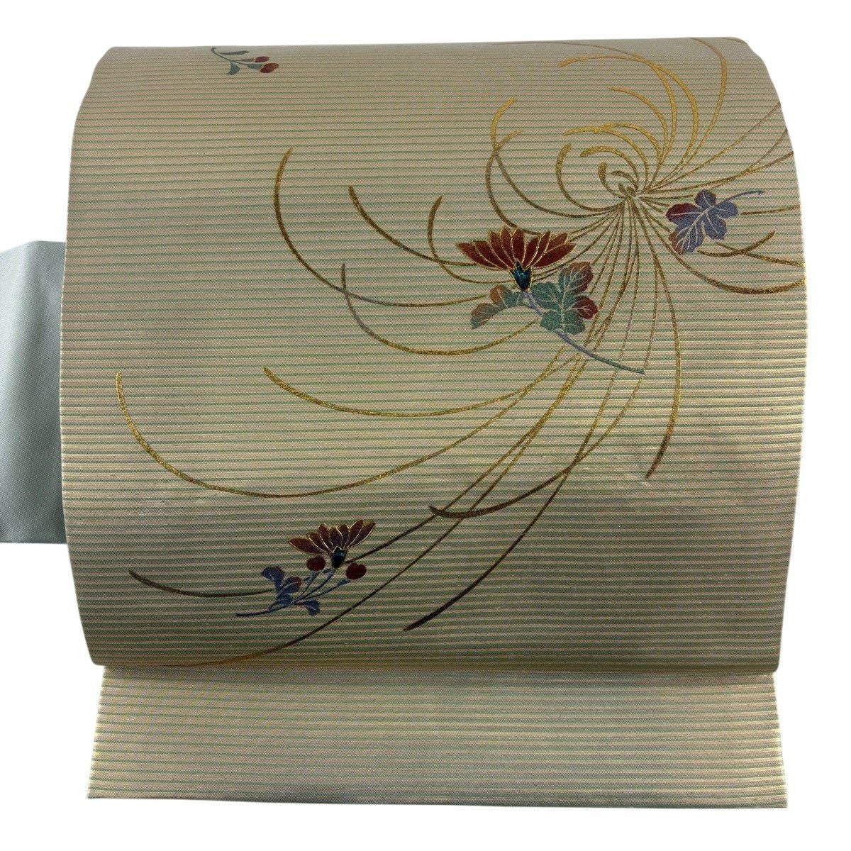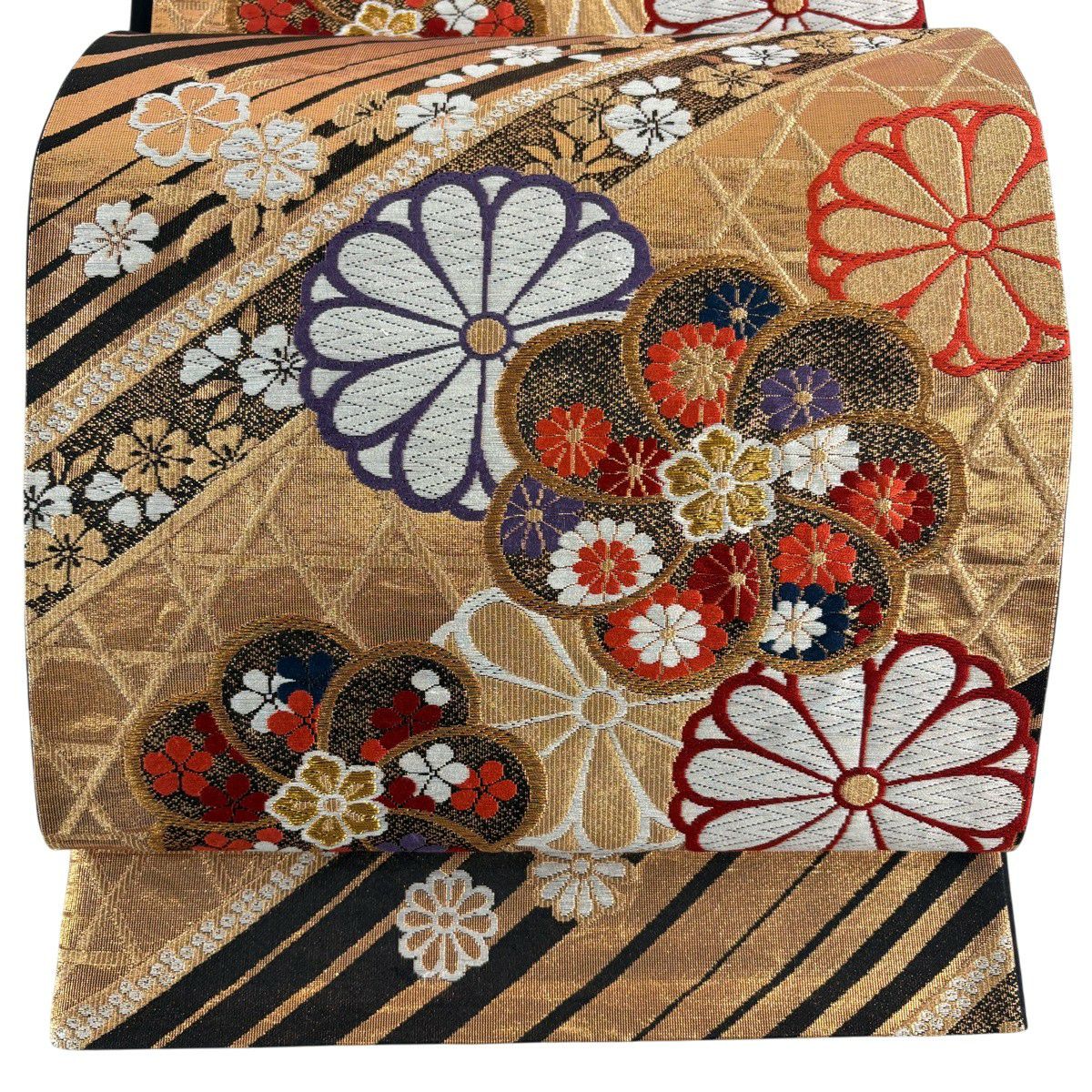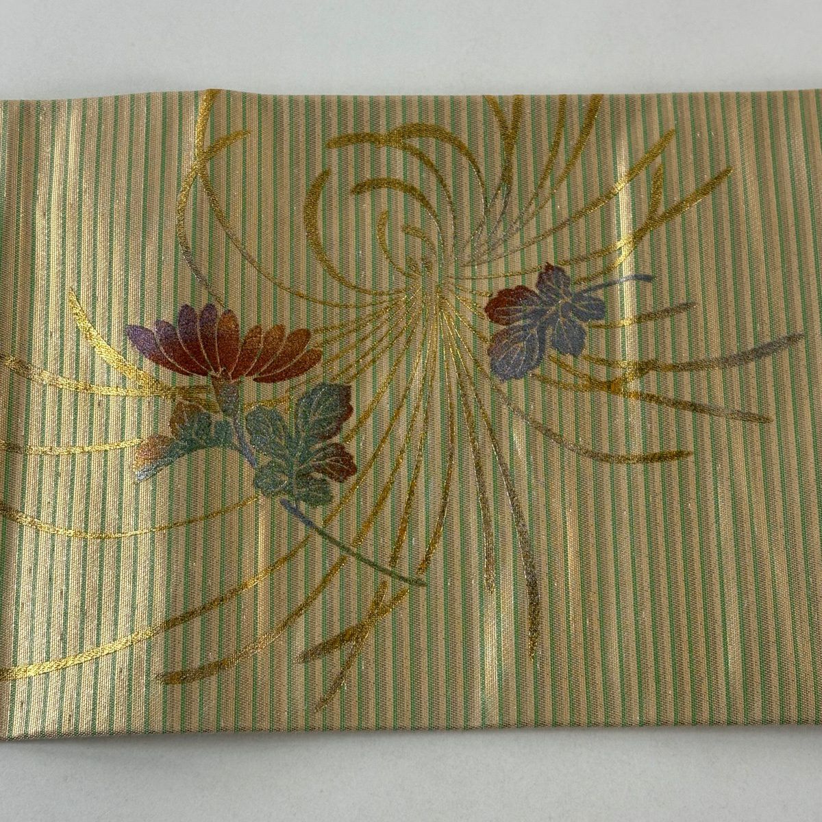 【美品】 名古屋帯 秀品 菊 縞 螺鈿 金銀彩 金色 正絹