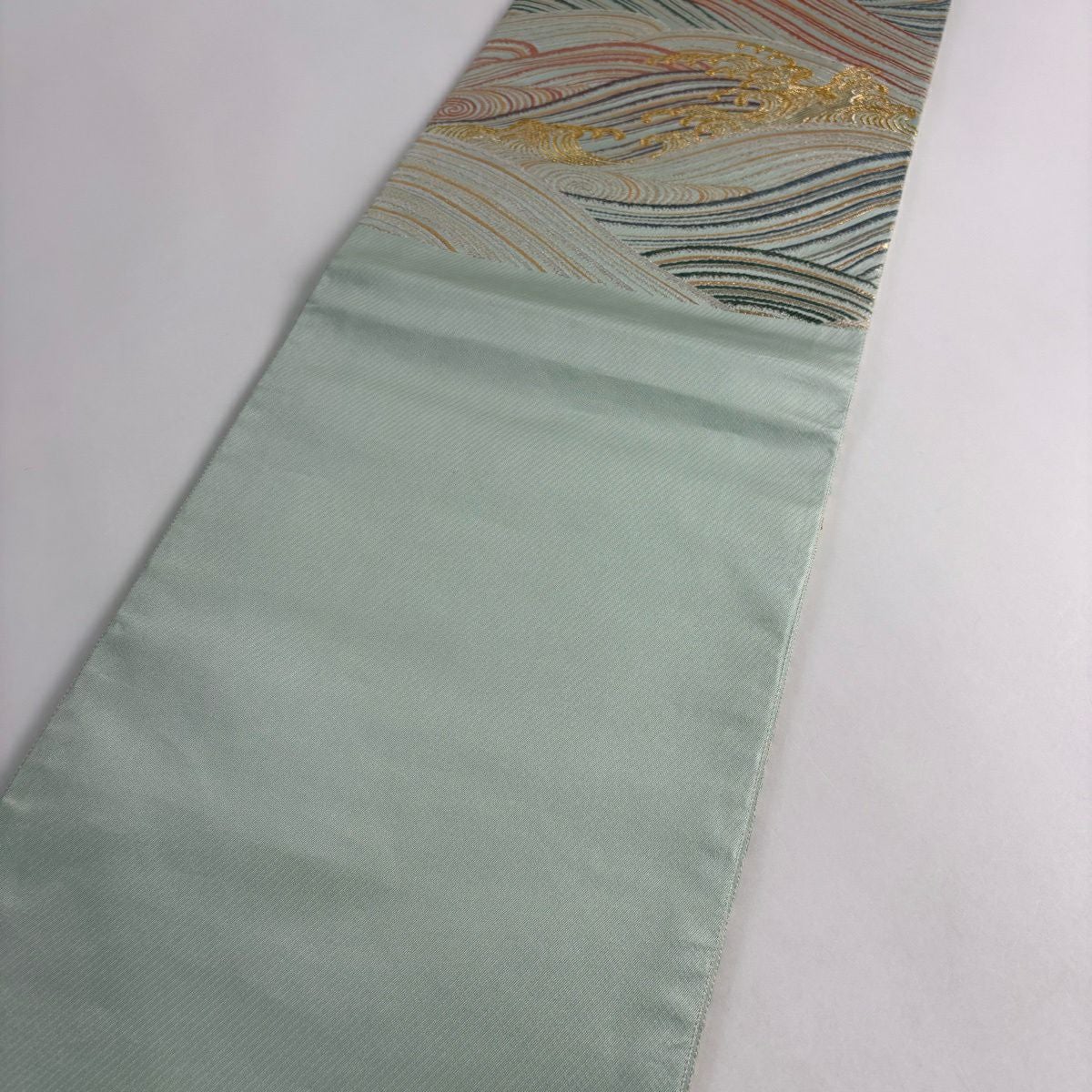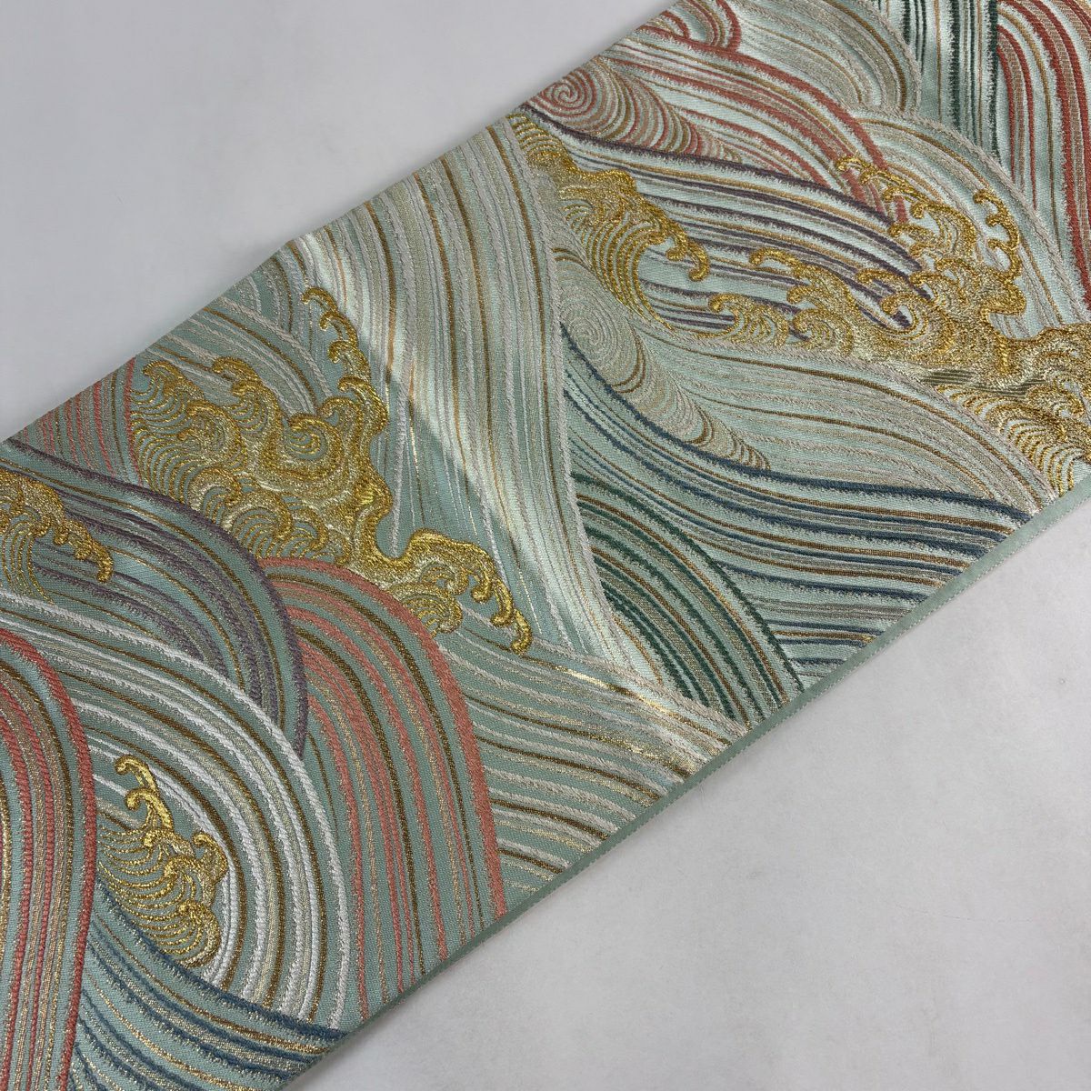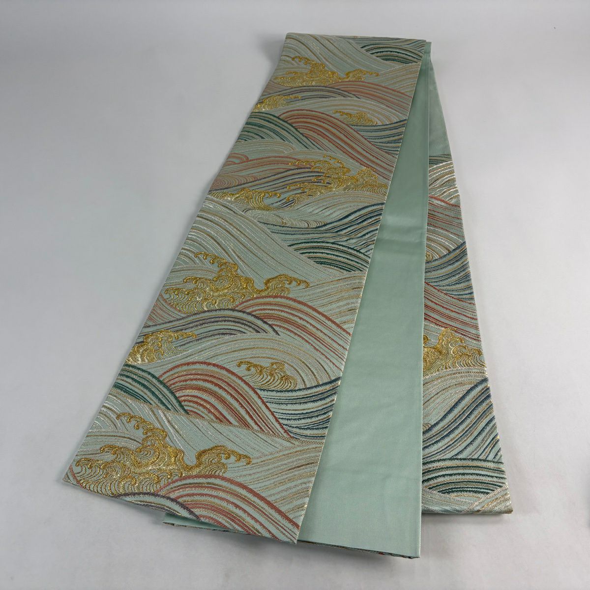 【美品】 袋帯 秀品 波頭 金糸 刺繍 薄緑 六通 正絹