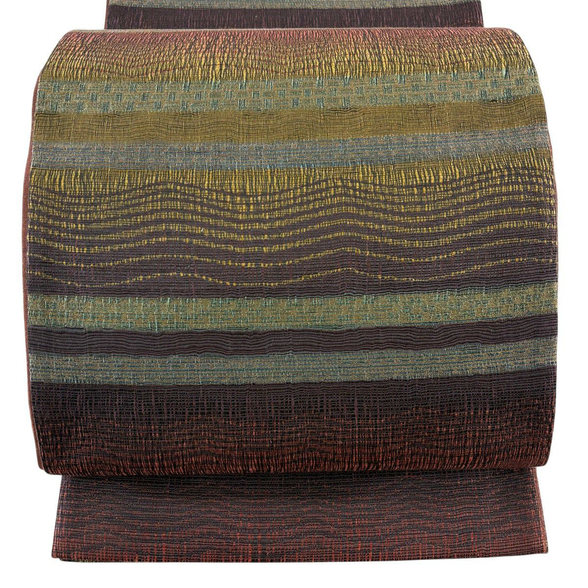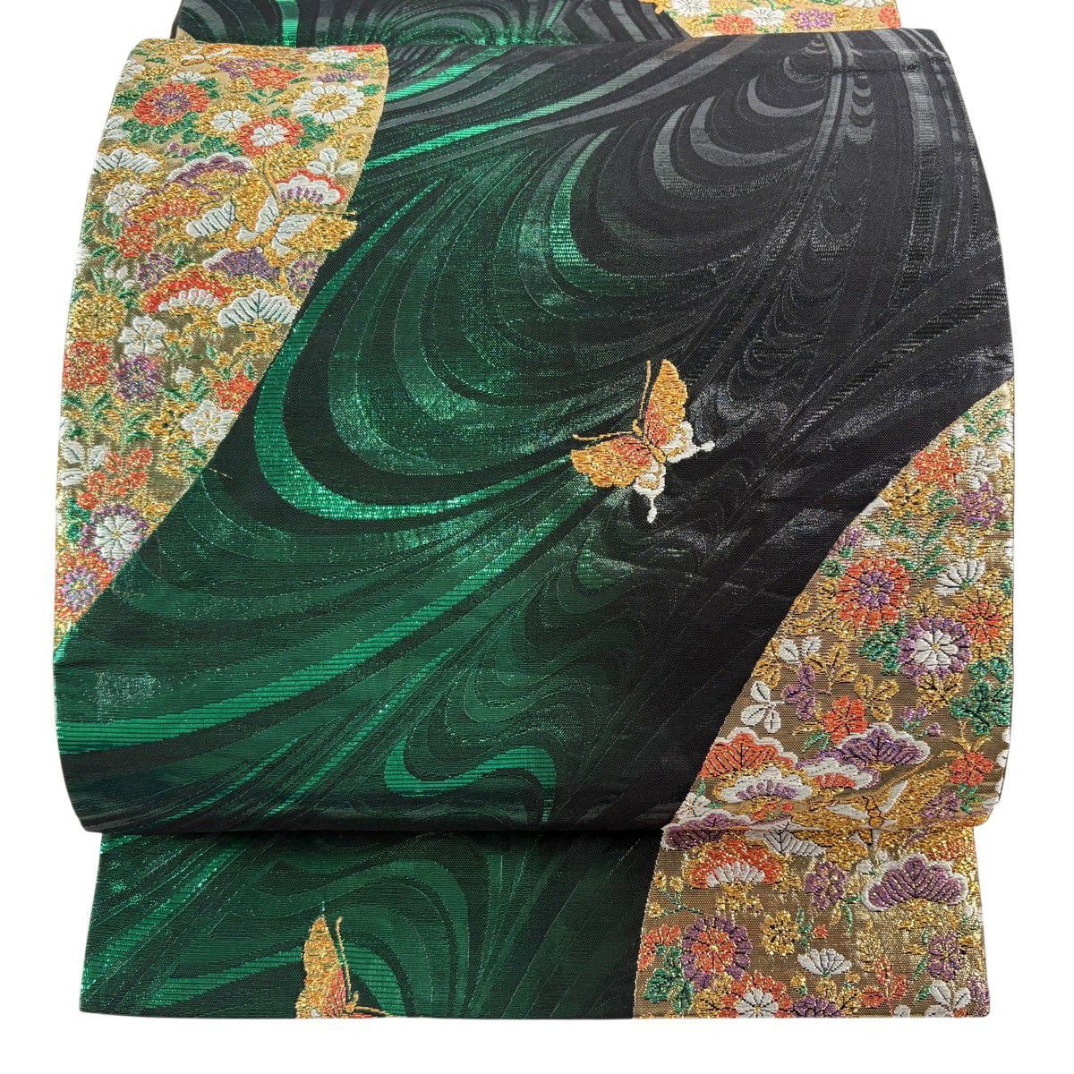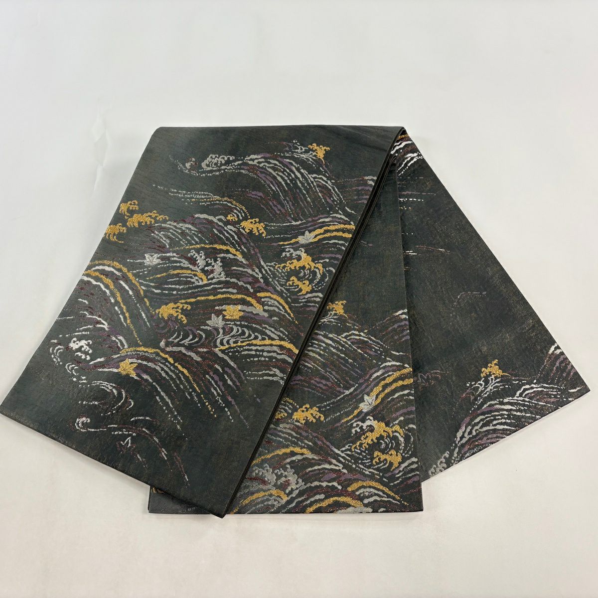 【美品】 袋帯 秀品 流水 金糸 箔 茶緑色 六通 正絹