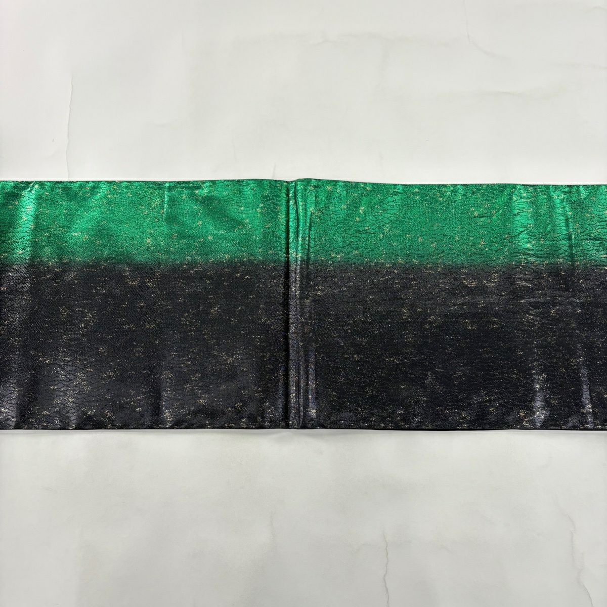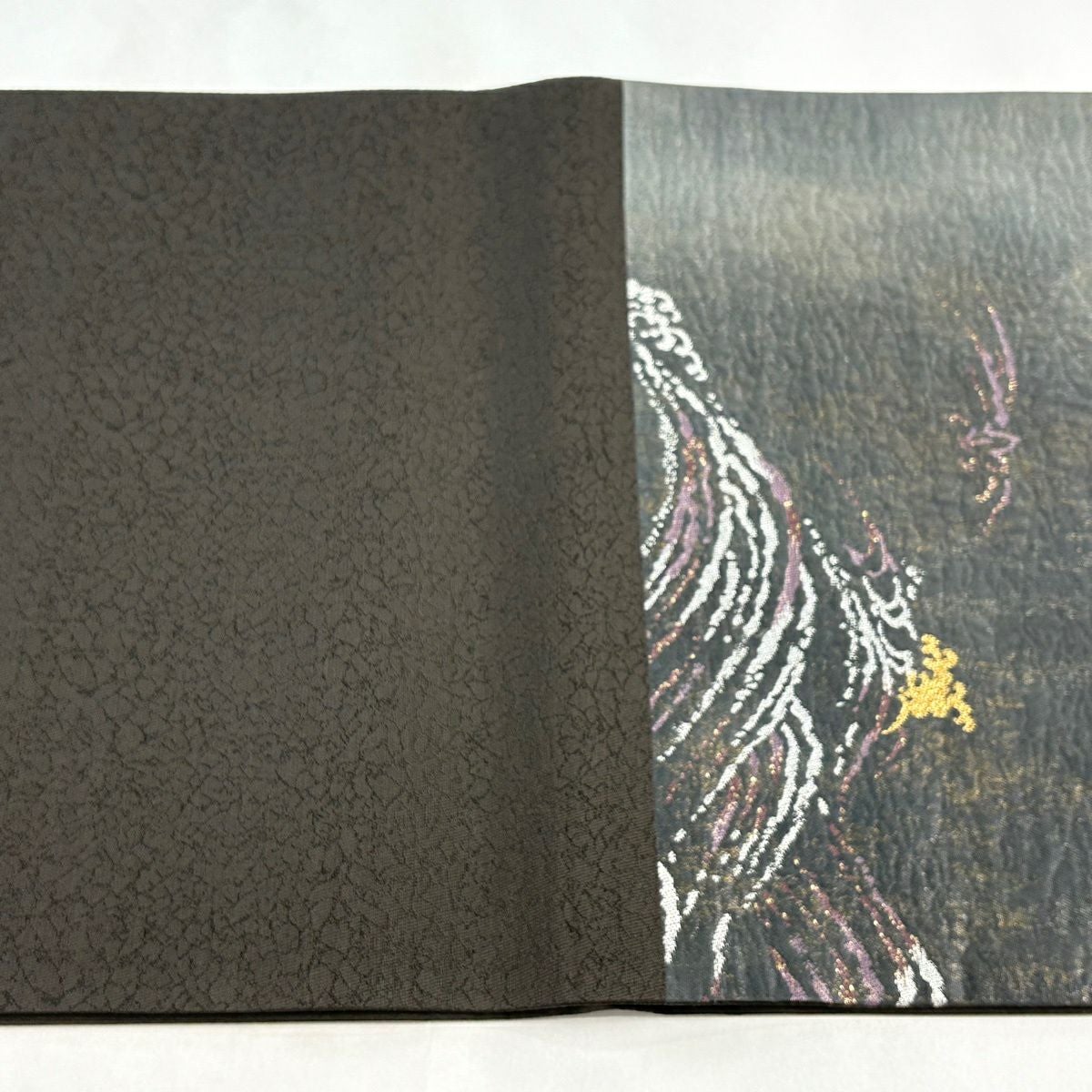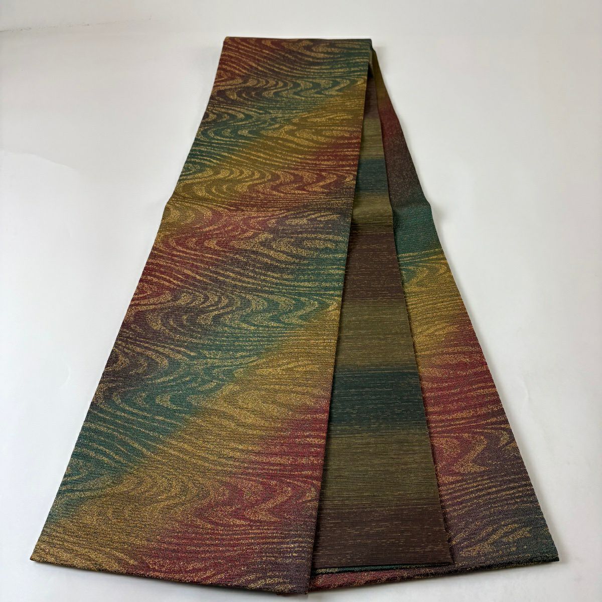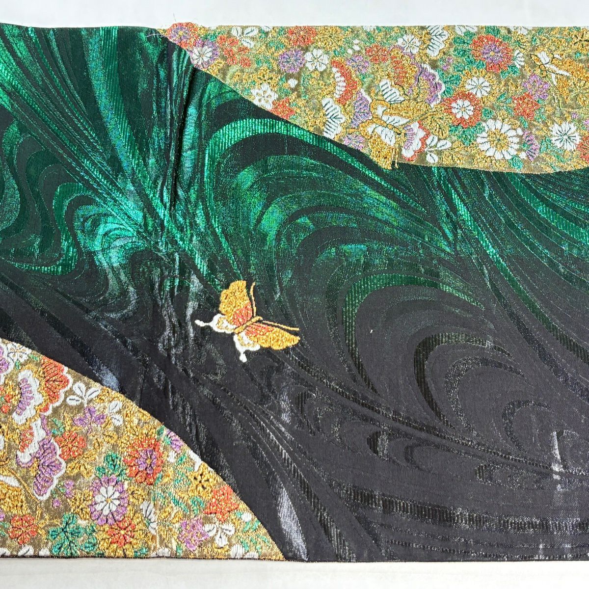 【美品】 袋帯 秀品 流水 金糸 箔 茶緑色 六通 正絹