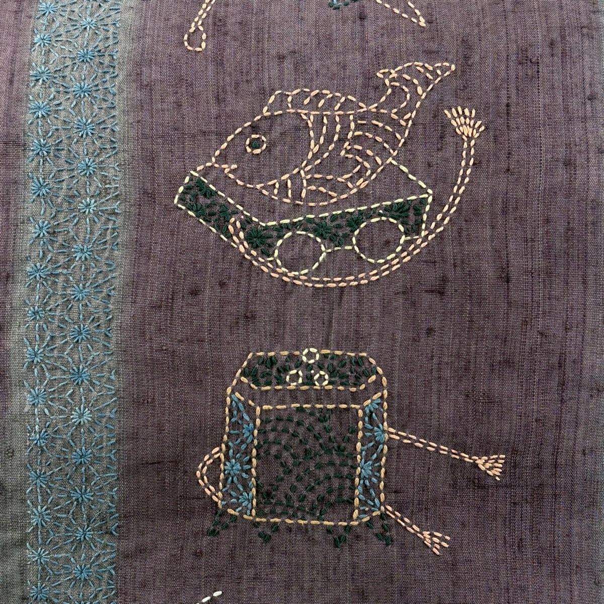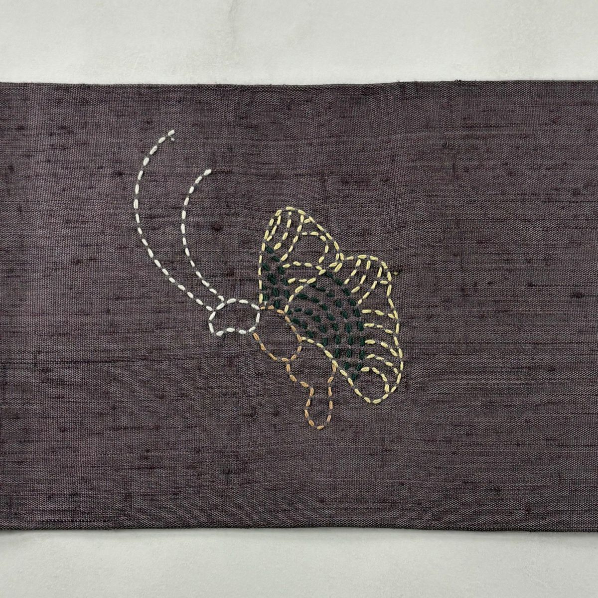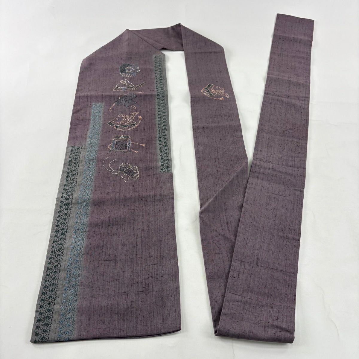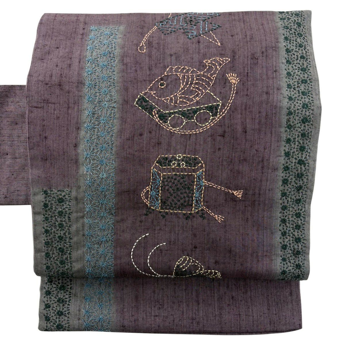名古屋帯 秀品 紬地 玩具 麻の葉 刺し子刺繍 紫 正絹